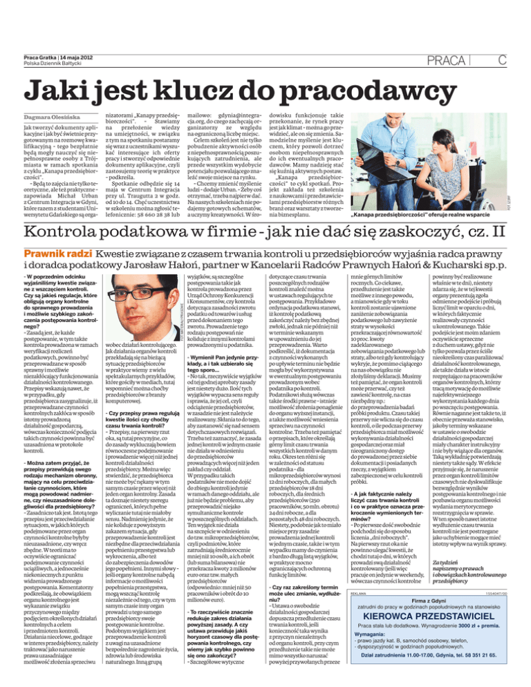 Praca Gratka | 14 maja 2012 Polska Dziennik Bałtycki C PRACA Dagmara Olesińska Jak tworzyć dokumenty aplikacyjne i jak być świetnie przygotowanym na rozmowę kwalifikacyjną - tego bezpłatnie będą mogły nauczyć się niepełnosprawne osoby z Trójmiasta w ramach spotkania z cyklu „Kanapa przedsiębiorczości”. - Będą to zajęcia nie tylko teoretyczne, ale też praktyczne zapowiada Michał Urban z Centrum Integracja w Gdyni, które razem z studentami Uniwersytetu Gdańskiego są orga- mailowo: [email protected], do czego zachęcają organizatorzy ze względu na ograniczoną liczbę miejsc. Celem szkoleń jest nie tylko pobudzenie aktywności osób z niepełnosprawnością poszukujących zatrudnienia, ale przede wszystkim wydobycie potencjału pozwalającego znaleźć swoje miejsce na rynku. - Chcemy zmienić myślenie ludzi - dodaje Urban. - Żeby coś otrzymać, trzeba najpierw dać. Na naszych szkoleniach nie podajemy gotowych schematów, a uczymy kreatywności. W śro- nizatorami „Kanapy przedsiębiorczości”. - Stawiamy na przełożenie wiedzy na umiejętności, w związku z tym na spotkaniu postaramy się wraz z uczestnikami wyszukać interesujące ich oferty pracy i stworzyć odpowiednie dokumenty aplikacyjne, czyli zastosujemy teorię w praktyce - podkreśla. Spotkanie odbędzie się 14 maja w Centrum Integracja przy ul. Traugutta 2 w godz. od 10 do 14. Chęć uczestnictwa w szkoleniu można zgłosić telefonicznie: 58 660 28 38 lub dowisku funkcjonuje takie przekonanie, że rynek pracy jest jak klimat - można go przewidzieć, ale on się zmienia. Samodzielne myślenie jest kluczem, który pozwoli dotrzeć osobom niepełnosprawnych do ich ewentualnych pracodawców. Mamy nadzieję stać się kuźnią aktywnych postaw. „Kanapa przedsiębiorczości” to cykl spotkań. Projekt zakłada też szkolenia z naukowcami i przedstawicielami przedsiębiorstw różnych branż oraz warsztaty z tworzenia biznesplanu. FOT.123RF Jaki jest klucz do pracodawcy „Kanapa przedsiębiorczości” oferuje realne wsparcie Kontrola podatkowa w firmie - jak nie dać się zaskoczyć, cz. II Prawnik radzi Kwestie związane z czasem trwania kontroli u przedsiębiorców wyjaśnia radca prawny i doradca podatkowy Jarosław Hałoń, partner w Kancelarii Radców Prawnych Hałoń & Kucharski sp.p. - Zasadą jest, że każde postępowanie, w tym także kontrola prowadzona w ramach weryfikacji rozliczeń podatkowych, powinno być przeprowadzane wsposób sprawny i możliwie niezakłócający funkcjonowania działalności kontrolowanego. Przepisy wskazują nawet, że w przypadku, gdy przedsiębiorca zasygnalizuje, iż przeprowadzane czynności kontrolnych zakłóca w sposób istotny prowadzoną działalność gospodarczą, wówczas konieczność podjęcia takich czynności powinna być uzasadniona wprotokole kontroli. - Można zatem przyjąć, że przepisy przewidują swego rodzaju mechanizm obronny, mający na celu przeciwdziałanie czynnościom, które mogą powodować nadmierne, czy nieuzasadnione dolegliwości dla przedsiębiorcy? - Zasadniczo tak jest. Istotą tego przepisu jest przeciwdziałanie sytuacjom, w jakich których podejmowane przez organ czynności kontrolne byłyby nieuzasadnione, czy wręcz zbędne. Wteorii ma to oczywiście ograniczać podejmowanie czynności uciążliwych, ajednocześnie niekoniecznych z punktu widzenia prowadzonego postępowania. Komentatorzy podkreślają, że obowiązkiem organu kontrolnego jest wykazanie związku przyczynowego między podjęciem określonych działań kontrolnych a celem i przedmiotem kontroli. Działania niecelowe, godzące w interes przedsiębiorcy, należy traktować jako naruszenie prawa uzasadniające możliwość złożenia sprzeciwu FOT.MATERIAŁYPRASOWE - W poprzednim odcinku wyjaśniliśmy kwestie związane z wszczęciem kontroli. Czy są jakieś regulacje, które obligują organy kontrolne do sprawnego prowadzenia i możliwie szybkiego zakończenia postępowania kontrolnego? wobec działań kontrolującego. Jak działania organów kontroli przekładają się nabieżącą sytuację przedsiębiorców w praktyce wiemy z wielu spektakularnych przykładów, które gościły wmediach, tutaj wspomnieć można choćby przedsiębiorców z branży komputerowej. - Czy przepisy prawa regulują kwestie ilości czy choćby czasu trwania kontroli? - Przepisy, napierwszy rzut oka, są tutaj precyzyjne, co dozasady wykluczają bowiem równoczesne podejmowanie i prowadzenie więcej niż jednej kontroli działalności przedsiębiorcy. Można więc stwierdzić, że przedsiębiorca nie może być nękany wtym samym czasie przez więcej niż jeden organ kontrolny. Zasada ta doznaje niestety szeregu ograniczeń, których pełne wyliczanie tutaj nie miałoby sensu. Nadmienię jedynie, że nie koliduje zpowyższym zakazem sytuacja, gdy przeprowadzenie kontroli jest niezbędne dla przeciwdziałania popełnieniu przestępstwa lub wykroczenia, albo też dozabezpieczenia dowodów jego popełnieni. Innymi słowy jeśli organy kontrolne nabędą informacje omożliwości popełnienia przestępstwa, mogą wszcząć kontrolę niezależnie odtego, czy w tym samym czasie inny organ prowadzi u tego samego przedsiębiorcy swoje postępowanie kontrolne. Podobnym wyjątkiem jest przeprowadzenie kontroli zuwagi nauzasadnione bezpośrednie zagrożenie życia, zdrowia lub środowiska naturalnego. Inną grupą wyjątków, są szczególne postępowania takie jak kontrola prowadzona przez Urząd Ochrony Konkurencji i Konsumentów, czy kontrola dotycząca zasadności zwrotu podatku od towarów iusług przeddokonaniem tego zwrotu. Prowadzenie tego rodzaju postępowań nie koliduje zinnymi kontrolami prowadzonymi upodatnika. - Wymienił Pan jedynie przykłady, a i tak uzbierało się tego sporo… - No tak, rzeczywiście wyjątków odtej godnej aprobaty zasady jest niestety dużo. Ilość tych wyjątków wypacza sens reguły i sprawia, że jej cel, czyli odciążenie przedsiębi