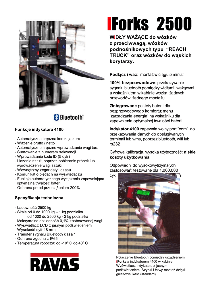 WiDŁY WAŻĄCE do wózków z przeciwwagą, wózków podnośnikowych typu “REACH TRUCK” oraz wózków do wąskich korytarzy. Podłącz i waż: montaż w ciągu 5 minut! 100% bezprzewodowe: przekazywanie sygnału bluetooth pomiędzy widłami ważącymi a wskaźnikiem w kabinie wózka, żadnych przewodów, żadnego montażu Zintegrowane pakiety baterii dla bezprzewodowego komfortu; menu ‘zarządzania energią’ na wskaźniku dla zapewnienia optymalnej trwałości baterii Funkcje indykatora 4100 - Automatyczna i ręczna korekcja zera - Ważenie brutto / netto - Automatyczne i ręczne wprowadzanie wagi tara - Sumowanie z numerem sekwencji - Wprowadzanie kodu ID (5 cyfr) - Liczenie sztuk, poprzez pobieranie próbek lub wprowadzenie wagi sztuki - Wewnętrzny zegar daty i czasu - Komunikat o błędach na wyświetlaczu - Funkcja automatycznego wyłączenia zapewniająca optymalna trwałość baterii - Ochrona przed przeciążeniem 200% Indykator 4100 zapewnia wolny port “com” do przekazywania danych do obsługiwanych terminali lub wms, poprzez bluetooth, wifi lub rs232 Cyfrowa kalibracja, wysoka użyteczność: niskie koszty użytkowania Odpowiedni do wysokowytrzymałych zastosowań: testowane dla 1.000.000 cykli dynamicznych przy 125% nośności Specyfikacja techniczna - Ładowność 2500 kg - Skala od 0 do 1000 kg – 1 kg podziałka od 1000 do 2500 kg - 2 kg podziałka - Maksymalna dokładność 0,1% zastosowanej wagi - Wyświetlacz LCD z jasnym podświetleniem - Wysokość cyfr 18 mm - Transfer sygnału Bluetooth klasa 1 - Ochrona zgodna z IP65 - Temperatura robocza: od -10º C do 40º C Połączenie Bluetooth pomiędzy urządzeniem iForks a indykatorem 4100 w kabinie Wyświetlacz indykatora z jasnym podświetleniem. Szybki i łatwy montaż dzięki gnieździe RAM (standard) Wymiary [mm] iForks 2500 A B C D E F G H I Długość wideł Szerokość wideł Wysokość wideł, maksymalna Wysokość nośna Skok wideł * Szerokość podstawy wideł Szerokość pakietu baterii Szerokość wideł łącznie z pakietem baterii Wysokość całkowita Waga jednego widelca FEM II A/B* :1150 :133 :58 :407 :76/152 :100 :55 :155 :550 :67 [kg] Tolerancje ± 2mm * należy podać przy zamówieniu Porównanie Szerokość wideł Wysokość wideł Standard FEM 2 lift widły do wózków B = 100 mm C = 45 mm RAVAS iForks 2500 133 mm 58 mm Przekazywanie danych: Indykator 4100 oferuje jeden z trzech następujących opcjonalnych typów komunikacji: do drukowania oraz do stałej lub dwukierunkowej komunikacji. Dostępne opcjonalnie: SIR Przenośny interfejs oprogramowania, do zainstalowania w każdym terminalu Łatwy do wymiany, ergonomiczny i wytrzymały pakiet danych Windows Mobile 5.0 lub Windows CE 5.0 lub baterii na każdym z wideł, zawierający 4 ogniwa D. PDA. W celu bezpośredniej komunikacji z oraz Baterie wielokrotnego ładowania wraz z ładowarką baterii bezprzewodowej obsługi wagi RAVAS. są dostępne opcjonalnie. Zasilanie: Wskaźnik zasilany 4 bateriami AA. System wyposażony jest w funkcję automatycznego wyłączenia zapewniający optymalną trwałość baterii. Operator może dostosować ustawienia tej funkcji do własnych potrzeb w menu wskaźnika ‘Zarządzanie energią'. PROGRESS WAGOTRONIC S.A. RAVAS Europe B.V. 40-847 Katowice ul. Pukowca 15A P.O. Box 2023 NL-5300 CA Zaltbommel tel.: +48 32/ 254 42 87, 201 53 84 The Netherlands www.ravas.com www.wagi.pl Opcje: - Przekazywanie danych ze wskaźnika - Bluetooth klasa 1 - WiFi, połączone ze stałym zasilaniem 12V - złącze RS232 - Przenośne oprogramowanie RAVAS SIR do Windows CE i Mobil, połączone z przekazywaniem danych Bluetooth - Elektroniczna korekta poziomu do 5º odchylenia masztu - Drukarki - Oddzielna drukarka termiczna poprzez połączenie przewodowe RS-232 - Pakiet baterii wielokrotnego ładowania oraz ładowarka wideł ważących - Zasilanie wskaźnika z baterii wózka poprzez przetwornik X-12V - Specjalna długość wideł, na życzenie - Większa ładowność: 3000 - 5000 kg, FEM 3 A/B - 12 - 12 V regulator dla zasilania prądem stałym dla wózków IC