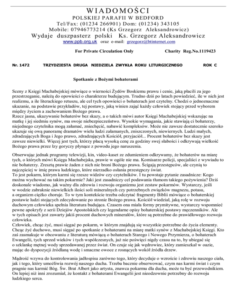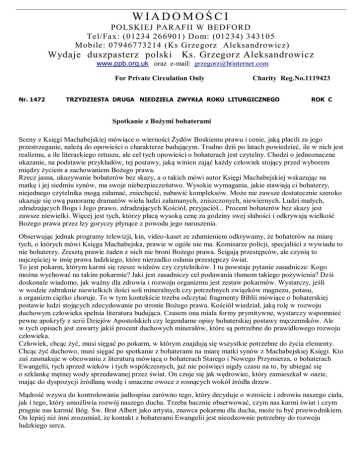 WIADOMOŚCI POLSKIEJ PARAFII W BEDFORD Tel/Fax: (01234 266901) Dom: (01234) 343105 Mobile: 07946773214 (Ks Grzegorz Aleksandrowicz) Wydaje duszpasterz polski Ks. Grzegorz Aleksandrowicz www.ppb.org.uk oraz e-mail: [email protected] For Private Circulation Only Nr. 1472 Charity Reg.No.1119423 TRZYDZIESTA DRUGA NIEDZIELA ZWYKŁA ROKU LITURGICZNEGO ROK C Spotkanie z Bożymi bohaterami Sceny z Księgi Machabejskiej mówiące o wierności Żydów Boskiemu prawu i cenie, jaką płacili za jego przestrzeganie, należą do opowieści o charakterze budującym. Trudno dziś po latach powiedzieć, ile w nich jest realizmu, a ile literackiego retuszu, ale cel tych opowieści o bohaterach jest czytelny. Chodzi o jednoznaczne ukazanie, na podstawie przykładów, tej postawy, jaką winien zająć każdy człowiek stojący przed wyborem między życiem a zachowaniem Bożego prawa. Rzecz jasna, ukazywanie bohaterów bez skazy, a o takich mówi autor Księgi Machabejskiej wskazując na matkę i jej siedmiu synów, ma swoje niebezpieczeństwo. Wysokie wymagania, jakie stawiają ci bohaterzy, niejednego czytelnika mogą załamać, zniechęcić, nabawić kompleksów. Może nie zawsze dostatecznie szeroko ukazuje się ową panoramę dramatów wielu ludzi załamanych, zniszczonych, niewiernych. Ludzi małych, zdradzających Boga i Jego prawo, zdradzających Kościół, przyjaciół... Procent bohaterów bez skazy jest zawsze niewielki. Więcej jest tych, którzy płacą wysoką cenę za godziny swej słabości i odkrywają wielkość Bożego prawa przez łzy goryczy płynące z powodu jego naruszenia. Obserwując jednak programy telewizji, kin, video-kaset ze zdumieniem odkrywamy, że bohaterów na miarę tych, o których mówi Księga Machabejska, prawie w ogóle nie ma. Komisarze policji, specjaliści z wywiadu to nie bohaterzy. Zresztą prawie żaden z nich nie broni Bożego prawa. Ścigają przestępców, ale czynią to najczęściej w imię prawa ludzkiego, które nierzadko osłania przestępczy świat. To jest pokarm, którym karmi się rzesze widzów czy czytelników. I tu powstaje pytanie zasadnicze: Kogo można wychować na takim pokarmie? Jaki jest zasadniczy cel podawania tłumom takiego pożywienia? Dziś doskonale wiadomo, jak ważny dla zdrowia i rozwoju organizmu jest zestaw pokarmów. Wystarczy, jeśli w wodzie zabraknie niewielkich ilości soli mineralnych czy potrzebnych związków magnezu, potasu, a organizm ciężko choruje. To w tym kontekście trzeba odczytać fragmenty Biblii mówiące o bohaterskiej postawie ludzi stojących zdecydowanie po stronie Bożego prawa. Kościół wiedział, jaką rolę w rozwoju duchowym człowieka spełnia literatura budująca. Czasem ona miała formy prymitywne, wystarczy wspomnieć pewne apokryfy z serii Dziejów Apostolskich czy legendarne opisy bohaterskiej postawy męczenników. Ale w tych opisach jest zawarty jakiś procent duchowych minerałów, które są potrzebne do prawidłowego rozwoju człowieka. Człowiek, chcąc żyć, musi sięgać po pokarm, w którym znajdują się wszystkie potrzebne do życia elementy. Chcąc żyć duchowo, musi sięgać po spotkanie z bohaterami na miarę matki synów z Machabejskiej Księgi. Kto zaś zasmakuje w obcowaniu z literaturą mówiącą o bohaterach Starego i Nowego Przymierza, o bohaterach Ewangelii, tych sprzed wieków i tych współczesnych, już nie poświęci nigdy czasu na to, by ubiegać się o szklankę mętnej wody sprzedawanej przez świat. On czuje się jak wędrowiec, który zamieszkał w oazie, mając do dyspozycji źródlaną wodę i smaczne owoce z rosnących wokół źródła drzew. Mądrość wzywa do kontrolowania jadłospisu zarówno tego, który decyduje o wzroście i zdrowiu naszego ciała, jak i tego, który umożliwia rozwój naszego ducha. Trzeba bacznie obserwować, czym nas karmi świat i czym pragnie nas karmić Bóg. Św. Brat Albert jako artysta, znawca pokarmu dla ducha, może tu być przewodnikiem. On lepiej niż inni zrozumiał, że kontakt z bohaterami Ewangelii jest nieodzownie potrzebny do rozwoju ludzkiego serca. Niedziela,6.11.2016 Godz. 9.30 Godz.11.00 Godz.18.00 Godz.19.00 Poniedziałek, 7.11.2016 Godz. 9.30 Godz.19.00 Wtorek. 8.11.2016 Godz. 9.30 Godz.19.00 Środa, 9.11.2016 Godz. 9.30 Bazyliki Laterańskiej Godz.19.00 Czwartek,10.11.2016 Godz. 9.30 Św.Leona Wielkiego Godz.19.00 Piątek, 11.11.2016 Godz. 15.00 Narodowe Święto Niepodległości Godz. 19.00 Sobota, 12.11.2016 Godz. 9.30 Św.Jozafata, biskupa i męczennika Godz.19.00 Niedziela,13.11.2016 Godz. 9.30 Godz.11.00 Godz.19.00 Poniedziałek, 14.11.2016 Godz. 9.30 Wtorek, 15.11.2016 Godz. 9.30 Godz.19.00 Środa, 16.11.2016 Godz. 9.30 Czwartek,17.11.2016 Godz. 9.30 Piątek, 18.11.2016 Godz.15.00 Błog. Karoliny Kózkówny Godz.19.00 Sobota, 19.11.2016 Godz. 9.30 Św.Hugh of Lincoln Godz.15.00 Godz.19.00 TRZYDZIESTA DRUGA NIEDZIELA ROKU LITURGICZNEGO Rok C - za dusze w czyśćcu cierpiące z prośbą o łaskę zbawienia - int. Parafian. - za dusze ś.p. zmarłych wymienionych w Wypominkach. - ADORACJA NAJŚWIĘTSZEGO SAKRAMENTU. - za dusze ś.p. zmarłych wymienionych w Wypominkach. - za dusze w czyśćcu cierpiące z prośbą o łaskę zbawienia - int. Parafian. za ś.p. Marcina Piwowarskiego w 10-tą rocznicę śmierci - int.Dariusza z rodziną. - za dusze w czyśćcu cierpiące z prośbą o łaskę zbawienia - int. Parafian. - O uwolnienie dla Darii. - za dusze ś.p. Haliny Trice - int. matki. - za dusze ś.p. Otylii Chmielewskiej - int. córki. - za dusze ś.p. Janiny Goleniewskiej - int. córki z rodziną. - Intencja wolna. - za dusze ś.p. Kazimierza Kwak - int. żony i dzieci. KORONKA DO MIŁOSIERDZIA BOŻEGO. - Intencja wolna. - za dusze ś.p. Mariana Jędrzejczaka i ś.p. rodziców Jana i Marii Szwarcewicz. Adoracja Najśw.Sakramentu. Spowiedź święta. - za dusze ś.p. Artura Marszałek w 1-szą rocznicę śmierci - int. siostry. TRZYDZIESTA TRZECIA NIEDZIELA ROKU LITURGICZNEGO-Rok C - za dusze ś.p. Jan