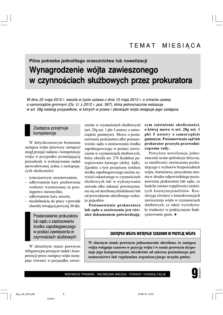TEMAT M I E SPORADY I ¥ PRAWNE CA Pilna potrzeba jednolitego orzecznictwa lub nowelizacji Wynagrodzenie wójta zawieszonego w czynnociach s³u¿bowych przez prokuratora W dniu 22 maja 2012 r. wesz³a w ¿ycie ustawa z dnia 10 maja 2012 r. o zmianie ustawy o samorz¹dzie gminnym (Dz. U. z 2012 r. poz. 567), która jednoznacznie wskazuje w art. 28g katalog przypadków, w których w prawa i obowi¹zki wójta wstêpuje jego zastêpca. W dotychczasowym brzmieniu zastêpca wójta (pierwszy zastêpca) móg³ przej¹æ zadania i kompetencje wójta w przypadku przemijaj¹cej przeszkody w wykonywaniu zadañ spowodowanej jedn¹ z nastêpuj¹cych okolicznoci: tymczasowym aresztowaniem, odbywaniem kary pozbawienia wolnoci wymierzonej za przestêpstwo nieumylne, odbywaniem kary aresztu, niezdolnoci¹ do pracy z powodu choroby trwaj¹cej powy¿ej 30 dni. Postanowienie prokuratora lub s¹du o zastosowaniu rodka zapobiegawczego w postaci zawieszenia w czynnociach s³u¿bowych W aktualnym stanie prawnym obligatoryjne przejêcie zadañ i kompetencji przez zastêpcê wójta nastêpuje równie¿ w przypadku zawie- szeniu w czynnociach s³u¿bowych (art. 28g ust. 1 pkt 5 ustawy o samorz¹dzie gminnym). Mowa o postanowieniu prokuratora albo postanowieniu s¹du o zastosowaniu rodka zapobiegawczego w postaci zawieszenia w czynnociach s³u¿bowych, który okrela art. 276 Kodeksu postêpowania karnego (dalej: kpk). Zgodnie z tym przepisem tytu³em rodka zapobiegawczego mo¿na zawiesiæ oskar¿onego w czynnociach s³u¿bowych lub w wykonywaniu zawodu albo nakazaæ powstrzymanie siê od okrelonej dzia³alnoci lub od prowadzenia okrelonego rodzaju pojazdów. Postanowienie prokuratora lub s¹du o zawieszeniu jest równie¿ dokumentem potwierdzaj¹- cym zaistnienie okolicznoci, o której mowa w art. 28g ust. 1 pkt 5 ustawy o samorz¹dzie gminnym. Postanowienia s¹d lub prokurator przesy³a przewodnicz¹cemu rady. Powy¿sza nowelizacja jednoznacznie ucina spekulacje dotycz¹ce mo¿liwoci zawieszenia pochodz¹cego z wyborów bezporednich wójta, burmistrza, prezydenta miasta w drodze odpowiedniego postanowienia prokuratora lub s¹du, co budzi³o istotne w¹tpliwoci niektórych konstytucjonalistów. Rozstrzyga równie¿ o konsekwencjach zawieszenia wójta w czynnociach s³u¿bowych, co tak¿e wywo³ywa³o trudnoci w praktycznym funkcjonowaniu gmin. ZASTÊPCA WÓJTA WSTÊPUJE CZASOWO W POZYCJÊ WÓJTA W obecnym stanie prawnym jednoznacznie okrelono, ¿e zastêpca wójta wstêpuje czasowo w pozycjê wójta i w sensie prawnym dysponuje jego kompetencjami, niezale¿nie od zakresu posiadanego pe³nomocnictwa lub regulaminu organizacyjnego urzêdu gminy. WSPARCIE PRAWNE - NIEZBÊDNA WIEDZA - PORADY I KONSULTACJE Sas_nr8_2012.p65 9 Czarny 12-08-10, 13:22 9 NR 8/2012 Zastêpca przejmuje kompetencje TEMAT PORADY PRAWNE MIESI¥CA Po³owa wynagrodzenia?! NR 8/2012 Aktualny pozostaje jednak zupe³nie inny problem, a mianowicie dotycz¹cy wynagrodzenia wójta zawieszonego w czynnociach s³u¿bowych w drodze odpowiedniego postanowienia. Warto zwróciæ uwagê, ¿e w przypadku zastosowania rodka zapobiegawczego o ostrzejszym charakterze (wolnociowego), jakim jest tymczasowe aresztowanie, wójt otrzymuje po³owê wynagrodzenia. Zgodnie bowiem z art. 35 ust. 1 i 2 ustawy o pracownikach samorz¹dowych (dalej: ups) stosunek pracy pracownika samorz¹dowego tymczasowo aresztowanego ulega zawieszeniu z mocy prawa i w tym okresie pracownik samorz¹dowy otrzymuje wynagrodzenie w wysokoci po³owy wynagrodzenia przys³uguj¹cego mu do dnia tymczasowego aresztowania. Stosownie do art. 35 ust. 3 ups, w przypadku umorzenia postêpowania karnego albo wydania wyroku uniewinniaj¹cego pracownikowi samorz¹dowemu nale¿y wyp³aciæ pozosta³¹ czêæ wynagrodzenia; nie dotyczy to warunkowego umorzenia postêpowania karnego. Czy zatem pracownik samorz¹dowy, który nie zosta³ tymczasowo aresztowany, ale pozostaje zawieszony w czynnociach s³u¿bowych, ma prawo do otrzymywania jakiegokolwiek wynagrodzenia? Nale¿y w tym kontekcie zwróciæ uwagê na treæ art. 81 § 1 Kodeksu pracy (dalej: kp), zgodnie z którym pracownikowi za czas niewykonywania pracy, je¿eli by³ gotów do jej wykonywania, a dozna³ przeszkód z przyczyn dotycz¹cych 10 pracodawcy, przys³uguje wynagrodzenie wynikaj¹ce z jego osobistego zaszeregowania, okrelonego stawk¹ godzinow¹ lub miesiêczn¹, a je¿eli taki sk³adnik wynagrodzenia nie zosta³ wyodrêbniony przy okrelaniu warunków wynagradzania - 60% wynagrodzenia. W ka¿dym przypadku wynagrodzenie to nie mo¿e byæ jednak ni¿sze od wysokoci minimalnego wynagrodzenia za pracê, ustalanego na podstawie odrêbnych przepisów. Powstaje pytanie, czy art. 81 § 1 kp ma zastosowanie w³anie do sytuacji czasowego zawieszenia w czynnociach s³u¿bowych? Na powy¿sz¹ w¹tpliwoæ spróbowa³ odpowiedzieæ S¹d Najwy¿szy w wyroku z dnia 16 sierpnia 2005 r. (sygn. akt I PK 32/05 publ. OSNP 2006/11-12/184), w którym uzna³, ¿e pracownikowi samorz¹dowemu zatrudnionemu na podstawie wyboru nie przys³uguje wynagrodzenie za czas niewykonywania pracy (art. 81 § 1 w zwi¹zku z art. 80 kp) za okres odsuniêcia od wiadczenia pracy, wskutek postanowienia prokuratora o zastosowaniu rodka zapobiegawczego w postaci zawieszenia w czynnociach s³u¿bowych. S¥D NAJWY¯SZY S¹d Najwy¿szy wskaza³, ¿e w art. 81 k.p. wskazane s¹ dwie przes³anki zachowania prawa do wynagrodzenia, mimo niewiadczenia pracy, a mianowicie: zachowanie przez pracownika gotowoci do pracy, oraz doznanie przeszkód z przyczyn dotycz¹cych pracodawcy. S¹d Najwy¿szy uzna³, ¿e w przypadku zawieszenia w czynnociach s³u¿bowych mo¿na przyj¹æ spe³nienie pierwszej z przes³anek, tj. zachowanie przez pracownika gotowoci do pracy. Natomiast nie mo¿na uznaæ, ¿e wype³niony zosta³ drugi warunek tego przepisu, gdy¿ oprócz przyczyn dotycz¹cych pracownika i dotycz¹cych pracodawcy, mog¹ byæ jeszcze przyczyny niezale¿ne od stron stosunku pracy, a wiêc tym samym nied