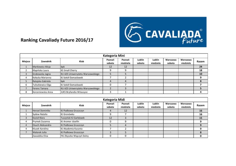 Ranking Cavaliady Future 2016/17 Kategoria Mini Miejsce 1 2 3 4 5 6 7 8 Zawodnik Markiewicz Alicja Kłapińska Laura Grabowska Jagna Kołacka Marianna Ratajska Gabriela Tuliszkiewicz Olga Ferenc Tamara Korzeniewska Anna Klub bpk KS Small Cherry KU AZS Uniwersytetu Warszawskiego KJ Sokół Damasławek bpk KJ Sokół Damasławek KU AZS Uniwersytetu Warszawskiego JUKS Bryllandia Witaszyce Poznań sobota Poznań niedziela 12 9 5 7 4 0 2 3 12 9 5 2 4 7 3 1 Lublin sobota Lublin niedziela Warszawa sobota Warszawa niedziela Razem 24 18 10 9 8 7 5 4 Kategoria Midi Miejsce 1 1 3 4 4 4 7 Zawodnik Henzel Dominika Sydow Natalia Kozioł Klara Prymek Zuzanna Osuch Aleksandra Klusek Karolina Walorek Julia Zawadzka Eliza Klub KJ Podkowa Gruszczyn KJ Gronówka Tuszyński KJ Garbówek KJ Aromer Józefin KJ Podkowa Gruszczyn KJ Akademia Kucania KJ Podkowa Gruszczyn FKJ Zbyszko Wiączyń Dolny Poznań sobota Poznań niedziela 4 9 12 0 5 7 3 0 12 7 3 9 4 2 5 0 Lublin sobota Lublin niedziela Warszawa sobota Warszawa niedziela Razem 16 16 15 9 9 9 8 0