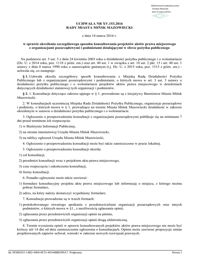 Elektronicznie podpisany przez: Tomasz Płochocki dnia 14 marca 2016 r. UCHWAŁA NR XV.153.2016 RADY MIASTA MIŃSK MAZOWIECKI z dnia 14 marca 2016 r. w sprawie określenia szczegółowego sposobu konsultowania projektów aktów prawa miejscowego z organizacjami pozarządowymi i podmiotami działającymi w sferze pożytku publicznego Na podstawie art. 5 ust. 5 z dnia 24 kwietnia 2003 roku o działalności pożytku publicznego i o wolontariacie (Dz. U. z 2014 roku, poz. 1118 z późn. zm.) oraz art. 40 ust. 1 w związku z art. 18 ust. 2 pkt. 15 i art. 40 ust. 1 ustawy z dnia 8 marca 1990 roku o samorządzie gminnym (t.j. Dz. U. z 2015 roku, poz. 1515 z późn. zm.) uchwala się, co następuje: § 1. Uchwała określa szczegółowy sposób konsultowania z Miejską Radą Działalności Pożytku Publicznego lub z organizacjami pozarządowymi i podmiotami, o których mowa w art. 3 ust. 3 ustawy o działalności pożytku publicznego i o wolontariacie projektów aktów prawa miejscowego w dziedzinach dotyczących działalności statutowej tych organizacji i podmiotów. § 2. 1. Konsultacje dotyczące zakresu ujętego w § 1. prowadzone są z inicjatywy Burmistrza Miasta Mińsk Mazowiecki. 2. W konsultacjach uczestniczą Miejska Rada Działalności Pożytku Publicznego, organizacje pozarządowe i podmioty, o których mowa w § 1. prowadzące na terenie Miasta Mińsk Mazowiecki działalność w zakresie określonym w ustawie o działalności pożytku publicznego i o wolontariacie. 3. Ogłoszenie o przeprowadzeniu konsultacji z organizacjami pozarządowymi publikuje się na minimum 7 dni przed terminem ich rozpoczęcia: 1) w Biuletynie Informacji Publicznej, 2) na stronie internetowej Urzędu Miasta Mińsk Mazowiecki, 3) na tablicy ogłoszeń Urzędu Miasta Mińsk Mazowiecki, 4. Ogłoszenie o przeprowadzeniu konsultacji może być także zamieszczone w prasie lokalnej. 5. Ogłoszenie o przeprowadzeniu konsultacji określa: 1) cel konsultacji, 2) przedmiot konsultacji wraz z projektem aktu prawa miejscowego, 3) czas rozpoczęcia i zakończenia konsultacji, 4) formy konsultacji. 6. Ponadto ogłoszenie może także zawierać: 1) formularz konsultacyjny projektu aktu prawa miejscowego lub informację o miejscu, z którego można pobrać formularz, 2) adres, na który należy dostarczyć wypełniony formularz. 7. Konsultacje prowadzone są w trzech formach: 1) protokołowanego otwartego spotkania z przedstawicielami organizacji pozarządowych oraz innych podmiotów, o których mowa w §1., z możliwością zgłaszania opinii, 2) zgłaszania przez przedstawicieli organizacji opinii na piśmie, 3) zgłaszania przez przedstawicieli organizacji opinii drogą elektroniczną. 8. Termin wyrażenia opinii w sprawie konsultowanych projektów aktów prawa miejscowego nie może być krótszy niż 14 dni od dnia zamieszczenia ogłoszenia o konsultacjach. Opinia może zawierać propozycje zmian projektowanych zapisów uchwał, wnioski w zakresie nowych rozwiązań prawnych. Id: 8F00E035-14B2-4404-8F53-48344BB5D9A7. Podpisany Strona 1 § 3. 1. Wnioski i propozycje wyrażone w opiniach mogą być uwzględniane, jeżeli nie naruszają obowiązującego porządku prawnego, proponują rozwiązania możliwe do wykonania ze strony gminy oraz budżet gminy jest w stanie je sfinansować. 2. Wyniki konsultacji zawierające zestawienie zgłoszonych opinii zamieszczane są: 1) w Biuletynie Informacji Publicznej, 2) na stronie internetowej Urzędu Miasta Mińsk Mazowiecki, 3) na tablicy ogłoszeń Urzędu Miasta Mińsk Mazowiecki, nie później niż w ciągu 30 dni od zakończenia konsultacji. 3. Wyniki konsultacji Burmistrz Miasta Mińsk Mazowiecki przedstawia Radzie Miasta w uzasadnieniu do projektów aktów, o których mowa w § 1. § 4. 1. W przypadku powołania Miejskiej Rady Działalności Pożytku Publicznego konsultacje, o których mowa w niniejszej uchwale odbywają się w ten sposób, że Burmistrz Miasta kieruje do tej Rady projekty aktów prawa miejscowego, dotyczące sfery zadań publicznych, o których mowa w art. 4 ust. 1 o działalności pożytku publicznego i o wolontariacie - w celu wyrażenia przez nią opinii w ciągu 14 dni od ich doręczenia. 2. Nieprzedstawienie opinii w w/w terminie oznacza rezygnację z prawa do jej wyrażenia. § 5. Wyniki konsultacji mają charakter opiniodawczy i nie są wiążące dla organów Miasta. § 6. Konsultacje uznaje się za ważne bez względu na liczbę podmiotów biorących w nich udział, jeżeli zostały przeprowadzone w sposób określony w uchwale. § 7. Traci moc Uchwała Nr XLII/402/10 Rady Miasta Mińsk Mazowiecki z dnia 20 września 2010 r. w sprawie określenia szczegółowego sposobu konsultowania z Miejską Radą Działalności Pożytku Publicznego lub z organizacjami pozarządowymi i podmiotami, o których mowa w art. 3 ust. 3 ustawy o działalności pożytku publicznego i o wolontariacie projektów aktów prawa miejscowego w dziedzinach dotyczących działalności statutowej tych organizacji. § 8. Wykonanie uchwały powierza się Burmistrzowi Miasta Mińsk Mazowiecki. § 9. Uchwała wchodzi w życie po upływie 14 dni od dnia ogłoszenia w Dzienniku Urzędowym Województwa Mazowieckiego. Wiceprzewodniczący Rady Miasta mgr Tomasz Płochocki Id: 8F00E035-14B2-4404-8F53-48344BB5D9A7. Podpisany Strona 2