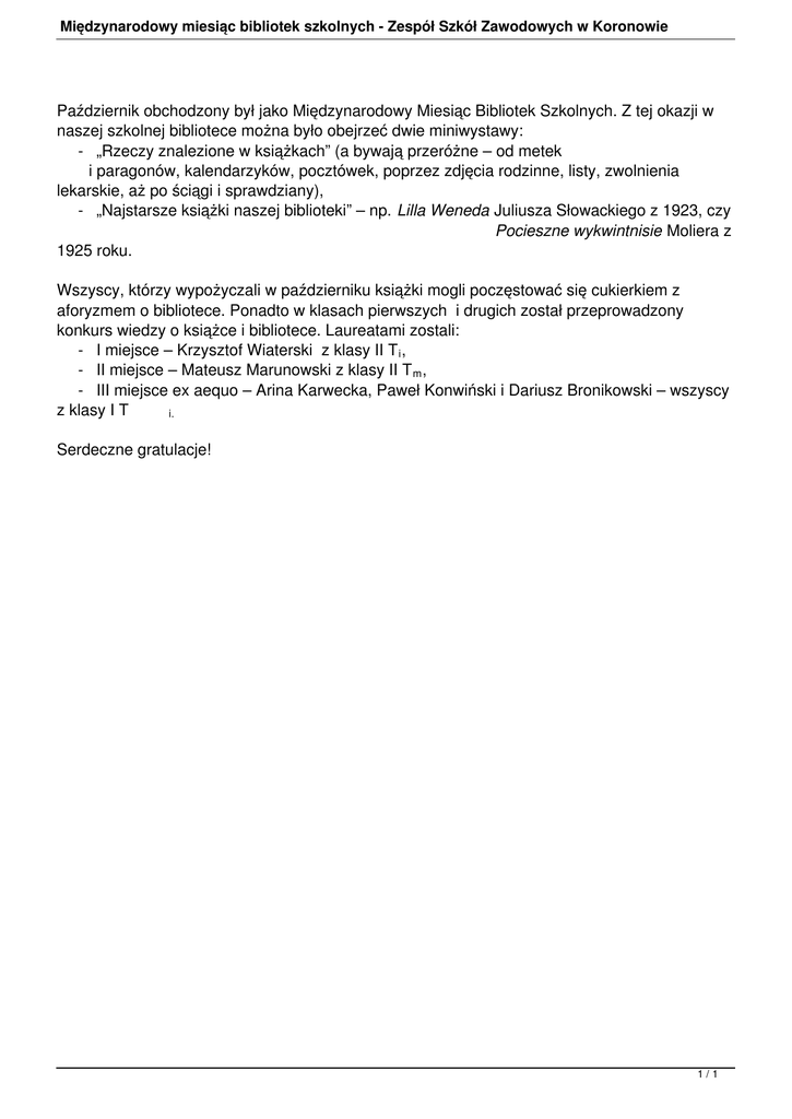 Międzynarodowy miesiąc bibliotek szkolnych - Zespół Szkół Zawodowych w Koronowie Październik obchodzony był jako Międzynarodowy Miesiąc Bibliotek Szkolnych. Z tej okazji w naszej szkolnej bibliotece można było obejrzeć dwie miniwystawy: - „Rzeczy znalezione w książkach” (a bywają przeróżne – od metek i paragonów, kalendarzyków, pocztówek, poprzez zdjęcia rodzinne, listy, zwolnienia lekarskie, aż po ściągi i sprawdziany), - „Najstarsze książki naszej biblioteki” – np. Lilla Weneda Juliusza Słowackiego z 1923, czy Pocieszne wykwintnisie Moliera z 1925 roku. Wszyscy, którzy wypożyczali w październiku książki mogli poczęstować się cukierkiem z aforyzmem o bibliotece. Ponadto w klasach pierwszych i drugich został przeprowadzony konkurs wiedzy o książce i bibliotece. Laureatami zostali: - I miejsce – Krzysztof Wiaterski z klasy II T i , - II miejsce – Mateusz Marunowski z klasy II T m , - III miejsce ex aequo – Arina Karwecka, Paweł Konwiński i Dariusz Bronikowski – wszyscy z klasy I T i. Serdeczne gratulacje! 1/1