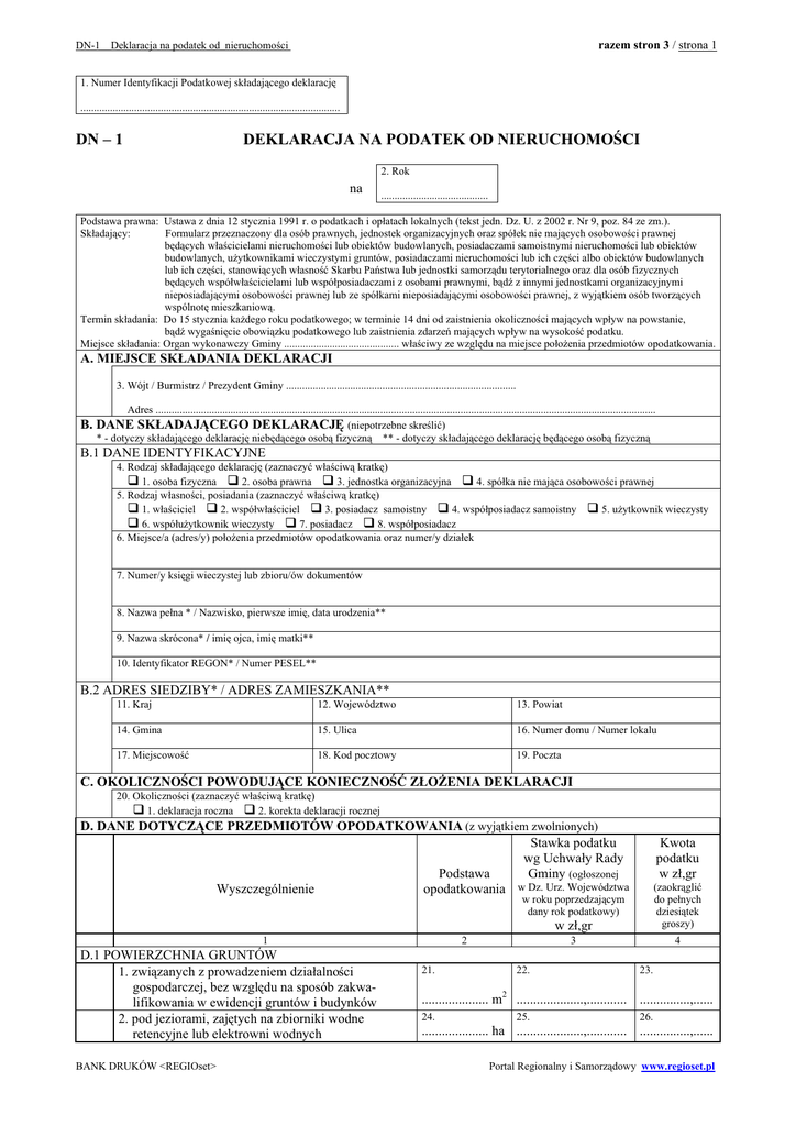 DN ± 1 DEKLARACJA NA PODATEK OD NIERUCHOMOŚCI