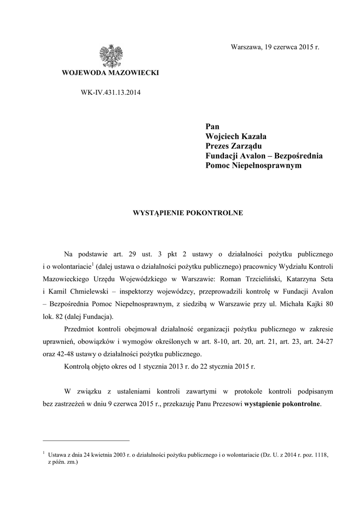 Warszawa, 19 czerwca 2015 r. WOJEWODA MAZOWIECKI WK-IV.431.13.2014 Pan Wojciech Kazała Prezes Zarządu Fundacji Avalon – Bezpośrednia Pomoc Niepełnosprawnym WYSTĄPIENIE POKONTROLNE Na podstawie art. 29 ust. 3 pkt 2 ustawy o działalności pożytku publicznego i o wolontariacie1 (dalej ustawa o działalności pożytku publicznego) pracownicy Wydziału Kontroli Mazowieckiego Urzędu Wojewódzkiego w Warszawie: Roman Trzcieliński, Katarzyna Seta i Kamil Chmielewski – inspektorzy wojewódzcy, przeprowadzili kontrolę w Fundacji Avalon – Bezpośrednia Pomoc Niepełnosprawnym, z siedzibą w Warszawie przy ul. Michała Kajki 80 lok. 82 (dalej Fundacja). Przedmiot kontroli obejmował działalność organizacji pożytku publicznego w zakresie uprawnień, obowiązków i wymogów określonych w art. 8-10, art. 20, art. 21, art. 23, art. 24-27 oraz 42-48 ustawy o działalności pożytku publicznego. Kontrolą objęto okres od 1 stycznia 2013 r. do 22 stycznia 2015 r. W związku z ustaleniami kontroli zawartymi w protokole kontroli podpisanym bez zastrzeżeń w dniu 9 czerwca 2015 r., przekazuję Panu Prezesowi wystąpienie pokontrolne. 1 Ustawa z dnia 24 kwietnia 2003 r. o działalności pożytku publicznego i o wolontariacie (Dz. U. z 2014 r. poz. 1118, z późn. zm.) I. Struktura organizacyjna Fundacji oraz zakres prowadzonej działalności pożytku publicznego Fundacja ustanowiona została przez panią Bożenę Luty aktem notarialnym repertorium ………………………………………………. W dniu 24 sierpnia 2009 r. Fundacji został przyznany status organizacji pożytku publicznego. Według ujawnionego wpisu w Krajowym Rejestrze Sądowym (dalej KRS) nr 0000270809 w Fundacji działał jednoosobowy Zarząd Fundacji oraz dwuosobowa Rada Fundacji, przy czym do reprezentacji organizacji uprawniony był jednoosobowo Prezes Fundacji. Zgodnie z § 3 ust. 2 statutu Fundacja mogła „(…) tworzyć zakłady i inne jednostki organizacyjne”. Ustalenia kontroli wykazały, że Fundacja nie posiadła zakładów lub jednostek organizacyjnych.2 Na podstawie sprawozdania merytorycznego z działalności Fundacji za 2013 r. oraz § 3 ust. 4 statutu ustalono, że Fundacja prowadziła działalność nieodpłatną i odpłatną pożytku publicznego. Na podstawie dowodów finansowo–księgowych oraz informacji wykazanych w sprawozdaniu merytorycznym dotyczących działalności organizacji ustalono, że Fundacja w okresie objętym kontrolą nie prowadziła działalności gospodarczej. W zakresie prowadzonej działalności odpłatnej pożytku publicznego nie stwierdzono, aby działalność ta stanowiła działalność gospodarczą w rozumieniu art. 9 ust. 1 pkt 1 i 2 ustawy o działalności pożytku publicznego. Prowadzona działalność statutowa Fundacji należała do sfery zadań publicznych określonych w art. 4 ust. 1 pkt 1, 6 i 7 ww. ustawy i obejmowała zadania z zakresu działalności na rzecz osób niepełnosprawnych, ochrony i promocji zdrowia oraz pomocy społecznej. Działalność pożytku publicznego prowadzona była przez Fundację na rzecz określonej grupy osób wyodrębnionych ze względu na szczególnie trudną sytuację życiową, zgodnie z art. 20 ust. 1 pkt 1 ustawy o działalności pożytku publicznego. Zakres działalności nieodpłatnej i odpłatnej pożytku publicznego został określony w statucie Fundacji, zgodnie z wymogiem art. 10 ust. 3 ww. ustawy.3 II. Spełnienie wymogów dotyczących działalności organizacji pożytku publicznego Sposób wykorzystania nadwyżki przychodów nad kosztami Zgodne z § 3 ust. 7 statutu całkowity dochód z działalności Fundacji (nadwyżka przychodów nad kosztami) każdorazowo przeznaczany jest na działalność pożytku publicznego, tj. zgodnie z dyspozycją § 2 ust. 4 rozporządzenia w sprawie szczegółowych zasad rachunkowości 2 Fundacja złożyła wniosek z 15 marca 2013 r., w którym wnioskowano o wpisanie nowego oddziału Fundacji. Pismem z dnia Prezes Fundacji wycofał powyższy wniosek. Zgodnie z wyjaśnieniem pełnomocnika Zarządu Fundacji z dnia 23 grudnia 2014 r. „(…) Ze względu na fakt, że intencją Fundacji nie było powołanie oddziału Fundacji, wniosek o jego rejestrację został wycofany pismem do KRS z dnia 10.04.2014.” 3 Ustalenia kontroli wykazały, że przed wejściem w życie zapisów statutu z dnia 15 marca 2013 r. zakres działalności odpłatnej uregulowany został w Regulaminie Projektu Rehabilitacji Odpłatnej przyjętym w dniu 1 marca 2011 r. 2 dla niektórych jednostek niebędących spółkami handlowymi nieprowadzących działalności gospodarczej4 oraz wymogiem określonym w art. 20 ust. 1 pkt 3 ustawy o działalności pożytku publicznego. Zgodnie z treścią uchwały nr 2/2014 z dnia 30 czerwca 2014 r. Walnego Zebrania Fundacji „(…) w przedmiocie zatwierdzenia sprawozdania finansowego i merytorycznego z działalności Fundacji za rok 2013 (…)” wynik finansowy za 2013 r. przeznaczony został na realizacje celów statutowych w 2014 r. Spełnienie przez członków organu zarządzającego oraz członków organu kontroli wymogów dotyczących pełnionych funkcji Organem zarządzającym i reprezentującym Fundację na zewnątrz jest Zarząd, który powoływany jest przez Fundatora na okres 3-letniej kadencji. Do kompetencji Zarządu należy między innymi reprezentowanie Fundacji na zewnątrz oraz kierowanie i organizowanie jej działalności. Zgodnie z § 13 części II ust. 1 statutu w jednostce kontrolowanej funkcjonuje Rada Fundacji jako statutowy kolegialny organ nadzoru, odrębny od organu zarządzającego i niepodlegający mu w zakresie wykonywania kontroli, do kompetencji którego należy kontrola działalności Fundacji. Funkcjonowanie niezależnego organu nadzoru wypełnia wymóg określonyw art. 20 ust. 1 pkt 4 ustawy o działalności pożytku publicznego. Ustalono, że żadna z osób będących członkami Zarządu oraz Rady Fundacji nie znajdowała się w ewidencji Krajowego 