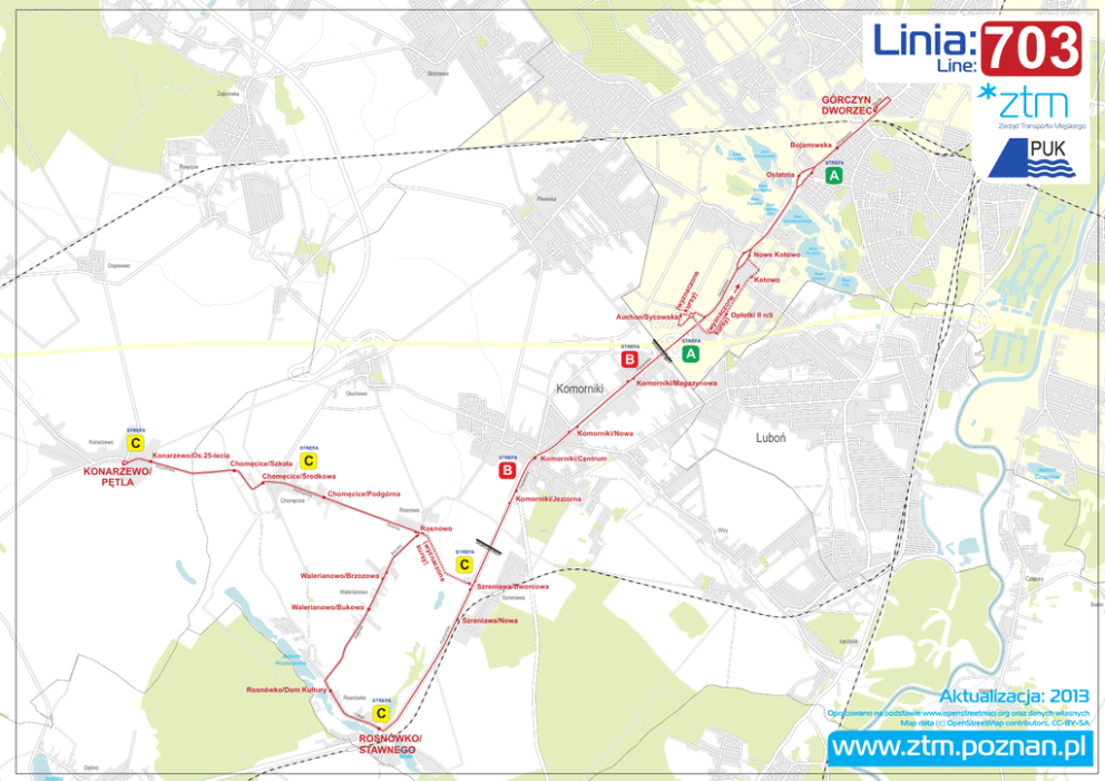Linia: Line: 703 Skórzewo Dąbrówka GÓRCZYN Zgoda DWORZEC ka ws Bojanowska Staw Stara Baba ło go PUK G Staw Baczkowski STREFA Palędzie A Ostatnia Staw Kachlarski Plewiska Staw Karpetaj Staw Głęboki Dół Staw Nowakowskiego Nowe Kotowo Staw Rozlany Auchan/Sycowska Staw Glabisia Staw Edy Opłotki II n/ż FY A zn Po Komorniki/Magazynowa Komorniki/Nowa C Luboń STREFA C B Poz nań ska Chomęcice Jezioro Czapnica zna Chomęcice/Środkowa a Chomęcice/Szkoła Po Pozn ańska Komorniki/Centrum STREFA ńsk Konarzewo/Os.25-lecia KONARZEWO/ PĘTLA ań RE ST STREFA Konarzewo A Komorniki Głuchowo NIC B a sk Kotowo STREFA A GR STREFA (w ku yzna rs cz Głogow ska y) on e (w y ku znac rsy zo ne ) Dopiewiec Chomęcice/Podgórna Komorniki/Jeziorna Rosnowo Rosnowo owa Bu ko w NIC STREFA AS TR EF Y C zon Czapury e Walerianowo/Brzozowa Wiry GR A c zna (wy sy) kur a Sad Szreniawa/Dworcowa Walerianowo Szreniawa Babki Walerianowo/Bukowa Po Bu zna ko ńsk wa a Szreniawa/Nowa Łęczyca Jezioro Rosnowskie Rosnówko/Dom Kultury Wiórek Rosnówko 1M aja Aktualizacja: 2013 STREFA C ROSNÓWKO/ Jezioro STAWNEGO Małe Dębno Jezioro www.ztm.poznan.pl