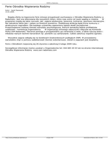 MKRPA w Radomsku Ferie Ośrodka Wspierania Rodziny Autor: Jacek Paszewski 14.01.2009. Bogatą ofertę na tegoroczne ferie zimowe przygotowali wychowawcy z Ośrodka Wspierania Rodziny w Radomsku. Jest ona skierowana dla wszystkich dzieci, które czas wolny od nauki spędzą w mieście. W programie znajdą się takie rozrywki, jak: zajęcia edukacyjne, taneczne, kulinarne, sportowo-rekreacyjne. Nie zabraknie także gier i zabaw na świeżym powietrzu. Dodatkową atrakcją będą liczne konkursy z atrakcyjnymi nagrodami. Dla każdego uczestnika zapewniony będzie słodki poczęstunek. Przeprowadzone zostaną również warsztaty psychologiczne, których tematyką będzie profilaktyka uzależnień - komentują organizatorzy. W organizację zimowego odpoczynku włączyła się Komenda Hufca ZHP Radomsko. Harcerze pomogą w przygotowaniu gry terenowej w lesie, a także nauczą dzieci i młodzież różnych technik harcerskich np: pionierki czy samarytanki. Całość zakończy wspólne ognisko. Wszystkie zajęcia odbędą się na świetlicach środowiskowych podległych OWR. W prowadzeniu warsztatów chęć w pomocy zadeklarowali również wolontariusze. Udział w zajęciach jest bezpłatny. Ferie z Ośrodkiem rozpoczną się 26 stycznia a zakończą 6 lutego 2009 roku. Szczegółowe informacje można uzyskać u Organizatorów tel: 044 683 20 03 lub na stronie internetowej Ośrodka Wspierania Rodziny www.owr-radomsko.com http://www.profilaktyka.radomsko.pl Kreator PDF Utworzono 8 March, 2017, 03:46