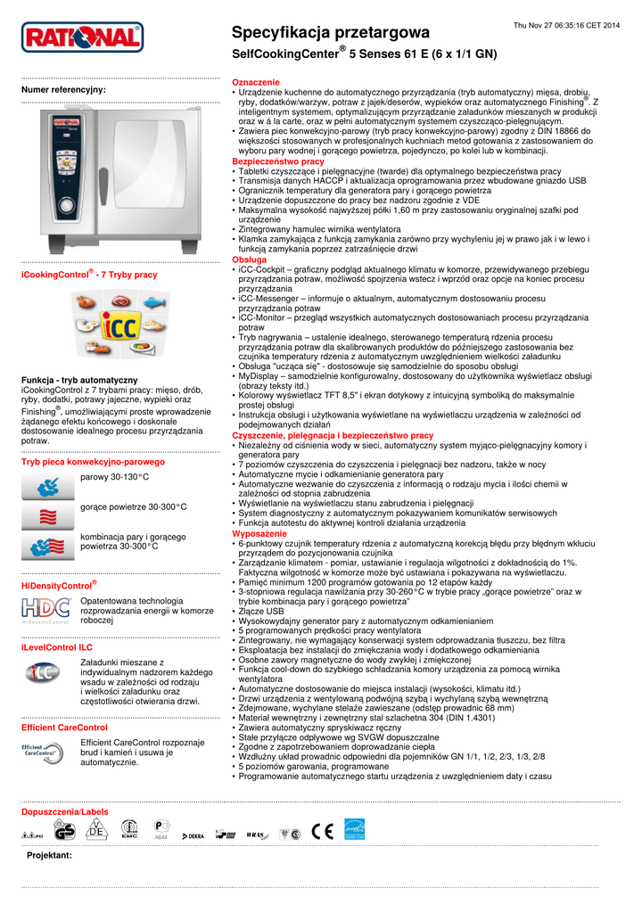 Specyfikacja przetargowa Thu Nov 27 06:35:16 CET 2014 ® SelfCookingCenter 5 Senses 61 E (6 x 1/1 GN) Numer referencyjny: ® iCookingControl - 7 Tryby pracy Funkcja - tryb automatyczny iCookingControl z 7 trybami pracy: mięso, drób, ryby, dodatki, potrawy jajeczne, wypieki oraz ® Finishing , umożliwiającymi proste wprowadzenie żądanego efektu końcowego i doskonałe dostosowanie idealnego procesu przyrządzania potraw. Tryb pieca konwekcyjno-parowego parowy 30-130°C gorące powietrze 30-300°C kombinacja pary i gorącego powietrza 30-300°C ® HiDensityControl Opatentowana technologia rozprowadzania energii w komorze roboczej iLevelControl ILC Załadunki mieszane z indywidualnym nadzorem każdego wsadu w zależności od rodzaju i wielkości załadunku oraz częstotliwości otwierania drzwi. Efficient CareControl Efficient CareControl rozpoznaje brud i kamień i usuwa je automatycznie. Dopuszczenia/Labels Projektant: Oznaczenie • Urządzenie kuchenne do automatycznego przyrządzania (tryb automatyczny) mięsa, drobiu, ® ryby, dodatków/warzyw, potraw z jajek/deserów, wypieków oraz automatycznego Finishing . Z inteligentnym systemem, optymalizującym przyrządzanie załadunków mieszanych w produkcji oraz w á la carte, oraz w pełni automatycznym systemem czyszcząco-pielęgnującym. • Zawiera piec konwekcyjno-parowy (tryb pracy konwekcyjno-parowy) zgodny z DIN 18866 do większości stosowanych w profesjonalnych kuchniach metod gotowania z zastosowaniem do wyboru pary wodnej i gorącego powietrza, pojedynczo, po kolei lub w kombinacji. Bezpieczeństwo pracy • Tabletki czyszczące i pielęgnacyjne (twarde) dla optymalnego bezpieczeństwa pracy • Transmisja danych HACCP i aktualizacja oprogramowania przez wbudowane gniazdo USB • Ogranicznik temperatury dla generatora pary i gorącego powietrza • Urządzenie dopuszczone do pracy bez nadzoru zgodnie z VDE • Maksymalna wysokość najwyższej półki 1,60 m przy zastosowaniu oryginalnej szafki pod urządzenie • Zintegrowany hamulec wirnika wentylatora • Klamka zamykająca z funkcją zamykania zarówno przy wychyleniu jej w prawo jak i w lewo i funkcją zamykania poprzez zatrzaśnięcie drzwi Obsługa • iCC-Cockpit – graficzny podgląd aktualnego klimatu w komorze, przewidywanego przebiegu przyrządzania potraw, możliwość spojrzenia wstecz i wprzód oraz opcje na koniec procesu przyrządzania • iCC-Messenger – informuje o aktualnym, automatycznym dostosowaniu procesu przyrządzania potraw • iCC-Monitor – przegląd wszystkich automatycznych dostosowaniach procesu przyrządzania potraw • Tryb nagrywania – ustalenie idealnego, sterowanego temperaturą rdzenia procesu przyrządzania potraw dla skalibrowanych produktów do późniejszego zastosowania bez czujnika temperatury rdzenia z automatycznym uwzględnieniem wielkości załadunku • Obsługa "ucząca się" - dostosowuje się samodzielnie do sposobu obsługi • MyDisplay – samodzielnie konfigurowalny, dostosowany do użytkownika wyświetlacz obsługi (obrazy teksty itd.) • Kolorowy wyświetlacz TFT 8,5" i ekran dotykowy z intuicyjną symboliką do maksymalnie prostej obsługi • Instrukcja obsługi i użytkowania wyświetlane na wyświetlaczu urządzenia w zależności od podejmowanych działań Czyszczenie, pielęgnacja i bezpieczeństwo pracy • Niezależny od ciśnienia wody w sieci, automatyczny system myjąco-pielęgnacyjny komory i generatora pary • 7 poziomów czyszczenia do czyszczenia i pielęgnacji bez nadzoru, także w nocy • Automatyczne mycie i odkamienianie generatora pary • Automatyczne wezwanie do czyszczenia z informacją o rodzaju mycia i ilości chemii w zależności od stopnia zabrudzenia • Wyświetlanie na wyświetlaczu stanu zabrudzenia i pielęgnacji • System diagnostyczny z automatycznym pokazywaniem komunikatów serwisowych • Funkcja autotestu do aktywnej kontroli działania urządzenia Wyposażenie • 6-punktowy czujnik temperatury rdzenia z automatyczną korekcją błędu przy błędnym wkłuciu przyrządem do pozycjonowania czujnika • Zarządzanie klimatem - pomiar, ustawianie i regulacja wilgotności z dokładnością do 1%. Faktyczna wilgotność w komorze może być ustawiana i pokazywana na wyświetlaczu. • Pamięć minimum 1200 programów gotowania po 12 etapów każdy • 3-stopniowa regulacja nawilżania przy 30-260°C w trybie pracy „gorące powietrze” oraz w trybie kombinacja pary i gorącego powietrza” • Złącze USB • Wysokowydajny generator pary z automatycznym odkamienianiem • 5 programowanych prędkości pracy wentylatora • Zintegrowany, nie wymagający konserwacji system odprowadzania tłuszczu, bez filtra • Eksploatacja bez instalacji do zmiękczania wody i dodatkowego odkamieniania • Osobne zawory magnetyczne do wody zwykłej i zmiękczonej • Funkcja cool-down do szybkiego schładzania komory urządzenia za pomocą wirnika wentylatora • Automatyczne dostosowanie do miejsca instalacji (wysokości, klimatu itd.) • Drzwi urządzenia z wentylowaną podwójną szybą i wychylaną szybą wewnętrzną • Zdejmowane, wychylane stelaże zawieszane (odstęp prowadnic 68 mm) • Materiał wewnętrzny i zewnętrzny stal szlachetna 304 (DIN 1.4301) • Zawiera automatyczny spryskiwacz ręczny • Stałe przyłącze odpływowe wg SVGW dopuszczalne • Zgodne z zapotrzebowaniem doprowadzanie ciepła • Wzdłużny układ prowadnic odpowiedni dla pojemników GN 1/1, 1/2, 2/3, 1/3, 2/8 • 5 poziomów garowania, programowane • Programowanie automatycznego startu urządzenia z uwzględnieniem daty i czasu Thu Nov 27 06:35:21 CET 2014 Specyfikacje przetargowe/karty danych ® SelfCookingCenter 5 Senses 61 E (6 x 1/1 GN) Techniczna informacja Wzdłużny układ prowadnic: Pojemność: Dzienna liczba posiłków: Szerokość: Głębokość: Wysokość: Ciężar (netto): Ciężar (brutto): 1/1, 1/2, 2/3, 1/3, 2/8 GN 6 x 1/1 GN 30-80 847 mm 771 mm 782 mm 112,5 kg 127,5 kg Średn