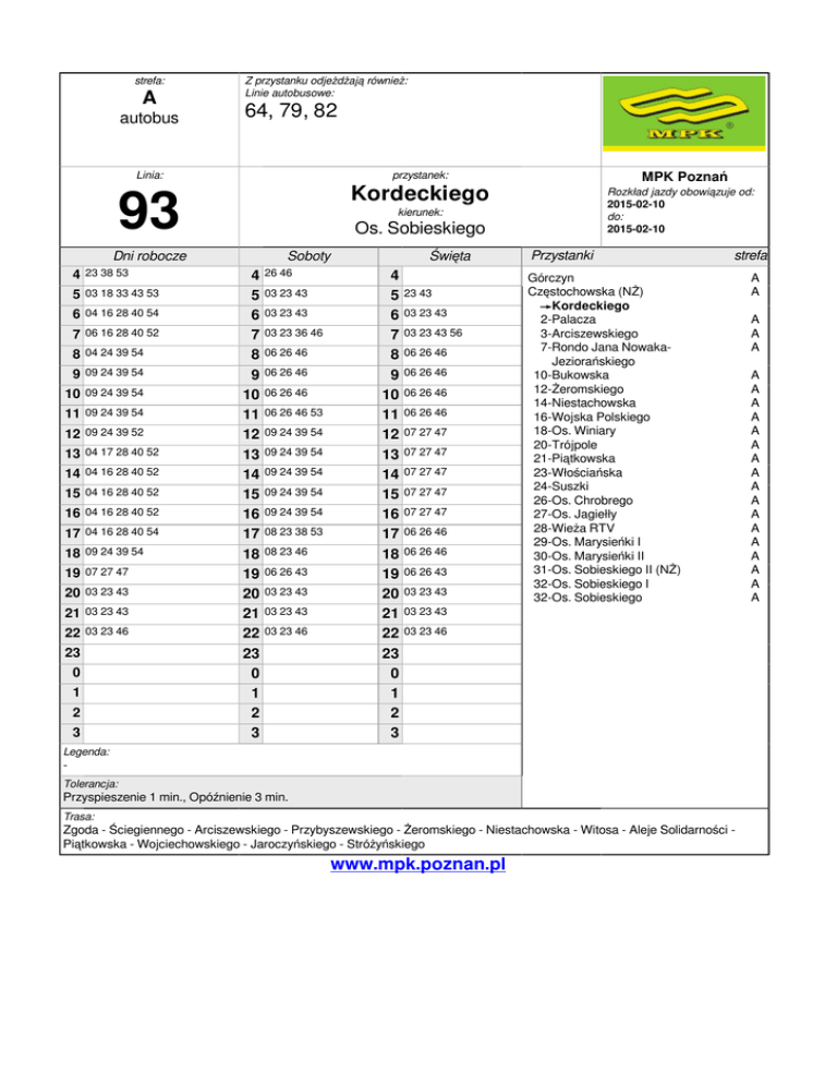strefa: A autobus Z przystanku odjeżdżają również: Linie autobusowe: 64, 79, 82 Linia: 93 Dni robocze 4 23 38 53 5 03 18 33 43 53 6 04 16 28 40 54 7 06 16 28 40 52 8 04 24 39 54 9 09 24 39 54 10 09 24 39 54 11 09 24 39 54 12 09 24 39 52 13 04 17 28 40 52 14 04 16 28 40 52 15 04 16 28 40 52 16 04 16 28 40 52 17 04 16 28 40 54 18 09 24 39 54 19 07 27 47 20 03 23 43 21 03 23 43 22 03 23 46 23 0 1 2 3 MPK Poznań przystanek: Kordeckiego Rozkład jazdy obowiązuje od: 2015-02-10 do: 2015-02-10 kierunek: Os. Sobieskiego 4 5 6 7 8 9 10 11 12 13 14 15 16 17 18 19 20 21 22 23 0 1 2 3 Soboty 26 46 03 23 43 03 23 43 03 23 36 46 06 26 46 06 26 46 06 26 46 06 26 46 53 09 24 39 54 09 24 39 54 09 24 39 54 09 24 39 54 09 24 39 54 08 23 38 53 08 23 46 06 26 43 03 23 43 03 23 43 03 23 46 4 5 6 7 8 9 10 11 12 13 14 15 16 17 18 19 20 21 22 23 0 1 2 3 Święta 23 43 03 23 43 03 23 43 56 06 26 46 06 26 46 06 26 46 06 26 46 07 27 47 07 27 47 07 27 47 07 27 47 07 27 47 06 26 46 06 26 46 06 26 43 03 23 43 03 23 43 Przystanki strefa Górczyn Częstochowska (NŻ) →Kordeckiego 2-Palacza 3-Arciszewskiego 7-Rondo Jana NowakaJeziorańskiego 10-Bukowska 12-Żeromskiego 14-Niestachowska 16-Wojska Polskiego 18-Os. Winiary 20-Trójpole 21-Piątkowska 23-Włościańska 24-Suszki 26-Os. Chrobrego 27-Os. Jagiełły 28-Wieża RTV 29-Os. Marysieńki I 30-Os. Marysieńki II 31-Os. Sobieskiego II (NŻ) 32-Os. Sobieskiego I 32-Os. Sobieskiego 03 23 46 Legenda: - Tolerancja: Przyspieszenie 1 min., Opóźnienie 3 min. Trasa: Zgoda - Ściegiennego - Arciszewskiego - Przybyszewskiego - Żeromskiego - Niestachowska - Witosa - Aleje Solidarności Piątkowska - Wojciechowskiego - Jaroczyńskiego - Stróżyńskiego www.mpk.poznan.pl A A A A A A A A A A A A A A A A A A A A A A