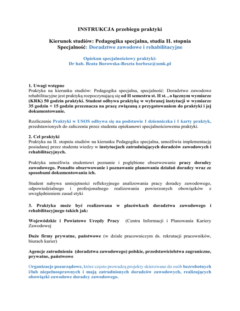 INSTRUKCJA przebiegu praktyki Kierunek studiów: Pedagogika specjalna, studia II. stopnia Specjalność: Doradztwo zawodowe i rehabilitacyjne Opiekun specjalnościowy praktyki: Dr hab. Beata Borowska-Beszta [email protected] 1. Uwagi wstępne Praktyka na kierunku studiów: Pedagogika specjalna, specjalność: Doradztwo zawodowe rehabilitacyjne jest praktyką rozpoczynającą się od II semestru st. II st. , o łącznym wymiarze (KRK) 50 godzin praktyki. Student odbywa praktykę w wybranej instytucji w wymiarze 35 godzin + 15 godzin przeznacza na pracę związaną z przygotowaniem do praktyki i jej dokumentowanie. Rozliczenie Praktyki w USOS odbywa się na podstawie 1 dzienniczka i 1 karty praktyk, przedstawionych do zaliczenia przez studenta opiekunowi specjalnościowemu praktyki. 2. Cel praktyki Praktyka na II. stopniu studiów na kierunku Pedagogika specjalna, umożliwia implementację posiadanej przez studenta wiedzy w instytucjach zatrudniających doradców zawodowych i rehabilitacyjnych. Praktyka umożliwia studentowi poznanie i pogłębione obserwowanie pracy doradcy zawodowego. Ponadto obserwowanie i poznawanie planowania działań doradcy wraz ze sposobami dokumentowania ich. Student nabywa umiejętności refleksyjnego analizowania pracy doradcy zawodowego, odpowiedzialnego i profesjonalnego realizowania powierzonych obowiązków z uwzględnieniem zasad etyki 3. Praktyka może być realizowana w placówkach doradztwa zawodowego i rehabilitacyjnego takich jak: Wojewódzkie i Powiatowe Urzędy Pracy Zawodowej (Centra Informacji i Planowania Kariery Duże firmy prywatne, państwowe (w dziale pracowniczym ds. rekrutacji pracowników, biurach karier) Agencje zatrudnienia (doradztwa zawodowego) polskie, przedstawicielstwa zagraniczne, prywatne, państwowe Organizacje pozarządowe, które często prowadzą projekty skierowane do osób bezrobotnych i/lub niepełnosprawnych i mają zatrudnionych doradców zawodowych, realizujących obowiązki zawodowe doradcy zawodowego. Ochotnicze Hufce Pracy Wojskowe Komendy Uzupełnień i im podległe agencje zatrudnienia byłych żołnierzy 4. Potencjalne miejsca realizacji praktyk w Toruniu: Wojewódzki Urząd Pracy w Toruniu, Centrum Informacji i Planowania Kariery Zawodowej ul. Szosa Chełmińska 30/32 Mobilne Centrum Informacji Zawodowej przy Pomorsko-Kujawskiej Wojewódzkiej Komendzie OHP w Toruniu, ul. Poznańska 11/13 Centrum Informacji i Planowania Kariery Zawodowej w Toruniu. ul. Szpitalna 6 Centrum Integracji Społecznej przy CISTOR, Stowarzyszenie Partnerstwo Społeczne ul. Stokrotkowa 22 WKU – i odnośne agencje zatrudnienia. ul. Wały Gen. W. Sikorskiego 21 Praktyka może być realizowana w analogicznych instytucjach, w miejscu zamieszkania studenta 5. Tryb praktyki Praktyka w liczbie 35 godzin oznacza fizyczne bycie w tym wymiarze w instytucji, miejscu realizacji praktyk. Praktykę można realizować w trybie ciągłym np. 5 dni po 7 godzin lub w trybie regularnych wizyt np. 1 x w tygodniu po 7h = 5 wejść do instytucji. Możliwe są inne formy ustalenia godzin praktyki w instytucjach, pod warunkiem łącznej realizacji 35 godzin GODZINA = jest rozumiana jako jednostka czasu (np. 60’) przyjęta w danej instytucji jako norma rozliczania czasu pracy doradcy zawodowego 6. Z ramienia Uczelni specjalnościowy opiekun praktyki prowadzi konsultacje merytoryczne związane z wyborem miejsca praktyki, określeniem założeń praktyki, jak i jej zaliczeniem (USOS) 7. Nadzór nad wykonaniem przydzielonych studentowi zadań na terenie miejsca odbywania praktyki należy do opiekuna praktyki z ramienia instytucji przyjmującej studenta na praktykę. 8. Opiekun z ramienia instytucji wspólnie ze studentem ustalają szczegółowy program praktyki, uwzględniając specyfikę danej instytucji oraz ewentualne sugestie praktykanta wynikające z jego indywidualnych zainteresowań. 9. Po zakończeniu praktyki opiekun praktyki z ramienia instytucji dokonuje charakterystyki postawy praktykanta i ocenia przebieg jego praktyki – wpisując ocenę i szczegóły przebiegu praktyki do Dziennika praktyk ORAZ do Karty Praktyk 10. Założenia programowo-organizacyjne Student we własnym zakresie znajduje instytucję, w której mógłby odbywać praktykę, jak również opiekuna praktyk, który nieodpłatnie podjąłby się tej funkcji Uczelnia nie pokrywa kosztów związanych z realizacją tego trybu praktyk, które nie są praktykami nauczycielskimi, opartymi na uprzednich umowach między uczelnia a szkołą. (zob. zarządzenie JM Rektora nr 100 z dn. 10.08.2009) Student odbywający praktyki zobowiązany jest do opłacenia składek z tytułu ubezpieczenia od następstw nieszczęśliwych wypadków (NNW na cały okres trwania praktyki). Zaleca się sprawdzenie czy placówki przyjmujące na praktyki honorują bieżące ubezpieczenie posiadane przez studenta w jego uczelni, lub inną polisę z wyraźnym zaznaczeniem kategorii ubezpieczenia od NNW. Czasem instytucje umożliwiające realizację praktyki życzą sobie dodatkowo ubezpieczenia OC. Przed przystąpieniem do zajęć praktykant powinien zapoznać się z obowiązującymi przepisami oraz zasadami bezpieczeństwa i higieny pracy w miejscu praktyki. Przed udaniem się do wybranej instytucji należy zabrać ze sobą: Pismo przewodnie, kartę praktyk, instrukcję praktyk, dzienniczek, dokument o posiadanym ubezpieczeniu NNW. Pierwsze godziny praktyki w danej instytucji student powinien poświęcić na poznanie zasad funkcjonowania instytucji oraz organizacji pracy doradcy zawodowego. Pod kierunkiem pracownika instytucji - opiekuna praktyki student powinien aktywnie uczestniczyć w bieżącej pracy doradcy zawodowego, w stopniu i zakresie określonym przez opiekuna praktyki. Student dostosowuje się do organizacji i regulaminu pracy obowiązujących w placówce. W trakcie trwania praktyki student prowadzi systematycznie Dziennik praktyk, w którym powinna znaleźć odzwierciedlenie jego codzienna aktywność w miejs