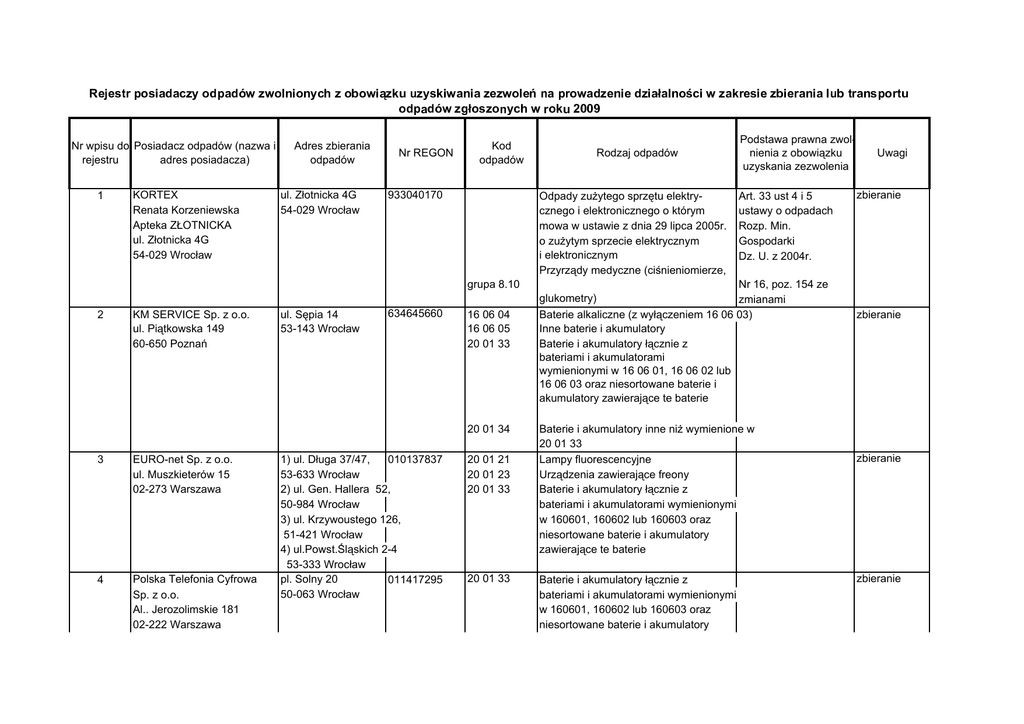 1 KORTEX Renata Korzeniewska Apteka ZŁOTNICKA ul. Złotnicka 4G 54-029 Wrocław Adres zbierania odpadów ul. Złotnicka 4G 54-029 Wrocław KM SERVICE Sp. z o.o. ul. Piątkowska 149 60-650 Poznań ul. Sępia 14 53-143 Wrocław EURO-net Sp. z o.o. ul. Muszkieterów 15 02-273 Warszawa 4 Polska Telefonia Cyfrowa Sp. z o.o. Al.. Jerozolimskie 181 02-222 Warszawa 1) ul. Długa 37/47, 010137837 53-633 Wrocław 2) ul. Gen. Hallera 52, 50-984 Wrocław 3) ul. Krzywoustego 126, 51-421 Wrocław 4) ul.Powst.Śląskich 2-4 53-333 Wrocław pl. Solny 20 011417295 50-063 Wrocław 16 06 04 16 06 05 20 01 33 20 01 21 20 01 23 20 01 33 20 01 33 Rodzaj odpadów Odpady zużytego sprzętu elektrycznego i elektronicznego o którym mowa w ustawie z dnia 29 lipca 2005r. o zużytym sprzecie elektrycznym i elektronicznym Przyrządy medyczne (ciśnieniomierze, 20 01 34 3 933040170 634645660 Kod odpadów grupa 8.10 2 Nr REGON Nr wpisu do Posiadacz odpadów (nazwa i rejestru adres posiadacza) Podstawa prawna zwolnienia z obowiązku uzyskania zezwolenia Art. 33 ust 4 i 5 ustawy o odpadach Rozp. Min. Gospodarki Dz. U. z 2004r. Nr 16, poz. 154 ze glukometry) zmianami Baterie alkaliczne (z wyłączeniem 16 06 03) Inne baterie i akumulatory Baterie i akumulatory łącznie z bateriami i akumulatorami wymienionymi w 16 06 01, 16 06 02 lub 16 06 03 oraz niesortowane baterie i akumulatory zawierające te baterie Baterie i akumulatory inne niż wymienione w 20 01 33 Lampy fluorescencyjne Urządzenia zawierające freony Baterie i akumulatory łącznie z bateriami i akumulatorami wymienionymi w 160601, 160602 lub 160603 oraz niesortowane baterie i akumulatory zawierające te baterie Baterie i akumulatory łącznie z bateriami i akumulatorami wymienionymi w 160601, 160602 lub 160603 oraz niesortowane baterie i akumulatory Uwagi zbieranie zbieranie zbieranie zbieranie 20 01 34 grupa 2.13 grupa 3.16 grupa 3.18 5 6 Nesky Wrocław Sp. z o.o. ul. Krakowska 98 50-427 Wrocław ALKOM Nosal Nowak Sp.j. ul. Ks. Meiera 11 31-236 Kraków 930766860 16 06 01 Sklep Franczyzowy ERA 351375337 ul. Jedność Narodowej 106 50-301 Wrocław 20 01 33 ul. Krakowska 98 50-427 Wrocław 20 01 34 grupa 2.13 grupa 3.16 grupa 3.18 7 BIT Firma HandlowoUsługowa Wojciechowski Stanisław ul. Jana Stanki34 52-431 Wrocław APS ERA GSM 005989228 ul. Horbaczewskiego 4-6 54-130 Wrocław 20 01 33 20 01 34 grupa 2.13 grupa 3.16 zawierające te baterie Baterie i akumulatory inne niż wymienione w 200133 Odpady zużytego sprzętu elektrycznego i elektronicznego o którym mowa w ustawie z dnia 29 lipca 2005r. o zużytym sprzecie elektrycznym i elektronicznym (ładowarki do telefonów, telefony komórkowe, sprzęt teleinformatyczny Baterie i akumulatory ołowiowe Baterie i akumulatory łącznie z bateriami i akumulatorami wymienionymi w 160601, 160602 lub 160603 oraz niesortowane baterie i akumulatory zawierające te baterie Baterie i akumulatory inne niż wymienione w 200133 Odpady zużytego sprzętu elektrycznego i elektronicznego o którym mowa w ustawie z dnia 29 lipca 2005r. o zużytym sprzecie elektrycznym i elektronicznym (ładowarki do telefonów, telefony komórkowe, sprzęt teleinformatyczny Baterie i akumulatory łącznie z bateriami i akumulatorami wymienionymi w 160601, 160602 lub 160603 oraz niesortowane baterie i akumulatory zawierające te baterie Baterie i akumulatory inne niż wymienione w 200133 Odpady zużytego sprzętu elektrycznego i elektronicznego o którym zbieranie i transport zbieranie zbieranie grupa 3.18 8 PTI Sp. z o.o. ul. Dziadoszańska 10 61-248 Poznań ul. Graniczna 2A 300635806 Wrocław (Centrum Handlowe Futura Park) 16 06 01 16 06 02 16 06 03 16 06 04 16 06 05 grupa 3 mowa w ustawie z dnia 29 lipca 2005r. o zużytym sprzecie elektrycznym i elektronicznym (ładowarki do telefonów, telefony komórkowe, sprzęt teleinformatyczny Baterie i akumulatory ołowiowe Baterie i akumulatory niklowo-kadmowe Baterie zawierające rtęć Baterie alkaliczne (z wyłączeniem 16 06 03) Inne baterie i akumulatory Odpady zużytego sprzętu elektrycznego i elektronicznego o którym mowa w ustawie z dnia 29 lipca 2005r. o zużytym sprzecie elektrycznym i elektronicznym (telefony komórkowe, betarie, akcesoria komórkowe) Opakowania zawierające pozostałości 9 Sto-ispo Sp. z o.o. ul. Zabraniecka 15 03-872 Warszawa ul. Ostrowskiego 13A 011756979 53-238 Wrocław BSH Sprzęt ul. Krynicka 38-40 Gospodarstwa Domowego Sp. z o.o. 50-555 Wrocław zbieranie 150110 substancji niebezpiecznych lub nimi zanieczyszczone (np. środkami ochrony soślin I i II klasy toksyczności) 16 02 11 10 012604823 16 02 13 16 02 16 ul. Al. Jerozolimskie 183 02-222 Warszawa 20 01 23 20 01 34 11 TECHNIK Sp z o.o. ul. Stara 45 ul. Stargardzka 9C 54-156 Wrocław 272251211 zbieranie 15 01 02 15 01 04 zbieranie Zużyte urządzenia zawierające freony, aktualiacja HCFC HFC Lampy florescencyjne wpisu do Rejestru Odpadowy toner drukarski z urządzeń biurowych Urządzenia zawierające freony Baterie i akumulatory inne niż wymienione w 20 01 33 Opakowania z tworzyw sztucznych Opakowania z metali Nr 19 2008r. zbieranie 41-703 Ruda Śląska 12 Polska Telefonia Cyfrowa Sp. z o.o. Al. Jerozolimskie 181 02-222 Warszawa 15 01 10 ul. Krawiecka 1 50-148 Wrocław Sklep firmowy 011417295 20 01 33 20 01 34 grupa 2.13 grupa 3.16 grupa 3.18 13 TERG Sp. z o.o. ul. Za Dworcem 1D 77-400 Złotów 1) ul.Graniczna 2a, Wrocław 570217011 2) ul. Krzywoustego 110, Wrocław grupa 1 grupa 2 grupa 3 14 Polska Telefonia Cyfrowa Sp. z o.o. Al.. Jerozolimskie 181 ul. Świdnicka 40 50-024 Wrocław 011417295 grupa 4 20 01 33 Opakowania zawierające pozostałości substancji niebezpiecznych lub nimi zanieczyszczone (np. środkami ochrony roślin I i II klasy toksyczności - bardzo toksyczne i toksyczne) Baterie i akumulatory łącznie z bateriami i akumulatorami wymienionymi w 160601, 160602 lub 160603 oraz niesortowane baterie i akumulatory zawierające te baterie Baterie i akumulatory inne niż wymienione w 200133 Odpady zu