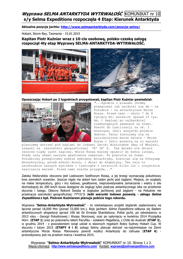 Wyprawa SELMA ANTARKTYDA WYTRWAŁOŚĆ KOMUNIKAT nr 10 s/y Selma Expeditions rozpoczęła 4 Etap: Kierunek Antarktyda Aktualna pozycja jachtu: http://www.selmaantarktyda.com/pozycja-selmy/ Hobart, Storm Bay, Tasmania - 15.01.2015 Kapitan Piotr Kuźniar wraz z 10-cio osobową, polsko-czeską załogą rozpoczął 4ty etap Wyprawy SELMA-ANTARKTYDA-WYTRWAŁOŚĆ. Opuszczając Hobart po 2 tygodniach przygotowań, kapitan Piotr Kuźniar powiedział: "...Zgodnie z planami chcemy pożeglować jak najdalej się da - na Południe - na antarktyczne Morze Rossa. Przed nami - około 7 do 8 tysięcy Mil morskich (ponad 14 tys. km. ) żeglugi po najbardziej niedostępnych akwenach na Ziemi. Powrót do cywilizacji za ok. 3 miesiące, jeśli wszystko pójdzie dobrze. Teraz kierujemy się na najzimniejsze morze świata - Morze Rossa i jeśli pozwolą na to warunki planujemy dotrzeć pod żaglami do lodowej Zatoki Wielorybów (Bay of Whales), leżącej na szerokości geograficznej 78º 38' S. Tak daleko nie dotarł jeszcze nigdy jacht żaglowy. Morze Rossa musimy opuścić do końca lutego, wtedy cały akwen zaczyna gwałtownie zamarzać. Po powrocie na Ocean Południowy pożeglujemy wzdłuż wybrzeży Antarktydy, kierując się na Półwysep Antarktyczny, potem wokoło Hornu, i dalej do Argentyny. Ten rejs to zwieńczenie naszych wysiłków i treningów z ostatnich kilku lat i oczywiście realizacja marzeń. Przed nami wielka przygoda..." Zatoka Wielorybów otoczona jest Lodowcem Szelfowym Rossa, a jej brzegi wyznaczają południowy kres ziemskich oceanów. Jeszcze nigdy nie dotarł tam żaden jacht pod żaglami. Miejsce, ze względu na niskie temperatury, góry i kry lodowe, gwałtowne, nieprzewidywalne zamarzanie i wiatry o sile dochodzącej do 200 km/h bywa dostępne do żeglugi tylko podczas antarktycznego lata na przełomie stycznia i lutego. Obecny Rekord Świata w żegludze jachtowej pod żaglami - na Południe nie przekracza szerokości geograficznej: 77º51'S. Jeśli warunki lodowe pozwolą - załoga Selma Expeditions z kpt. Piotrem Kuźniarem planuje pobicie tego rekordu. Wyprawa "Selma-Antarktyda-Wytrwałość" - to wieloetapowy projekt żeglarski zaplanowany na łącznie ponad 18,000 Mm (ponad 33,000 km.). Rejs jachtem Selma Expeditions odbywa się śladem antarktycznych ekspedycji sprzed 100 lat Sir Ernesta Shackletona. Polski jacht, po odwiedzeniu w 2013 roku - Georgii Południowej i Wyspy Słoniowej, oraz po opłynięciu w kwietniu 2014 Przylądka Horn (ETAP 1) oraz po pokonaniu latem Pacyfiku - szlakiem Magellana, z Chile do Australii (ETAP 2), w grudniu 2014 - z powodzeniem wziął udział w sławnych regatach Rolex Sydney Hobart Cup. W styczniu i lutym 2015 (ETAPY 4 i 5) załoga Selmy planuje dotrzeć na najzimniejsze na Ziemi antarktyczne Morze Rossa. Planowany powrót wzdłuż Antarktydy do Ushuaia (ETAP 6) przewidywany jest na przełom marca i kwietnia 2015. Wyprawa: "Selma-Antarktyda-Wytrwałość" KOMUNIKAT nr 10. Strona 1 z 2. Więcej informacji: http://www.selmaexpeditions.com/ Kontakt: [email protected] Wyprawa SELMA ANTARKTYDA WYTRWAŁOŚĆ KOMUNIKAT nr 10 s/y Selma Expeditions rozpoczęła 4 Etap: Kierunek Antarktyda Raport z pokładu s/y Selma Expeditions, Storm Bay, okolice Tasmanii. 18.00 czasu lokalnego, 15.01.2015 O 10.50 czasu lokalnego rzuciliśmy cumy w marinie w Hobart. Kierunek Antarktyda. Mamy dobry wiatr SW do 20 węzłów, za 24h spodziewamy się silnych wiatrów z zachodu ok. 40 w porywach do 50 węzłów (ok. 95 km/h). Idzie duży niż z zachodu. Według prognoz - sztorm potrwa ok. 2-3dni. Przyzwoita pogoda jak na Ocean Południowy :) Musimy szybko przyzwyczaić się do rozchwianego morza. Do bariery paku Lodowego antarktycznego Morza Rossa mamy około 10 dni, ale wszystko zależy od pogody. Załoga szybko przełączyła się na tryb rejsowy. "...Wracamy do normalności..." - przekazał kpt. Piotr Kuźniar Więcej informacji o załodze, jachcie i wyprawie: www.SelmaAntarktyda.com oraz na stronach ŻAGLI, na antenie radiowej Jedynki oraz w TVP SPORT. Aktualna pozycja jachtu: http://www.selmaantarktyda.com/pozycja-selmy/ UWAGA: © Publikacja załączonych informacji i materiałów foto dozwolona nieodpłatnie na wszystkich polach eksploatacji, pod warunkiem podpisania: "Źródło: Selma Expeditions.com". Zgoda nie obejmuje wykorzystania na cele reklamowe. Podpisy pod załączonymi zdjęciami: Fot. Krzysztof Jasica, SelmaExpeditions.com; oraz Tony McKendrick, Hobart for SelmaExpeditions.com Opracowanie J.J. Cieliszak Koordynator, Media - Wyprawa: SELMA - ANTARKTYDA - WYTRWAŁOŚĆ MediaPartners.pl dla SelmaAntarktyda.com Najnowsze publikacje: o nowym etapie SELMY - piszą obecnie między innymi: ROZHLAS.CZ: Plachetnice Selma s českými a polskými polárníky zaútočí na světový rekord. LINK: http://m.rozhlas.cz/zpravy/clovek/_zprava/plachetnice-selma-s-ceskymi-apolskymi-polarniky-zautoci-na-svetovy-rekord--1443318 ŻAGLE http://www.zagle.com.pl/wydarzenia/selma-expeditions-wyrusza-namorze-rossa-wideo,1_15388.html POLSKIE RADIO (1) http://www.polskieradio.pl/7/15/Artykul/1352916,Selmarusza-na-podboj-Antarktydy TVN 24 http://www.tvn24.pl/wroclaw,44/polacy-plyna-na-antarktyde-bypobic-rekord-swiata,505873.html JACHTING http://www.jachting.pl/artykul/07-01-2015/sydney-hobart-cojeszcze Radio Pomorza i Kujaw: Rozpoczyna się najtrudniejszy etap Wyprawy Selma - Antarktyda - Wytrwałość http://www.radiopik.pl/4,25420,rozpoczyna-sienajtrudniejszy-etap-wyprawy-selma Wyprawa: "Selma-Antarktyda-Wytrwałość" KOMUNIKAT nr 10. Strona 2 z 2. Więcej informacji: http://www.selmaexpeditions.com/ Kontakt: [email protected]