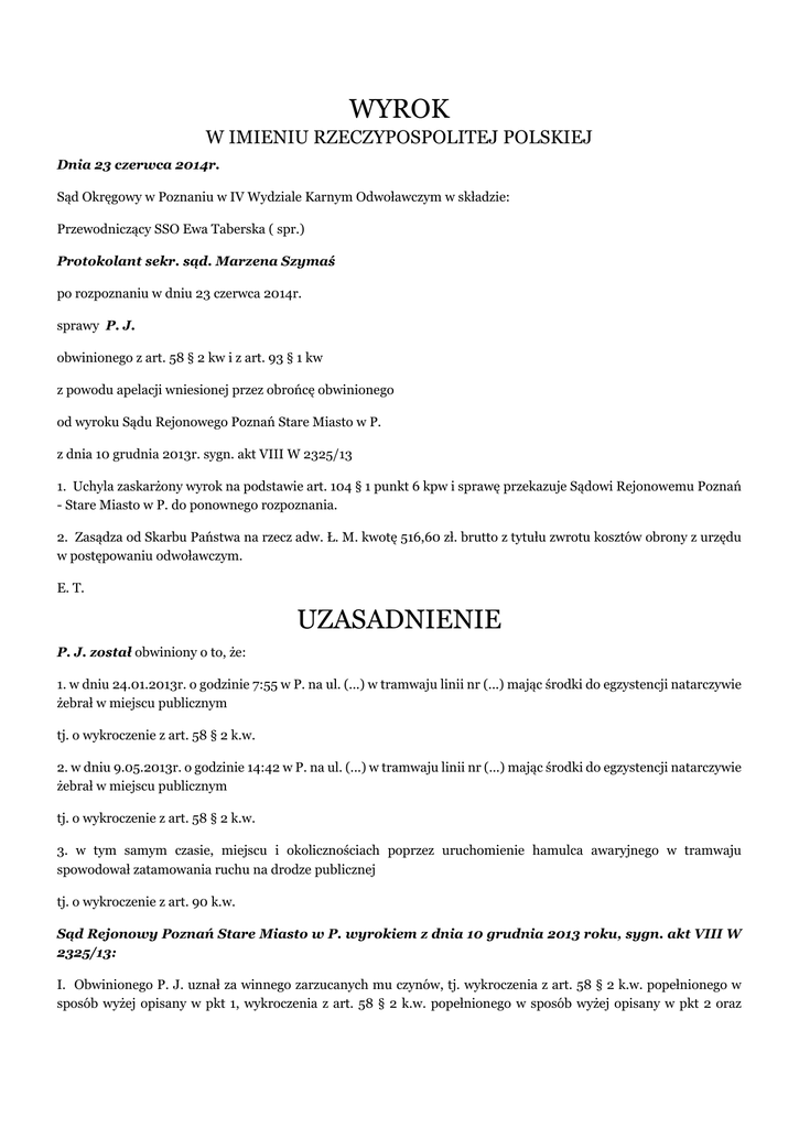 WYROK W IMIENIU RZECZYPOSPOLITEJ POLSKIEJ Dnia 23 czerwca 2014r. Sąd Okręgowy w Poznaniu w IV Wydziale Karnym Odwoławczym w składzie: Przewodniczący SSO Ewa Taberska ( spr.) Protokolant sekr. sąd. Marzena Szymaś po rozpoznaniu w dniu 23 czerwca 2014r. sprawy P. J. obwinionego z art. 58 § 2 kw i z art. 93 § 1 kw z powodu apelacji wniesionej przez obrońcę obwinionego od wyroku Sądu Rejonowego Poznań Stare Miasto w P. z dnia 10 grudnia 2013r. sygn. akt VIII W 2325/13 1. Uchyla zaskarżony wyrok na podstawie art. 104 § 1 punkt 6 kpw i sprawę przekazuje Sądowi Rejonowemu Poznań - Stare Miasto w P. do ponownego rozpoznania. 2. Zasądza od Skarbu Państwa na rzecz adw. Ł. M. kwotę 516,60 zł. brutto z tytułu zwrotu kosztów obrony z urzędu w postępowaniu odwoławczym. E. T. UZASADNIENIE P. J. został obwiniony o to, że: 1. w dniu 24.01.2013r. o godzinie 7:55 w P. na ul. (...) w tramwaju linii nr (...) mając środki do egzystencji natarczywie żebrał w miejscu publicznym tj. o wykroczenie z art. 58 § 2 k.w. 2. w dniu 9.05.2013r. o godzinie 14:42 w P. na ul. (...) w tramwaju linii nr (...) mając środki do egzystencji natarczywie żebrał w miejscu publicznym tj. o wykroczenie z art. 58 § 2 k.w. 3. w tym samym czasie, miejscu i okolicznościach poprzez uruchomienie hamulca awaryjnego w tramwaju spowodował zatamowania ruchu na drodze publicznej tj. o wykroczenie z art. 90 k.w. Sąd Rejonowy Poznań Stare Miasto w P. wyrokiem z dnia 10 grudnia 2013 roku, sygn. akt VIII W 2325/13: I. Obwinionego P. J. uznał za winnego zarzucanych mu czynów, tj. wykroczenia z art. 58 § 2 k.w. popełnionego w sposób wyżej opisany w pkt 1, wykroczenia z art. 58 § 2 k.w. popełnionego w sposób wyżej opisany w pkt 2 oraz wykroczenia z art. 90 k.w. popełnionego w sposób wyżej opisany w pkt 3 i za to na podstawie art. 58 § 2 kw. w zw. z art. 9 § 2 k.w. wymierzył mu karę grzywny w kwocie 500 (pięćset) złotych. II. Na podstawie art. 119 k.p.w. zw. z art. 624§ 1 kpk zwolnił obwinionego od kosztów sądowych i od opłaty. Apelację od powyższego wyroku złożył obrońca obwinionego z urzędu wyznaczony dopiero po wydaniu wyroku i zarzucił błąd w ustaleniach faktycznych przyjętych za podstawę orzeczenia, polegający na dowolnym uznaniu, że swoim zachowaniem obwiniony wypełnił znamiona wykroczeń z art. 58 § 2 kw i art. 90 kw, podczas gdy prawidłowa ocena zgromadzonego materiału dowodowego, uwzględniająca zasady doświadczenia życiowego, nie daje podstaw do poczynienia takich ustaleń. Podnosząc ten zarzut obrońca wniósł o zmianę zaskarżonego wyroku i uniewinnienie oskarżonego, ewentualnie o uchylenie zaskarżonego wyroku i przekazanie sprawy Sądowi Rejonowemu do ponownego rozpoznania. Sąd Okręgowy zważył, co następuje: Apelacja okazała się potrzebna i zasadnym jest wniosek o uchylenie zaskarżonego wyroku i przekazanie sprawy do ponownego rozpoznania, lecz nie z przyczyn wskazanych przez obronę. Zdaniem Sądu Okręgowego bowiem już na początku niniejszego postępowania pojawiła się informacja, że obwiniony P. J. może być osobą niewidomą lub niedowidzącą, albowiem postrzegany był jako „żebrzący„ niewidomy pasażer i posługiwał się legitymacją osoby niepełnosprawnej wydaną przez (...) do Spraw Orzekania o Niepełnosprawności. – np. K. 50. Brak reakcji sądu z urzędu na tę okoliczność skutkował tym, iż obwiniony został pozbawiony obligatoryjnej obrony przewidzianej w art. 21 § 1 pkt 2 kpw. Obwinionemu bowiem nie został wyznaczony obrońca, a sprawa w dniu 10 grudnia 2013r. została rozpoznana bez obecności obwinionego oraz jego obrońcy (nie posiadał go). Na marginesie zaznaczyć także należy, że zgodnie z treścią art. 93 § 4 kpw nie jest dopuszczalne postępowanie nakazowe, jeżeli zachodzą okoliczności określone w art. 21 § 1 kpw. Wprawdzie w niniejszej sprawie obwiniony złożył sprzeciw od wyroku nakazowego, lecz treść art. 93 § 4 kpw umknęła uwadze Sądu Rejonowego. Ostatecznie po wydaniu nieprawomocnego wyroku zaocznego zostało niezbicie ustalone, że obwiniony posiada orzeczenie o znacznym stopniu niepełnosprawności z uwagi na stwierdzone niego schorzenie narządu wzroku Na gruncie k.p.w. należy przyjąć, że upośledzenia zmysłów wskazane w § 1 pkt 1 powinny być takie, iż bądź to znoszą one funkcjonowanie danego zmysłu, a tym samym uniemożliwiają obronę (zob. postanowienie SN z dnia 10 marca 1997 r., III KKN 155/96, Prok. i Pr.-wkł. 1997, nr 7-8, poz. 8), bądź też ograniczają ich funkcjonowanie w tak znacznym stopniu, że czynią nad wyraz trudne realizowanie samodzielnie przez obwinionego swej obrony i uniemożliwiają normalny kontakt sądu z tym podmiotem. Należy bowiem zauważyć, iż w odróżnieniu od k.p.k., który zakłada także możliwość obrony niezbędnej, gdy sąd uzna to za konieczne ze względu na okoliczności utrudniające obronę (art. 79 § 2 k.p.k.), co pozwala przyjąć, że upośledzenia nielikwidujące w pełni danego zmysłu mogą być jednak kwalifikowane jako inna podstawa do obrony obligatoryjnej, w k.p.w. nie ma takiej możliwości. Należy zatem, jak się wydaje, nieco inaczej podejść do tego powodu obrony niezbędnej niż na gruncie procedury karnej i nie ograniczać go wyłącznie do pełnej niemoty, ślepoty czy głuchoty. Tylko inne, mniejsze upośledzenia omawianych zmysłów, jeżeli utrudniają obwinionemu samodzielną obronę, mogą uzasadniać powołanie mu obrońcy z urzędu jedynie w ramach art. 22, tj. z uwagi na interes wymiaru sprawiedliwości, przy wykazaniu wszak przezeń swej niezamożności. (Tomasz Grzegorczyk, Komentarz do art. 21 Kodeksu postępowania w sprawach o wykroczenia – LEX). Jak to trafnie stwierdził Sąd Okręgowy w treści postanowienia z dnia 3 marca 2014r. w niniejszej sprawie – sygn. IV Kz 94/14 – stwierdzone i udokumentowane schorzenie obwinionego, obligowało Sąd Rejonowy do wyznaczenia dla 