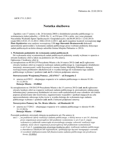 Pabianice dn. 22.02.2013r AKW.1711.3.2013 Notatka służbowa Zgodnie z art.17 ustawy z dn. 24 kwietnia 2003r o działalności pożytku publicznego i o wolontariacie (tekst jednolity: z 2010r Dz. U. nr.234 poz.1536 z późn. zm.) oraz pismami Naczelnika Wydziału Spraw Społecznych i Gospodarczych z dn.06.09.2012r i 12.02.2013r (znak:SSG-I.8141.15.12.2012 i SSG-I.8141.4.2013- zał. nr.1) inspektor kontroli wewnętrznej mgr Piotr Kęskiewicz oraz audytor wewnętrzny UM mgr Sławomir Bratuszewski dokonali sprawdzenia sprawozdań z wykonania zadania publicznego przez wybrane podmioty dotyczące zadań publicznych na które dotacje udzieliła Gmina Miejska Pabianice w 2012r. 1. Wyłonienie podmiotów do wykonania zadań publicznych Do wykonania niżej wymienionych zadań publicznych podmioty zostały wybrane w oparciu o otwarte konkursy ofert a także na podstawie art.19a ustawy. Ogłoszono 2 konkursy ofert tj: a) zarządzeniem nr.49/2012/P Prezydenta Miasta z dn.16 marca 2012r (zał. nr.2) ogłoszono otwarty konkurs ofert na wsparcie realizacji zadania publicznego tj. wspomaganie działalności instytucji, stowarzyszeń i osób fizycznych z terenu Gminy Miejskiej Pabianice służącej rozwiązywaniu problemów alkoholowych w wyniku którego do wykonania tego zadania publicznego wybrano 1 podmiot (zał. nr.3) z którym podpisano umowę: Stowarzyszenie Wzajemnej Pomocy „SZANSA” – ul.Traugutta 2 umowa nr.4/2012 – obejmująca wsparcie w/w zadania publicznego w okresie 01.06 31.12.2012r. Dotacja Miasta – 15.000zł b) zarządzeniem nr.130/2012/P Prezydenta Miasta z dn.15 czerwca 2012r (zał. nr.4) ogłoszono otwarty konkurs ofert na wsparcie realizacji zadania publicznego tj. prowadzenie edukacyjnej, informacyjnej i pomocowej działalności na rzecz osób uzależnionych oraz członków ich rodzin poprzez promowanie idei trzeźwości, organizowanie wyjazdów i spotkań mających na celu upowszechnienie zdrowego trybu życia w wyniku którego do wykonania tego zadania publicznego wybrano 1 podmiot (zał. nr.5) z którymi podpisano umowę: Towarzystwo Pomocy im. Św. Brata Alberta – ul.Moniuszki 10 umowa nr.17/2012 – obejmująca wsparcie w/w zadania publicznego w okresie 01.08 31.12.2012r. Dotacja Miasta – 17.800zł Pozostałe podmioty otrzymały dotację na podstawie art.19a ustawy tj: ust.1 - „na podstawie oferty realizacji zadania publicznego, o której mowa w art.14, złożonej przez organizacje pozarządowe lub podmioty wymienione w art.3 ust.3, organ wykonawczy jednostki samorządu terytorialnego uznając celowość realizacji tego zadania, może zlecić organizacji pozarządowej lub podmiotom wymienionym w art.3 ust.3, z pominięciem otwartego konkursu ofert, realizację zadania publicznego o charakterze lokalnym lub regionalnym, spełniającego łącznie następujące warunki: 1) wysokość dofinansowania lub finansowania zadania publicznego nie przekracza kwoty 10.000zł; 2 2) zadanie publiczne ma być realizowane w okresie nie dłuższym niż 90 dni ust.6 - „łączna kwota środków finansowych przekazanych przez organ wykonawczy jednostki samorządu terytorialnego tej samej organizacji pozarządowej lub temu samemu podmiotowi wymienionemu w art.3 ust.3, w trybie określonym w ust.1, w danym roku kalendarzowym, nie może przekroczyć kwoty 20.000zł ust.7 – wysokość środków finansowych przyznanych przez organ wykonawczy jednostki samorządu terytorialnego w trybie, o którym mowa w ust.1, nie może przekroczyć 20% dotacji planowanych w roku budżetowym na realizację zadań publicznych przez organizacje pozarządowe oraz podmioty wymienione w art.3 ust.3 Na tą okoliczność zespół opiniujący w składzie: 1. Monika Szewczyk – naczelnik Wydziału SSiG 2. Waldemar Boryń – naczelnik Wydziału EKS 3. Ewa Smuga – kier. referatu Spraw Społecznych i Zdrowia 4. Krystyna Błoch – insp. w referacie Spraw Społecznych i Zdrowia sporządził protokół z rozpatrzenia i zaopiniowania ofert realizacji zadania publicznego tj. prowadzenia profilaktycznej działalności informacyjnej i edukacyjnej w zakresie rozwiązywania problemów alkoholowych, w szczególności dla dzieci i młodzieży, w tym prowadzenie pozalekcyjnych zajęć sportowych, a także działań na rzecz dożywiania dzieci uczestniczących w pozalekcyjnych programach opiekuńczo – wychowawczych i socjoterapeutycznych złożonych przez kluby sportowe z terenu gminy miejskiej Pabianice podpisany przez Prezydenta Miasta Pabianic (zał. nr.6). W wyniku postępowania zgodnego z art.19a ustawy zaproponowano dotacje zgodnie z załącznikiem do protokółu (pkt.VII protokołu) wśród których znalazł się również Pabianicki Klub Sportów Wodnych (PKSW). Pismem Prezydenta Miasta z dn.23.07.2012r (znak: SSGI.8141.15.8.2012) PKSW nie przyznano jednak dotacji ze względu na niezgłoszenie przez Klub wypoczynku dzieci do kuratora oświaty (zał. nr.7). Podpisano umowy z następującymi podmiotami: Uczniowski Klub Sportowy „KORONA” – ul.Żytnia 24 m.49 umowa nr.12/2012 – obejmująca wsparcie realizacji zadania publicznego pod nazwą „organizacja obozu sportowo – integracyjnego w Białymstoku dla dzieci i młodzieży z terenu gminy miejskiej Pabianice, w tym dla dzieci i młodzieży z rodzin patologicznych i zagrożonych patologią” w okresie 01.08 – 14.08.2012r Dotacja Miasta – 4.400zł Młodzieżowy Uczniowski Klub Sportowy „WŁÓKNIARZ” – ul.Grota Roweckiego 3 umowa nr.13/2012 – obejmująca wsparcie realizacji zadania publicznego pod nazwą „organizacja obozu integracyjnego – sportowego w Swornegacie dla dzieci i młodzieży z terenu gminy miejskiej Pabianice, w tym dla dzieci i młodzieży z rodzin patologicznych i zagrożonych patologią” w okresie 01.08 – 14.08.2012r Dotacja Miasta – 2.200zł Pabianickie Towarzystwo Koszykówki – ul.Grota Roweckiego 3 umowa nr.14/2012 – obejmująca wsparcie realizacji zadania publicznego pod nazwą „organizacja obozu integracyjneg