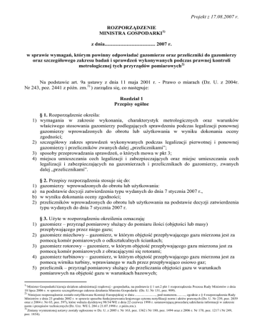 Projekt z 17.08.2007 r. ROZPORZĄDZENIE MINISTRA GOSPODARKI1) z dnia....................................... 2007 r. w sprawie wymagań, którym powinny odpowiadać gazomierze oraz przeliczniki do gazomierzy oraz szczegółowego zakresu badań i sprawdzeń wykonywanych podczas prawnej kontroli metrologicznej tych przyrządów pomiarowych2) Na podstawie art. 9a ustawy z dnia 11 maja 2001 r. - Prawo o miarach (Dz. U. z 2004r. Nr 243, poz. 2441 z późn. zm.3) ) zarządza się, co następuje: Rozdział 1 Przepisy ogólne 1) 2) 3) 4) 1) a) b) 2) § 1. Rozporządzenie określa: wymagania w zakresie wykonania, charakterystyk metrologicznych oraz warunków właściwego stosowania gazomierzy podlegających sprawdzeniu podczas legalizacji ponownej gazomierzy wprowadzonych do obrotu lub użytkowania w wyniku dokonania oceny zgodności; szczegółowy zakres sprawdzeń wykonywanych podczas legalizacji pierwotnej i ponownej gazomierzy i przeliczników zwanych dalej „przelicznikami”; sposoby przeprowadzania sprawdzeń, o których mowa w pkt 3; miejsca umieszczania cech legalizacji i zabezpieczających oraz miejsc umieszczania cech legalizacji i zabezpieczających na gazomierzach i przelicznikach do gazomierzy, zwanych dalej „przelicznikami”. § 2. Przepisy rozporządzenia stosuje się do: gazomierzy wprowadzonych do obrotu lub użytkowania: na podstawie decyzji zatwierdzenia typu wydanych do dnia 7 stycznia 2007 r., w wyniku dokonania oceny zgodności; przeliczników wprowadzonych do obrotu lub użytkowania na podstawie decyzji zatwierdzenia typu wydanych do dnia 7 stycznia 2007 r. § 3. Użyte w rozporządzeniu określenia oznaczają: 1) gazomierz – przyrząd pomiarowy służący do pomiaru ilości (objętości lub masy) przepływającego przez niego gazu; 2) gazomierz miechowy – gazomierz, w którym objętość przepływającego gazu mierzona jest za pomocą komór pomiarowych o odkształcalnych ściankach; 3) gazomierz rotorowy – gazomierz, w którym objętość przepływającego gazu mierzona jest za pomocą komór pomiarowych z obracającymi się rotorami; 4) gazomierz turbinowy – gazomierz, w którym objętość przepływającego gazu mierzona jest za pomocą wirnika turbiny, wprawianego w ruch przez przepływająco osiowo gaz; 5) przelicznik – przyrząd pomiarowy służący do przeliczania objętości gazu w warunkach pomiarowych na objętość gazu w warunkach bazowych; 1) Minister Gospodarki kieruje działem administracji rządowej - gospodarka, na podstawie § 1 ust.2 pkt 1 rozporządzenia Prezesa Rady Ministrów z dnia 18 lipca 2006 r. w sprawie szczegółowego zakresu działania Ministra Gospodarki (Dz. U. Nr 131, poz. 909). 2) Niniejsze rozporządzenie zostało notyfikowane Komisji Europejskiej w dniu ........................, pod numerem.........., zgodnie z § 4 rozporządzenia Rady Ministrów z dnia 23 grudnia 2002 r. w sprawie sposobu funkcjonowania krajowego sytemu notyfikacji norm i aktów prawnych (Dz. U. Nr 239, poz. 2039 oraz z 2004 r. Nr 65, poz. 597), które wdraża dyrektywę 98/34/WE z dnia 22 czerwca 1998 r. ustanawiającą procedurę udzielania informacji w zakresie norm i przepisów technicznych (Dz. Urz. WE L 204 z 21.07.1998 r. z późn.zm.). 3) Zmiany wymienionej ustawy zostały ogłoszone w Dz. U. z 2005 r. Nr 163, poz. 1362 i Nr 180, poz. 1494 oraz z 2006 r. Nr 170, poz. 1217 i Nr 249, poz. 1834). 6) strumień objętości – objętość gazu przepływającego przez gazomierz w przyjętej jednostce czasu; 7) strumień masy – masę gazu przepływającego przez gazomierz w przyjętej jednostce czasu; 8) warunki pomiarowe – temperaturę i ciśnienie gazu, w których mierzona jest objętość lub masa gazu; 9) warunki bazowe – temperaturę bazową, wybieraną z następujących wartości: 0 ºC, 15 ºC albo 20 ºC lub ciśnienie bazowe o wartości 101,325 kPa, do których przelicza się objętość gazu zmierzoną w warunkach pomiarowych; 10) warunki odniesienia – temperaturę odniesienia lub ciśnienie odniesienia przewidziane do badania lub wzajemnego porównywania wyników pomiarów gazomierza lub przelicznika; 11) warunki znamionowe użytkowania – warunki użytkowania, dla których zakłada się, że wartości błędów gazomierzy i przeliczników nie przekraczają wartości błędów granicznych dopuszczalnych; 12) ciśnienie robocze – różnicę pomiędzy ciśnieniem absolutnym gazu na wlocie gazomierza i ciśnieniem atmosferycznym; 13) przejściowy strumień objętości lub masy – strumień objętości lub masy, przy którym wartości błędów granicznych dopuszczalnych gazomierza zmieniają swoją wartość; 14) strata ciśnienia gazomierza – różnicę pomiędzy ciśnieniem zmierzonym na wlocie i na wylocie gazomierza podczas przepływu gazu; 15) błąd wskazania gazomierza – stosunek różnicy wielkości wskazanej przez gazomierz i wielkości poprawnej do wielkości poprawnej, wyrażony w procentach; 16) błąd wskazania przelicznika – wartość pierwiastka sumy kwadratów błędów cząstkowych parametrów wskazywanych przez przelicznik; 17) współczynnik konwersji – stosunek mierzonej objętości przepływającego przez gazomierz gazu w warunkach bazowych do objętości w warunkach pomiarowych; 18) zakres obciążeń pomiarowych gazomierza – zakres strumieni objętości lub masy gazomierza zawarty między maksymalnym a minimalnym strumieniem objętości lub masy; 19) zakresowość gazomierza – stosunek minimalnego strumienia objętości do maksymalnego strumienia objętości wyrażony w postaci cyfry 1, następującego po niej dwukropka oraz określonej liczby; 20) klasa dokładności gazomierza – klasę gazomierza spełniającego określone wymagania metrologiczne, którego błędy wskazań zawarte są w wyznaczonych granicach; 21) objętość cykliczna – objętość gazu przepływającego w czasie jednego cyklu pracy gazomierza, w czasie gdy wszystkie ruchome elementy mechanizmu pomiarowego, z wyłączeniem urz