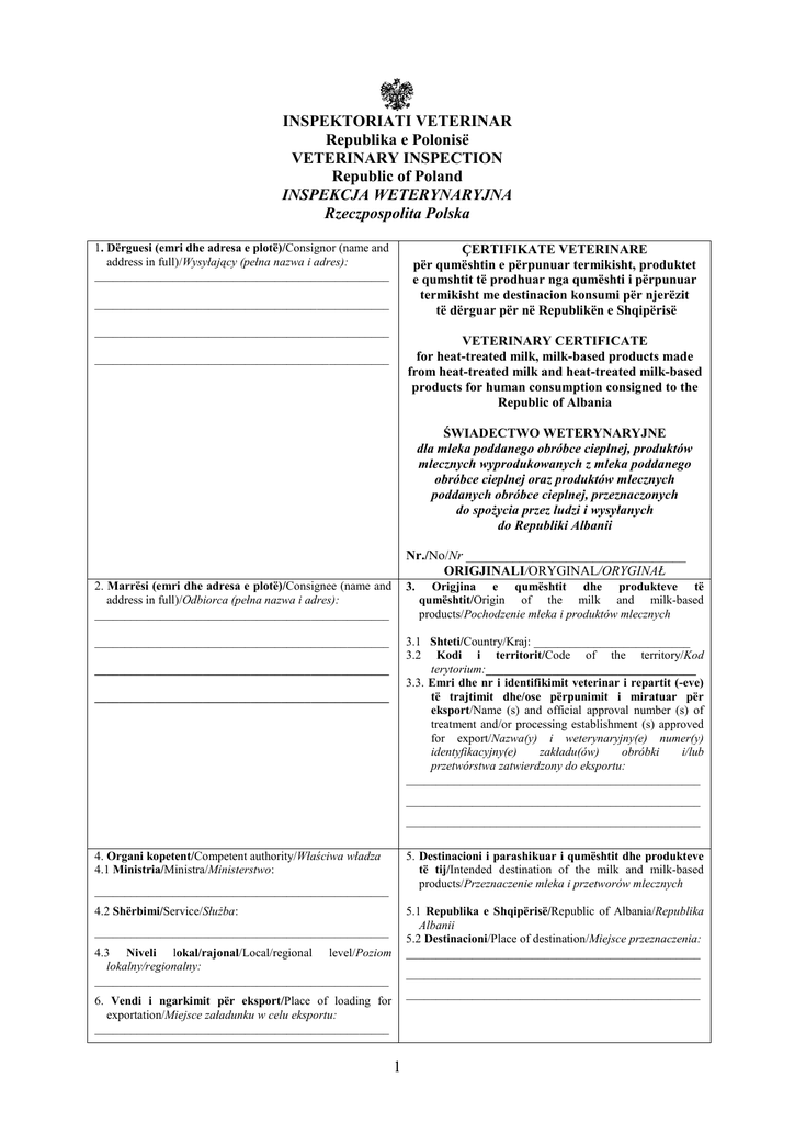 INSPEKTORIATI VETERINAR Republika e Polonisë VETERINARY INSPECTION Republic of Poland INSPEKCJA WETERYNARYJNA Rzeczpospolita Polska 1. Dërguesi (emri dhe adresa e plotë)/Consignor (name and address in full)/Wysyłający (pełna nazwa i adres): _________________________________________________ ÇERTIFIKATE VETERINARE për qumështin e përpunuar termikisht, produktet e qumshtit të prodhuar nga qumështi i përpunuar termikisht me destinacion konsumi për njerëzit të dërguar për në Republikën e Shqipërisë _________________________________________________ _________________________________________________ VETERINARY CERTIFICATE for heat-treated milk, milk-based products made from heat-treated milk and heat-treated milk-based products for human consumption consigned to the Republic of Albania _________________________________________________ ŚWIADECTWO WETERYNARYJNE dla mleka poddanego obróbce cieplnej, produktów mlecznych wyprodukowanych z mleka poddanego obróbce cieplnej oraz produktów mlecznych poddanych obróbce cieplnej, przeznaczonych do spożycia przez ludzi i wysyłanych do Republiki Albanii Nr./No/Nr _________________________________ ORIGJINALI/ORYGINAL/ORYGINAŁ 2. Marrësi (emri dhe adresa e plotë)/Consignee (name and address in full)/Odbiorca (pełna nazwa i adres): _________________________________________________ 3. _________________________________________________ 3.1 Shteti/Country/Kraj: __________________________ 3.2 Kodi i territorit/Code of the territory/Kod terytorium:___________________________________ 3.3. Emri dhe nr i identifikimit veterinar i repartit (-eve) të trajtimit dhe/ose përpunimit i miratuar për eksport/Name (s) and official approval number (s) of treatment and/or processing establishment (s) approved for export/Nazwa(y) i weterynaryjny(e) numer(y) identyfikacyjny(e) zakładu(ów) obróbki i/lub przetwórstwa zatwierdzony do eksportu: _________________________________________________ _________________________________________________ _________________________________________________ Origjina e qumështit dhe produkteve të qumështit/Origin of the milk and milk-based products/Pochodzenie mleka i produktów mlecznych _________________________________________________ _________________________________________________ 4. Organi kopetent/Competent authority/Właściwa władza 4.1 Ministria/Ministra/Ministerstwo: 5. Destinacioni i parashikuar i qumështit dhe produkteve të tij/Intended destination of the milk and milk-based products/Przeznaczenie mleka i przetworów mlecznych _________________________________________________ 4.2 Shërbimi/Service/Służba: 5.1 Republika e Shqipërisë/Republic of Albania/Republika Albanii 5.2 Destinacioni/Place of destination/Miejsce przeznaczenia: _________________________________________________ _________________________________________________ 4.3 Niveli lokal/rajonal/Local/regional level/Poziom lokalny/regionalny: _________________________________________________ _________________________________________________ _________________________________________________ 6. Vendi i ngarkimit për eksport/Place of loading for exportation/Miejsce załadunku w celu eksportu: _________________________________________________ 1 7. Mjeti i transportit dhe identifikimi i ngarkesës/Means of transport and consignment identification/Środki transportu i specyfikacja przesyłki: 7.3 Detajet e identifikimit të ngarkesës/Consignment identification details/Szczegóły identyfikacyjne przesyłki: _________________________________________________ _________________________________________________ 7.1 kamion, vagon treni, anije ose avion/lorry, rail-wagon, ship/or aircraft/samochód ciężarowy, wagon kolejowy, statek lub samolot _________________________________________________ _________________________________________________ 7.2 Numri i targës, emri i anijes ose numri i _________________________________________________ fluturimit/Registration number(s), ship’s name or flight _________________________________________________ number/Numer(y) rejestracyjny(e), nazwa statku lub numer _________________________________________________ lotu:_________________________________________ 8. Identifikimi i qumështit dhe produkteve të tij/Identification of the milk and milk-based products/Identyfikacja mleka i produktów mlecznych 8.1 Qumësht nga/Milk from/Mleko od _____________________________________________________________________________________________________ (lloji i kafshës/animal species/gatunki zwierząt) 8.2 Numri i kodit (nëse kërkohet)/Code number (as appropriate)/Numer kodu (w stosownych przypadkach) _________________________________________________________________________________________________ 8.3 Paketimi/Packaging/Opakowanie: ___________________________________________________________________ 8.4 Numri i njësive të paketimit/Number of packaging units/Liczba opakowań: ________________________________________________________________________________ 8.5 Pesha neto/Net weight/Waga netto: __________________________________________________________________ 8.6 Numri i plumbosjes/Number of seal/Numer plomby: ___________________________________________________________________________________________________ 9. Çertifikata shëndetësore/Health and public health attestation/Poświadczenie zdrowia Unë, i nënshkruari, mjek veteriner shtetëror vërtetoj se/ I, the undersigned official veterinarian, hereby certify that/ Ja, niżej podpisany urzędowy lekarz weterynarii, niniejszym zaświadczam, że: 9.1 Ngarkesa plotëson rekomandimet e Kodit të Shëndetit të Kafshëve O.I.E./The consignment is in compliance with the Terrestrial Animal Health Code (OIE)/Przesyłka spełnia rekomendacje zawarte w Kodeksie zdrowia zwierząt lądowych OIE. 9.2 Qumështi dhe produktet e qumështit gjatë prodhimit, paketimit, magazinimit dhe procedurave të tjera iu nënshtruan kontrollit, në mënyrë të tillë që të shkatërrohej çdo m