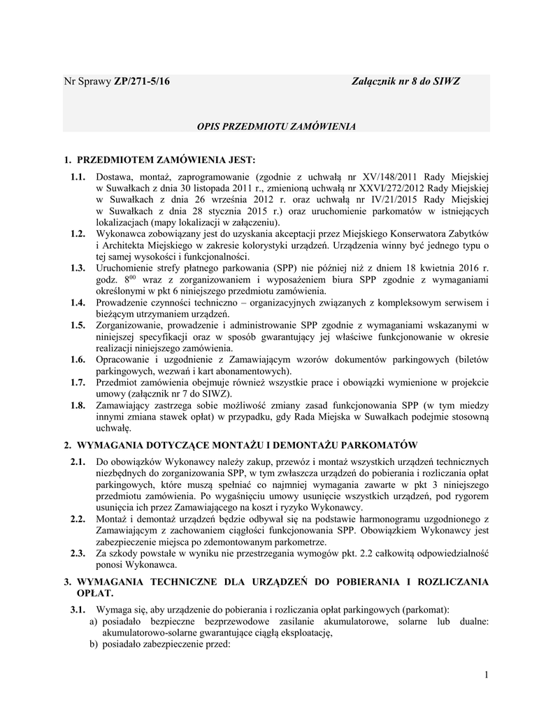 Załącznik nr 8 do SIWZ Nr Sprawy ZP/271-5/16 OPIS PRZEDMIOTU ZAMÓWIENIA 1. PRZEDMIOTEM ZAMÓWIENIA JEST: 1.1. 1.2. 1.3. 1.4. 1.5. 1.6. 1.7. 1.8. Dostawa, montaż, zaprogramowanie (zgodnie z uchwałą nr XV/148/2011 Rady Miejskiej w Suwałkach z dnia 30 listopada 2011 r., zmienioną uchwałą nr XXVI/272/2012 Rady Miejskiej w Suwałkach z dnia 26 września 2012 r. oraz uchwałą nr IV/21/2015 Rady Miejskiej w Suwałkach z dnia 28 stycznia 2015 r.) oraz uruchomienie parkomatów w istniejących lokalizacjach (mapy lokalizacji w załączeniu). Wykonawca zobowiązany jest do uzyskania akceptacji przez Miejskiego Konserwatora Zabytków i Architekta Miejskiego w zakresie kolorystyki urządzeń. Urządzenia winny być jednego typu o tej samej wysokości i funkcjonalności. Uruchomienie strefy płatnego parkowania (SPP) nie później niż z dniem 18 kwietnia 2016 r. godz. 800 wraz z zorganizowaniem i wyposażeniem biura SPP zgodnie z wymaganiami określonymi w pkt 6 niniejszego przedmiotu zamówienia. Prowadzenie czynności techniczno – organizacyjnych związanych z kompleksowym serwisem i bieżącym utrzymaniem urządzeń. Zorganizowanie, prowadzenie i administrowanie SPP zgodnie z wymaganiami wskazanymi w niniejszej specyfikacji oraz w sposób gwarantujący jej właściwe funkcjonowanie w okresie realizacji niniejszego zamówienia. Opracowanie i uzgodnienie z Zamawiającym wzorów dokumentów parkingowych (biletów parkingowych, wezwań i kart abonamentowych). Przedmiot zamówienia obejmuje również wszystkie prace i obowiązki wymienione w projekcie umowy (załącznik nr 7 do SIWZ). Zamawiający zastrzega sobie możliwość zmiany zasad funkcjonowania SPP (w tym miedzy innymi zmiana stawek opłat) w przypadku, gdy Rada Miejska w Suwałkach podejmie stosowną uchwałę. 2. WYMAGANIA DOTYCZĄCE MONTAŻU I DEMONTAŻU PARKOMATÓW 2.1. 2.2. 2.3. Do obowiązków Wykonawcy należy zakup, przewóz i montaż wszystkich urządzeń technicznych niezbędnych do zorganizowania SPP, w tym zwłaszcza urządzeń do pobierania i rozliczania opłat parkingowych, które muszą spełniać co najmniej wymagania zawarte w pkt 3 niniejszego przedmiotu zamówienia. Po wygaśnięciu umowy usunięcie wszystkich urządzeń, pod rygorem usunięcia ich przez Zamawiającego na koszt i ryzyko Wykonawcy. Montaż i demontaż urządzeń będzie odbywał się na podstawie harmonogramu uzgodnionego z Zamawiającym z zachowaniem ciągłości funkcjonowania SPP. Obowiązkiem Wykonawcy jest zabezpieczenie miejsca po zdemontowanym parkometrze. Za szkody powstałe w wyniku nie przestrzegania wymogów pkt. 2.2 całkowitą odpowiedzialność ponosi Wykonawca. 3. WYMAGANIA TECHNICZNE DLA URZĄDZEŃ DO POBIERANIA I ROZLICZANIA OPŁAT. 3.1. Wymaga się, aby urządzenie do pobierania i rozliczania opłat parkingowych (parkomat): a) posiadało bezpieczne bezprzewodowe zasilanie akumulatorowe, solarne lub akumulatorowo-solarne gwarantujące ciągłą eksploatację, b) posiadało zabezpieczenie przed: dualne: 1 fałszowaniem biletów parkingowych, kradzieżą i wandalizmem, c) akceptowało uiszczenie opłat monetami NBP na czas zależny od wniesionej opłaty, pobór opłat w systemie liniowym, d) akceptowało monety o nominałach 10 gr, 20 gr, 50 gr, 1 zł, 2 zł i 5 zł, e) minimalny opłacony czas postoju poprzez wykupienie biletu wynosi 30 minut, f) posiadało blokadę otworu wrzutowego monet przed wlotem innych przedmiotów, g) spełniało wymagania określone w obowiązujących normach w zakresie: bezpieczeństwa, odporności na uszkodzenia mechaniczne (wandalizm) tj. obudowa powinna być wykonana ze stali nierdzewnej lub blachy stalowej zabezpieczonej przed korozją grubości min. 2 mm, część przednia powinna umożliwiać umieszczenie trwałych i czytelnych informacji o systemie pobierania opłat oraz innych istotnych dla kierowcy informacjach, niezakłóconego działania i wytrzymałości w trakcie pracy na otwartej przestrzeni w strefie klimatycznej przy temperaturze od -25oC do +55oC i wilgotności względnej powietrza do 95%, h) posiadało na obudowie czytelne etykiety z informacjami o stawkach opłat parkingowych, dniach i godzinach obowiązywania opłat w SPP, wszelkie niezbędne informacje zapewniające poprawną obsługę, oraz w przypadku obsługi urządzenia w więcej niż jednym języku możliwość zmiany napisów na wyświetlaczu w każdym z obsługiwanych języków. Parkomat musi rozliczać należność według stawek zgodnych z obowiązującą uchwałą, i) było wyposażone w czytelną instrukcję obsługi urządzenia wskazującą „krok po kroku” kolejność działań niezbędnych do wniesienia opłaty, numer telefonu do biura SPP, oraz informację o stanie urządzenia (np. parkomat niesprawny), j) umożliwiało operację kontrolną (bez konieczności otwierania obudowy) za pomocą żetonu kontrolnego, której efektem powinien być wydruk lub bilet kontrolny potwierdzający poprawność funkcjonowania urządzenia, k) dokumentowało wpływy z tytułu parkowania, czas opłaconego parkowania oraz: liczbę wydanych biletów, sumę przychodów od ostatniej kolekcji, sumę przychodów w parkometrze od początku uruchomienia, informację o statusie każdego automatu – sprawny, niesprawny (poprzez informację na wyświetlaczu), meldunek o rodzaju usterki (np. brak papieru, awaria), l) drukowało bilet parkingowy potwierdzający wniesienie opłaty, informujący o dacie, czasie rozpoczęcia i zakończenia parkowania, miejscu parkowania (numer parkomatu, nazwa ulicy), kolejnym numerze biletu (zapisanym w postaci alfanumerycznej), wysokości przyjętej wpłaty, sposobie umieszczenia go w pojeździe oraz numerze kontaktowym do biura SPP, m) zapewniało, poprzez właściwą technologię druku (drukarka termiczna) oraz właściwości papieru, trwałą i pełną czytelność informacji wydrukowanych na bilecie przez okres minimum 5 lat, tak aby bilet mógł, w całym tym okresie służyć jako dowód księgowy, n) umożli