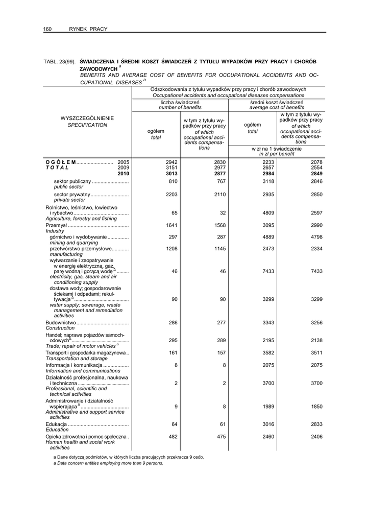 160 RYNEK PRACY TABL. 23(99). ŚWIADCZENIA I ŚREDNI KOSZT ŚWIADCZEŃ Z TYTUŁU WYPADKÓW PRZY PRACY I CHORÓB a ZAWODOWYCH BENEFITS AND AVERAGE COST OF BENEFITS FOR OCCUPATIONAL ACCIDENTS AND OCa CUPATIONAL DISEASES Odszkodowania z tytułu wypadków przy pracy i chorób zawodowych Occupational accidents and occupational diseases compensations liczba świadczeń średni koszt świadczeń number of benefits average cost of benefits w tym z tytułu wyWYSZCZEGÓLNIENIE padków przy pracy w tym z tytułu wyogółem SPECIFICATION padków przy pracy of which ogółem occupational accitotal of which dents compensaoccupational accitotal tions dents compensations w zł na 1 świadczenie in zl per benefit O G Ó Ł E M .......................... 2005 TOTAL 2009 2010 sektor publiczny .......................... public sector sector prywatny ........................... private sector Rolnictwo, leśnictwo, łowiectwo i rybactwo ....................................... Agriculture, forestry and fishing Przemysł ........................................... Industry górnictwo i wydobywanie ............... mining and quarrying przetwórstwo przemysłowe............ manufacturing wytwarzanie i zaopatrywanie w energię elektryczną, gaz, Δ parę wodną i gorącą wodę ......... electricity, gas, steam and air conditioning supply dostawa wody; gospodarowanie ściekami i odpadami; rekulΔ tywacja ......................................... water supply; sewerage, waste management and remediation activities Budownictwo ..................................... Construction Handel; naprawa pojazdów samochodowychΔ .............................................. Trade; repair of motor vehicles Δ Transport i gospodarka magazynowa .. Transportation and storage Informacja i komunikacja .................. Information and communications Działalność profesjonalna, naukowa i techniczna ......................................... Professional, scientific and technical activities Administrowanie i działalność Δ wspierająca .................................. Administrative and support service activities Edukacja ........................................... Education Opieka zdrowotna i pomoc społeczna . Human health and social work activities 2942 3151 3013 2830 2977 2877 2233 2657 2984 2078 2554 2849 810 767 3118 2846 2203 2110 2935 2850 65 32 4809 2597 1641 1568 3095 2990 297 287 4889 4798 1208 1145 2473 2334 46 46 7433 7433 90 90 3299 3299 286 277 3343 3256 295 289 2195 2138 161 157 3582 3511 8 8 2075 2075 2 2 3700 3700 9 8 1989 1850 64 61 3016 2833 482 475 2460 2406 a Dane dotyczą podmiotów, w których liczba pracujących przekracza 9 osób. a Data concern entities employing more than 9 persons.