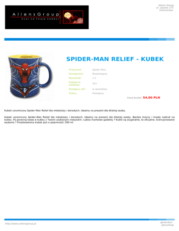 Aliens Group ul. Lipowa 17C Inowrocław SPIDER-MAN RELIEF - KUBEK Producent: Spider-Man Dostępność: Niedostępny Wysokość: 1:1 Kategoria wiekowa: 16+ Dostępny od*: w sprzedaży Status: Dostępny Cena brutto: 54,00 PLN Kubek ceramiczny Spider-Man Relief dla młodzieży i dorosłych. Idealny na prezent dla bliskiej osoby. Kubek ceramiczny Spider-Man Relief dla młodzieży i dorosłych. Idealny na prezent dla bliskiej osoby. Bardzo mocny i trwały nadruk na kubku. Pij poranną kawę w kubku z Twoim ulubionym motywem. Lubisz markowe gadżety ? Kubki są oryginalne, to oficjalne, licencjonowane wydanie ! Przedstawiony kubek jest o pojemności 300 ml http://www.aliensgroup.pl generator: aptusshop