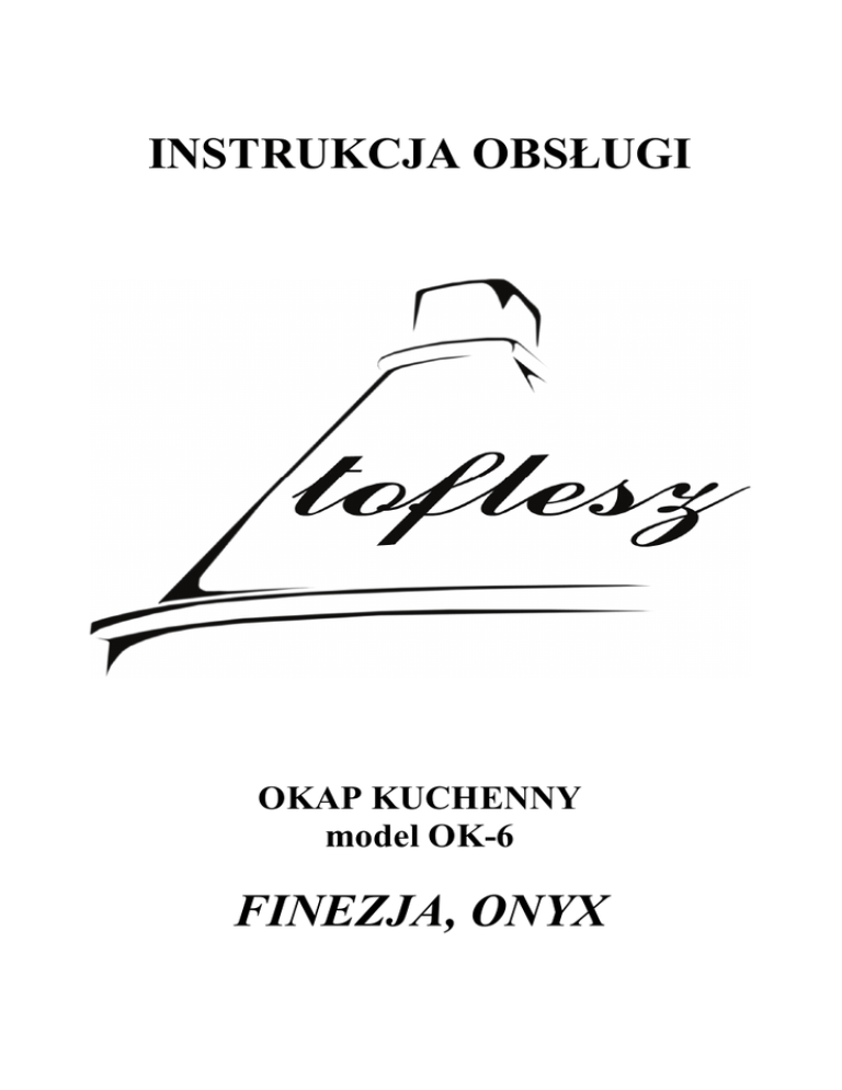 INSTRUKCJA OBSŁUGI OKAP KUCHENNY model OK-6 FINEZJA, ONYX Szanowny Kliencie Staliście się Państwo właścicielami najnowszej generacji okapu kuchennego serii OK - 6. Okap ten został zaprojektowany i wykonany specjalnie z myślą o spełnieniu Państwa oczekiwań i z pewnością będzie stanowić część nowocześnie wyposażonej kuchni. Zastosowane w nim nowoczesne rozwiązania konstrukcyjne i użycie najnowszej technologii produkcji, zapewniają mu wysoką funkcjonalność i estetykę. Przed przystąpieniem do montażu okapu prosimy o dokładne zapoznanie się z treścią niniejszej instrukcji. Dzięki temu unikną Państwo błędnej instalacji i obsługi okapu. Życzymy satysfakcji i zadowolenia z wyboru okapu firmy Toflesz. CHARAKTERYSTYKA Okap kuchenny służy do usuwania oparów kuchennych. Jest on przeznaczony do użytku domowego. Okap wymaga zainstalowania przewodu odprowadzającego powietrze na zewnątrz. Po zainstalowaniu filtra z węglem aktywnym okap może pracować jako pochłaniacz zapachów. W tym przypadku nie wymaga się instalacji przewodu odprowadzającego powietrze na zewnątrz. Okap jest urządzeniem elektrycznym wykonanym w II klasie ochrony przeciwporażeniowej. Posiada niezależne oświetlenie LEDowe oraz wentylator wyciągowy z możliwością ustawienia jednej z sześciu prędkości obrotowych. Okap przeznaczony jest do trwałego zamontowania na pionowej ścianie ponad kuchenką gazową lub elektryczną. DANE TECHNICZNE Napięcie zasilania: 230V ~50Hz Ilość silników wentylatora: 1 Ilość filtrów aluminiowych: 1 Oświetlenie: LED 2x1,8 W Ilość stopni prędkości: 6 Szerokość: 600 / 800 / 900 mm Średnica wylotu: Ø120mm Maksymalna wydajność: 650 m3/h Maksymalny pobór mocy: 139W Poziom głośności: 30 - 56 dB(A) Rodzaj pracy: wyciąg lub pochłaniacz 2 RYSUNEK TECHNICZNY 260 350 240 400 Æ120 455 560 FIERA 420 600/800 260 350 240 400 Æ120 455 560 SOLAR 42 0 600/800 3 WARUNKI EKSPLOATACJI Okap kuchenny służy do usuwania oparów kuchennych na zewnątrz, należy go zatem podłączyć do odpowiedniego kanału wentylacyjnego (nie wolno podłączać okapu do kanałów kominowych, dymowych lub spalinowych będących w eksploatacji). Urządzenie należy zamontować na wysokości nie niższej niż 650mm od elektrycznej płyty kuchennej i 700mm od kuchni gazowej. Pod okapem nadkuchennym nie wolno pozostawiać odkrytego płomienia; podczas zdejmowania naczyń znad palnika, należy ustawić płomień minimalny. Potrawy przygotowywane na tłuszczach powinny być stale nadzorowane, ponieważ nagrzany tłuszcz może się łatwo zapalić. Filtr przeciw tłuszczowy do okapu kuchennego należy czyścić przynajmniej raz na dwa miesiące gdyż nasycony tłuszczem jest łatwopalny. Przed każdą operacją czyszczenia, wymianą filtra lub przed podjęciem prac naprawczych należy wyjąć wtyczkę urządzenia z gniazdka elektrycznego. Jeżeli w pomieszczeniu, oprócz okapu, eksploatuje się inne urządzenia o zasilaniu nieelektrycznym (np. grzejniki przepływowe, piece na paliwa ciekłe, termy) należy zadbać o wystarczającą wentylację (dopływ świeżego powietrza). MONTAŻ Przed przystąpieniem do montażu okapu na ścianie należy podłączyć go do sieci elektrycznej (230V ~50Hz) w celu sprawdzenia czy oświetlenie i silnik działają prawidłowo. W celu zamontowania okapu należy wykonać następujące czynności: 1) Zawiesić korpus okapu na wkręconych uprzednio w ścianę kołkach rozporowych (Ø8mm). 2) Podłączyć okap do otworu odprowadzającego powietrze na zewnątrz za pomocą elastycznego przewodu o średnicy Ø120mm. 3) Jeżeli okap ma pracować jako pochłaniacz zapachów należy zainstalować filtr węglowy pomijając punkt 2). 4 4) W odległości kilku centymetrów poniżej sufitu należy przykręcić do ściany opaskę łączeniową komina używając do tego celu wkrętów i kołków rozporowych. 5) W zależności od potrzeb włożyć do komina zewnętrznego komin wewnętrzny i zainstalować je na korpusie okapu, następnie wysunąć komin wewnętrzny na wybraną wysokość. Górę komina należy przykręcić blachowkrętami do opaski łączeniowej. 6) Podłączyć okap do sieci elektrycznej. Po zainstalowaniu okapu powinien być zapewniony w miarę łatwy dostęp do gniazda elektrycznego w celu awaryjnego wyjęcia wtyczki i przerwania zasilania urządzenia. WYBÓR TRYBU PRACY OKAPU KUCHENNEGO Ustawienie wyciągowego trybu pracy urządzenia W trakcie wyciągowego trybu pracy okapu powietrze odprowadzane jest na zewnątrz specjalnym przewodem (Ø120mm). Przy tym ustawieniu należy usunąć ewentualne filtry węglowe. Ustawienie trybu pracy okapu jako pochłaniacz zapachów W tej opcji przefiltrowane powietrze wraca z powrotem do pomieszczenia poprzez obustronne otwory wycięte w maskownicy teleskopowej. Przy tym ustawieniu należy zamontować filtry węglowe. Prędkość wentylatora Prędkość najniższą i średnią należy stosować przy normalnych warunkach oraz małym natężeniu oparów. Natomiast prędkość najwyższą należy stosować tylko przy dużym stężeniu oparów kuchennych, np. podczas grillowania bądź smażenia. 5 OBSŁUGA OKAPU Bezpieczeństwo przy użytkowaniu Zawsze należy sprawdzać czy płomień nie wykracza poza naczynie gdyż powoduje to niepotrzebną stratę energii i niebezpieczną koncentrację ciepła. Nie należy używać okapu do celów niezgodnych z jego przeznaczeniem (np. do gastronomi przemysłowej). Obsługa panelu sterowania Działanie okapu jest kontrolowane za pomocą elektronicznego przełącznika dotykowego: Sensory przełącznika reagują na dotkniecie palcem oznaczonej za pomocą piktogramów powierzchni szkła na panelu przednim okapu. Pojedyncze dotkniecie rysunku spowoduje włączenie urządzenia, natomiast jego powtórne lub podwójne dotknięcie sprawi, że okap się wyłączy. Dotykanie tego symbolu służyć będzie również do obsługi funkcji „Timer” oraz zaprogramowania bieżącego