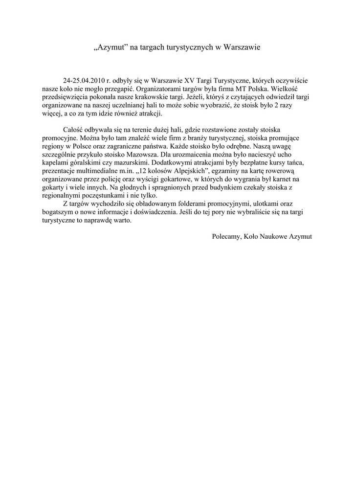„Azymut” na targach turystycznych w Warszawie 24-25.04.2010 r. odbyły się w Warszawie XV Targi Turystyczne, których oczywiście nasze koło nie mogło przegapić. Organizatorami targów była firma MT Polska. Wielkość przedsięwzięcia pokonała nasze krakowskie targi. Jeżeli, któryś z czytających odwiedził targi organizowane na naszej uczelnianej hali to może sobie wyobrazić, że stoisk było 2 razy więcej, a co za tym idzie również atrakcji. Całość odbywała się na terenie dużej hali, gdzie rozstawione zostały stoiska promocyjne. Można było tam znaleźć wiele firm z branży turystycznej, stoiska promujące regiony w Polsce oraz zagraniczne państwa. Każde stoisko było odrębne. Naszą uwagę szczególnie przykuło stoisko Mazowsza. Dla urozmaicenia można było nacieszyć ucho kapelami góralskimi czy mazurskimi. Dodatkowymi atrakcjami były bezpłatne kursy tańca, prezentacje multimedialne m.in. „12 kolosów Alpejskich”, egzaminy na kartę rowerową organizowane przez policję oraz wyścigi gokartowe, w których do wygrania był karnet na gokarty i wiele innych. Na głodnych i spragnionych przed budynkiem czekały stoiska z regionalnymi poczęstunkami i nie tylko. Z targów wychodziło się obładowanym folderami promocyjnymi, ulotkami oraz bogatszym o nowe informacje i doświadczenia. Jeśli do tej pory nie wybraliście się na targi turystyczne to naprawdę warto. Polecamy, Koło Naukowe Azymut