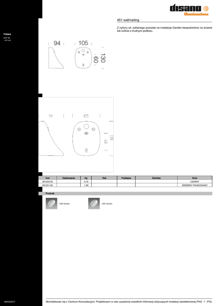 451 wall/ceiling Z nylonu wł. szklanego pozwala na instalacje Garden bezpośrednio na ścianie lub suficie o trudnym podłożu. Pobierz DXF 2D - 451.dxf Kod Okablowanie Kg Wat Podstawa Źarówka Kolor 991250-00 0,16 CZARNY 991251-00 1,98 SREBRNY PIASKOWANY Products - 1280 Garden 08/03/2017 - 1287 Garden Skontaktować się z Centrum Konsultacyjno- Projektowym w celu uzyskania wszelkich informacji dotyczących instalacji oświetleniowej. PAG 1 - POL