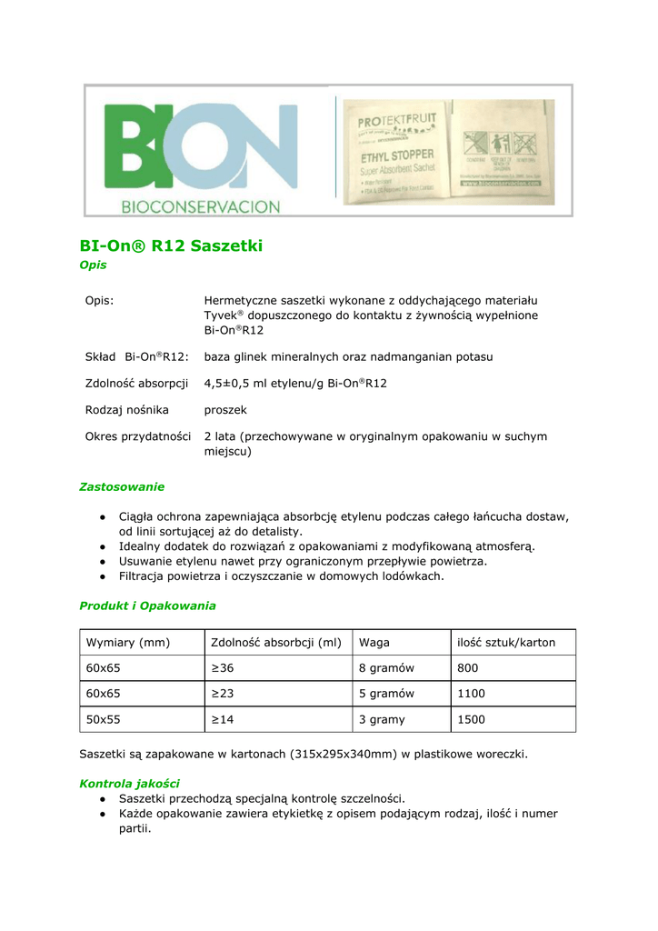 BI-On® R12 Saszetki Opis Opis: Hermetyczne saszetki wykonane z oddychającego materiału ® Tyvek dopuszczonego do kontaktu z żywnością wypełnione ® Bi-OnR12 ® Skład Bi-On R12: baza glinek mineralnych oraz nadmanganian potasu Zdolność absorpcji ® 4,5±0,5 ml etylenu/g Bi-On R12 Rodzaj nośnika proszek Okres przydatności 2 lata (przechowywane w oryginalnym opakowaniu w suchym miejscu) Zastosowanie ● ● ● ● Ciągła ochrona zapewniająca absorbcję etylenu podczas całego łańcucha dostaw, od linii sortującej aż do detalisty. Idealny dodatek do rozwiązań z opakowaniami z modyfikowaną atmosferą. Usuwanie etylenu nawet przy ograniczonym przepływie powietrza. Filtracja powietrza i oczyszczanie w domowych lodówkach. Produkt i Opakowania Wymiary (mm) Zdolność absorbcji (ml) Waga ilość sztuk/karton 60x65 ≥36 8 gramów 800 60x65 ≥23 5 gramów 1100 50x55 ≥14 3 gramy 1500 Saszetki są zapakowane w kartonach (315x295x340mm) w plastikowe woreczki. Kontrola jakości ● Saszetki przechodzą specjalną kontrolę szczelności. ● Każde opakowanie zawiera etykietkę z opisem podającym rodzaj, ilość i numer partii.
