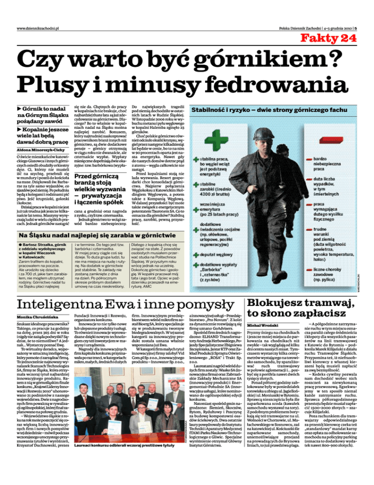 www.dziennikzachodni.pl Polska Dziennik Zachodni | 4–5 grudnia 2010 | 5 Fakty 24 Czy warto być górnikiem? Plusy i minusy fedrowania b Górnik to nadal na Górnym Śląsku pożądany zawód b Kopalnie jeszcze wiele lat będą dawać dobrą pracę Aldona Minorczyk-Cichy O świcie mieszkańców katowickiego Giszowca i innych górniczych osiedli obudziły orkiestry dęte. Ci, którzy nie musieli iść na szychtę, przebrali się w mundury i poszli do kościoła na msze. Dziękowali św. Barbarze za tyle samo wyjazdów, co zjazdów pod ziemię. Po południu będą z kolegami i rodzinami pić piwo. Jeść krupnioki, golonki i kołocze. Dzisiaj praca w kopalni nie jest już tak trudna jak jeszcze kilkanaście lat temu. Maszyny wyręczają ludzi w wielu ciężkich pracach. Jednak górników zastąpić się nie da. Chętnych do pracy w kopalniach nie brakuje, choć najbardziej tłuste lata są już zdecydowanie za górnictwem. Dlaczego? Bo to właśnie w kopalniach nadal na Śląsku można najlepiej zarobić. Bonusem, który najtrudniej zaakceptować pracownikom branż innych niż górnictwo, są dwie dodatkowe pensje – górnicy otrzymują w ciągu roku nie dwanaście, ale czternaście wypłat. Wypłaty miesięczne dopełniają dwie okazyjne: tzw. barbórkowa (wypła- Przed górniczą branżą stoją wielkie wyzwania – prywatyzacja i łączenie spółek cana 4 grudnia) oraz nagroda z zysku, czyli tzw. czternastka. Jednak górnictwo to wciąż zawód bardzo niebezpieczny. Do największych tragedii pod ziemią dochodziło w ostatnich latach w Rudzie Śląskiej. W listopadzie 2006 roku w wybuchu metanu i pyłu węglowego w kopalni Halemba zginęło 23 górników. Choć polskie górnictwo również odczuło skutki kryzysu, węgiel przez następne kilkadziesiąt lat będzie w cenie, bo to na nim w 90 procentach oparta jest nasza energetyka. Nawet gdy do naszych domów dotrze prąd z atomu – węgla całkowicie nie zastąpi. Przed kopalniami stoją nie lada wyzwania. Resort gospodarki chce konsolidacji górnictwa. Najpierw połączenia Węglokoksu z Katowickim Holdingiem Węglowym, a potem także z Kompanią Węglową. W dalszej przyszłości być może także związek z energetycznym potentatem Tauronem SA. Co to oznacza dla górników? Stabilną pracę, zarobki, pewną przyszłość. Stabilność i ryzyko – dwie strony górniczego fachu Na Śląsku nadal najlepiej się zarabia w górnictwie i w terminie. Do tego jest tzw. barbórka i czternastka. W mojej pracy ciągle coś się dzieje. To duża grupa ludzi, tu nie ma miejsca na nudę i rutynę. Na dodatek w górnictwie jest stabilnie. Te zakłady nie zostaną zamknięte z dnia na dzień. Po półrocznym okresie próbnym dostałem umowę na czas nieokreślony. Dlatego z kopalnią chcę się związać na stałe. Z powodów osobistych musiałem przerwać studia na Politechnice Śląskiej. W przyszłym roku wrócę jednak na uczelnię. Dokończę górnictwo i geologię. W kopalni pracował mój tata i jego brat. Ojciec w październiku przeszedł na emeryturę. AMC MAREK MICHALSKI a Bartosz Strzałka, górnik z oddziału wydobywczego w kopalni Wieczorek w Katowicach: Zanim trafiłem do kopalni, pracowałem na poczcie. Ale urodziło się dziecko i za 700 zł, jakie tam zarabiałem, nie mogłem utrzymać rodziny. Górnictwo nadal tu na Śląsku płaci najlepiej Inteligentna Ewa i inne pomysły Szukasz idealnego pracownika? Takiego, co pracuje 24 godziny na dobę, przez 365 dni w roku i nigdy nie zażąda podwyżki? Sądzisz, że to niemożliwe? A jednak... Wystarczy poznać Ewę. To wirtualny doradca, wyposażony w sztuczną inteligencję, który pomoże ci zarządzać firmą. To jednocześnie najnowszy wynalazek Stanusch Technologies SA, firmy ze Śląska, która otrzymała wczoraj tytuł najbardziej innowacyjnego produktu. Razem z nią w górnośląskim finale konkursu „Krajowi Liderzy Innowacji i Rozwoju 2010” uhonorowano 21 podmiotów z naszego województwa. Dwie z nagrodzonych firm powalczą w rywalizacji ogólnopolskiej, której finał zaplanowano na połowę grudnia. – Województwo śląskie z roku na rok może poszczycić się coraz większą liczbą innowacyjnych firm i nowych pomysłów w tej dziedzinie – mówił podczas wczorajszego uroczystego przyznawania tytułów i wyróżnień, Krzysztof Duchnowski, prezes Fundacji Innowacji i Rozwoju, organizatora konkursu. Innowacje to nie tylko nowe lub ulepszone produkty i usługi. To również innowacje wprowadzane dzięki nowym technologiom czy też inwestycjom w maszyny i urządzenia. Nagrody dla innowacyjnych firm kapituła konkursu przyznawała po raz trzeci, w kategoriach: mikro, małych, średnich i dużych firm. Innowacyjnym przedsiębiorstwem wśród mikrofirm został Bioerg SA, który specjalizuje się w produkowaniu tworzyw biodegradowalnych. W tej samej kategorii za innowacyjny produkt została uznana właśnie wspomniana już Ewa. W kategorii firm małych tytuł innowacyjnej firmy zdobył Vid Com.pl Sp. z o.o., innowacyjnego produktu – Innowator Sp. z o.o., FOT. MARZENA BUGAŁA Monika Chruścińska Laureaci konkursu odbierali wczoraj prestiżowe tytuły a innowacyjnej usługi – Przedsiębiorstwo „Pro Novum”. Z kolei za dynamicznie rozwijającą się firmę uznano GoAdvisers. Spośród firm średnich nagrodzono: ELHAND Transformatory Andrzeja Herbowskiego, Pojazdy Specjalistyczne Zbigniewa Szczęśniaka, Jantar KTP oraz Zakład Produkcji Sprzętu Oświetleniowego „ROSA” i Trakt Sp. z o.o. Laureatami nagród wśród dużych firm zostały: Wasko SA (innowacyjna firma) oraz Zabrzańskie Zakłady Mechaniczne SA (innowacyjny produkt) i Energomontaż-Południe SA (innowacyjna usługa), które nominowano do ogólnopolskiej edycji konkursu. Natomiast spośród gmin nagrodzono: Ślemień, Skoczów, Bytom, Rydułtowy i Pszczynę za budowę kompostowni osadów ściekowych. Dwa ostatnie laury powędrowały do Instytutu Techniki i Aparatury Medycznej ITAM i Parku Naukowo-Tec