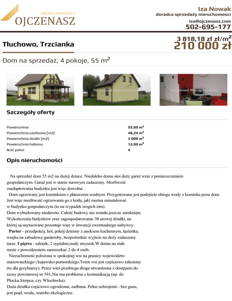 Iza Nowak doradca sprzedaży nieruchomosci [email protected] 502-695-177 3 818,18 zł zł/m2 210 000 zł Tłuchowo, Trzcianka Dom na sprzedaż, 4 pokoje, 55 m2 Szczegóły oferty Powierzchnia 55,00 m2 Powierzchnia użytkowa [m2] 48,24 m2 Powierzchnia działki [m2] 3 000 m2 Powierzchnia balkonu 12,00 m2 Ilość pokoi 4 Opis nieruchomości Na sprzedaż dom 55 m2 na dużej dziace. Niedaleko domu stoi duży garaż wraz z pomieszczeniem gospodarczym. Garaż jest w stanie surowym zadaszony. Możliwość zaadaptowania budynku jest więc dowolna . Dom ogrzewany jest kominkiem z płaszczem wodnym. Przygotowane jest podejście obiegu wody z kominka poza dom. Jest więc możliwość ogrzewania go z kotła, jaki można zainstalować w budynku gospodarczym (to na wypadek srogich zim). Dom wybudowany niedawno. Całość budowy nie została jeszcze zamknięta. Wykończenia budynków oraz zagospodarowanie 30 arowej działki, na której są usytuowane pozostaje więc w inwencji ewentualnego nabywcy. Parter - przedpokój, hol, pokój dzienny z aneksem kuchennym, łazienka, wnęka na zabudowę garderoby, bezpośrednie wyjście na duży zadaszony taras. I piętro - salonik, 2 sypialnie,mały stryszek.W domu na stałe może z powodzeniem zamieszkać 2 do 4 osób. Nieruchomość położona w spokojnej wsi na granicy województw mazowieckiego i kujawsko-pomorskiego.Teren wsi jest częściowo zalesiony (to dla grzybiarzy). Przez wieś przebiega droga utwardzona z dostępem do szosy powiatowej nr 541.Nie ma problemu z komunikacją (np. do Płocka,Sierpca, czy Włocławka). Duża działka częściowo ogrodzona, zadbana. Pełne uzbrojenie - bez gazu, jest prąd, woda, szambo ekologiczne. Nieruchomość Rodzaj domu wolnostojący Technologia budowlana suporeks Standard Ilość pięter w budynku 2 Wymiary działki 35m/85m m Garaż wolnostojący Okna nowe PCV Instalacje nowe Balkon jest Ilość balkonów 1 Ilość tarasów 1 Ukształtowanie działki płaska Kształt działki prostokąt Stan budynku do zamieszkania Ogrodzenie działki częściowo ogrodzona Rok budowy 2013 Gaz jest Woda tak Dojazd droga utwardzona Ogrzewanie kominkowe Tarasy taras Drzwi antywłamaniowe tak Rolety antywłamaniowe tak Prąd jest Kanalizacja oczyszczalnia ekologiczna