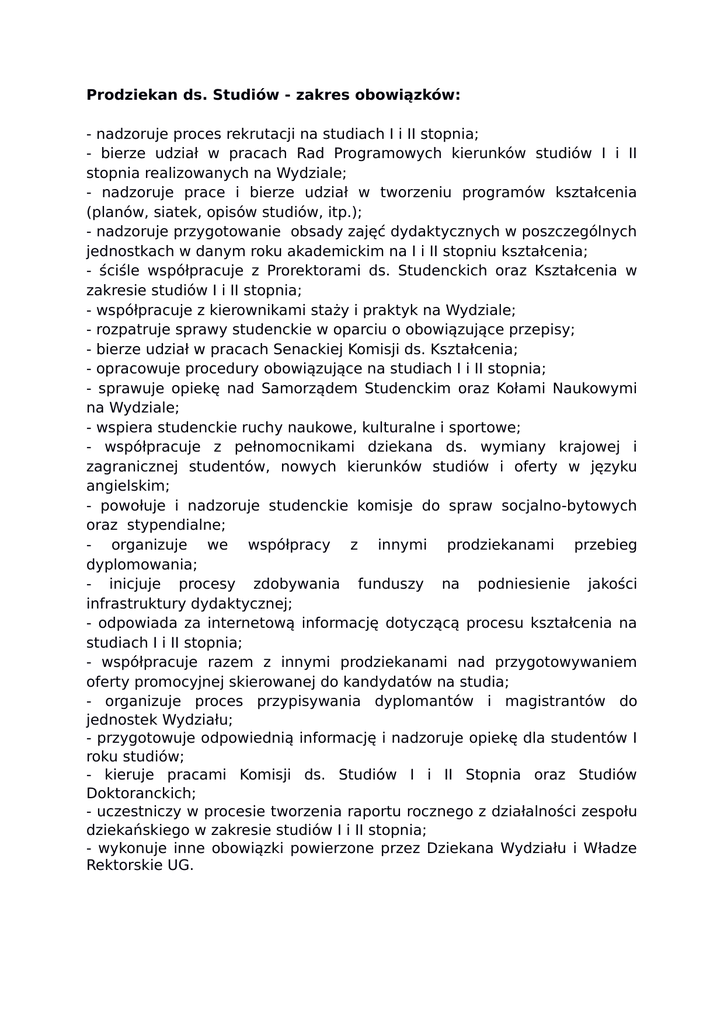Prodziekan ds. Studiów - zakres obowiązków: - nadzoruje proces rekrutacji na studiach I i II stopnia; - bierze udział w pracach Rad Programowych kierunków studiów I i II stopnia realizowanych na Wydziale; - nadzoruje prace i bierze udział w tworzeniu programów kształcenia (planów, siatek, opisów studiów, itp.); - nadzoruje przygotowanie obsady zajęć dydaktycznych w poszczególnych jednostkach w danym roku akademickim na I i II stopniu kształcenia; - ściśle współpracuje z Prorektorami ds. Studenckich oraz Kształcenia w zakresie studiów I i II stopnia; - współpracuje z kierownikami staży i praktyk na Wydziale; - rozpatruje sprawy studenckie w oparciu o obowiązujące przepisy; - bierze udział w pracach Senackiej Komisji ds. Kształcenia; - opracowuje procedury obowiązujące na studiach I i II stopnia; - sprawuje opiekę nad Samorządem Studenckim oraz Kołami Naukowymi na Wydziale; - wspiera studenckie ruchy naukowe, kulturalne i sportowe; - współpracuje z pełnomocnikami dziekana ds. wymiany krajowej i zagranicznej studentów, nowych kierunków studiów i oferty w języku angielskim; - powołuje i nadzoruje studenckie komisje do spraw socjalno-bytowych oraz stypendialne; - organizuje we współpracy z innymi prodziekanami przebieg dyplomowania; - inicjuje procesy zdobywania funduszy na podniesienie jakości infrastruktury dydaktycznej; - odpowiada za internetową informację dotyczącą procesu kształcenia na studiach I i II stopnia; - współpracuje razem z innymi prodziekanami nad przygotowywaniem oferty promocyjnej skierowanej do kandydatów na studia; - organizuje proces przypisywania dyplomantów i magistrantów do jednostek Wydziału; - przygotowuje odpowiednią informację i nadzoruje opiekę dla studentów I roku studiów; - kieruje pracami Komisji ds. Studiów I i II Stopnia oraz Studiów Doktoranckich; - uczestniczy w procesie tworzenia raportu rocznego z działalności zespołu dziekańskiego w zakresie studiów I i II stopnia; - wykonuje inne obowiązki powierzone przez Dziekana Wydziału i Władze Rektorskie UG.