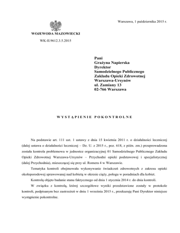 Warszawa, 1 października 2015 r. WOJEWODA MAZOWIECKI WK-II.9612.3.5.2015 Pani Grażyna Napierska Dyrektor Samodzielnego Publicznego Zakładu Opieki Zdrowotnej Warszawa-Ursynów ul. Zamiany 13 02-766 Warszawa WYSTĄPIENIE POKONTROLNE Na podstawie art. 111 ust. 1 ustawy z dnia 15 kwietnia 2011 r. o działalności leczniczej (dalej ustawa o działalności leczniczej – Dz. U. z 2015 r., poz. 618, z późn. zm.) przeprowadzona została kontrola problemowa w jednostce organizacyjnej 01 Samodzielnego Publicznego Zakładu Opieki Zdrowotnej Warszawa-Ursynów – Przychodni opieki podstawowej i specjalistycznej (dalej Przychodnia), mieszczącej się przy ul. Romera 4 w Warszawie. Tematyka kontroli obejmowała wykonywanie świadczeń zdrowotnych z zakresu opieki okołoporodowej sprawowanej nad kobietą w okresie ciąży, połogu w poradniach dla kobiet. Kontrolą objęto badanie stanu faktycznego od dnia 1 stycznia 2014 r. do dnia kontroli. W związku z kontrolą, której szczegółowe wyniki przedstawione zostały w protokole kontroli, podpisanym bez zastrzeżeń w dniu 1 września 2015 r., przekazuję Pani Dyrektor niniejsze wystąpienie pokontrolne. W trakcie kontroli ustalono, że Poradnia ginekologiczno-położnicza zapewniała realizację świadczeń opieki medycznej kobietom w okresie ciąży oraz połogu, poprzez: systematyczną ocenę stanu zdrowia ciężarnych kobiet oraz płodu, kierowanie na specjalistyczne konsultacje lekarskie, identyfikację czynników ryzyka okołoporodowego, propagowanie zdrowego stylu życia, praktyczne i teoretyczne przygotowanie do porodu, połogu, karmienia piersią oraz rodzicielstwa, a także wykonywanie badań kontrolnych w okresie połogu, zgodnie z wymogami określonymi w rozporządzeniu Ministra Zdrowia z dnia 20 września 2012 r. w sprawie standardów postępowania medycznego przy udzielaniu świadczeń zdrowotnych z zakresu opieki okołoporodowej sprawowanej nad kobietą w okresie fizjologicznej ciąży, fizjologicznego porodu, połogu oraz opieki nad noworodkiem (dalej rozporządzenie w sprawie standardów opieki okołoporodowej – Dz. U. z 2012 r., poz. 1100). Świadczenia zdrowotne z zakresu opieki okołoporodowej sprawowanej nad kobietą w ciąży realizowane były przez lekarza specjalistę w dziedzinie położnictwa i ginekologii oraz 2 lekarzy będących w trakcie odbywania specjalizacji w zakresie położnictwa i ginekologii. Ponadto opiekę medyczną sprawowały 4 położne, które odbyły kurs kwalifikacyjny w dziedzinie pielęgniarstwa rodzinnego – program dla położnych. W dokumentacji podmiotu leczniczego zgromadzono dokumenty potwierdzające prawo wykonywania zawodu aktualnie zatrudnionej kadry lekarskiej i położnych. Przychodnia, w strukturach której funkcjonuje kontrolowana Poradnia, zabezpieczała odpowiednie warunki lokalowe, kadrowe oraz sprzętowe umożliwiające właściwą organizację świadczeń z zakresu opieki okołoporodowej, zgodnie z wymogami ustalonymi w rozporządzeniu w sprawie standardów opieki okołoporodowej. Podmiot zapewniał możliwość wykonania badań ultrasonograficznych i kardiotokograficznych, natomiast badania laboratoryjne, cytologiczne i bakteriologiczne wykonywane były poza Przychodnią, na podstawie umowy zawartej z podwykonawcą. Dla kobiet ciężarnych ustalone zostały plany opieki przedporodowej, które uwzględniały procedury medyczne związane z opieką prenatalną wraz z określeniem terminu ich wykonania, zgodnie z wymogiem ustalonym w części IV załącznika do rozporządzenia w sprawie standardów opieki okołoporodowej. Plan opieki przedporodowej był odpowiednio modyfikowany przez osobę sprawującą opiekę prenatalną – w zależności od sytuacji zdrowotnej kobiety ciężarnej. Stwierdzono również, że podmiot prowadził szkołę rodzenia funkcjonującą w Przychodni przy ul. Na Uboczu 5 w Warszawie, w której prowadzone były zajęcia przygotowujące do porodu, połogu, pielęgnacji noworodka oraz do roli rodziców. Poradnia ginekologiczno-położnicza 2 realizowała także świadczenia promujące zdrowy styl życia, ze szczególnym uwzględnieniem tematyki związanej z okresem ciąży i połogu oraz karmieniem naturalnym. Przychodnia realizowała świadczenia zdrowotne w miejscu zamieszkania lub pobytu położnicy. Opiekę poporodową sprawowała położna środowiskowo-rodzinna podstawowej opieki zdrowotnej, która opieką patronażową objęła 985 położnic i 1019 noworodków. Położna środowiskowo-rodzinna wykonywała wizyty patronażowe, w czasie których oceniała stan zdrowia położnicy, relacje w rodzinie, warunki socjalno-bytowe oraz udzielała instruktażu na temat opieki nad noworodkiem, technik kąpieli, pielęgnacji skóry i kikuta pępowiny, a także motywowała do karmienia naturalnego i pomagała w rozwiązywaniu problemów związanych z laktacją. Położna informowała położnicę o potrzebie odbycia wizyty kontrolnej u lekarza ginekologa w 6. tygodniu połogu oraz o konieczności zgłaszania się z dzieckiem na szczepienia ochronne i badania profilaktyczne. W podmiocie umieszczono informację o prawach pacjenta, zgodnie z wymogiem określonym w art. 11 ust. 1 ustawy z dnia 6 listopada 2008 r. o prawach pacjenta i Rzeczniku Praw Pacjenta (Dz. U. z 2012 r., poz. 159, z późn. zm.). Przychodnia dysponowała dokumentacją potwierdzającą sprawność techniczną aparatury i sprzętu medycznego wykorzystywanego przy udzielaniu świadczeń medycznych, do której posiadania i okazania organowi kontroli podmiot jest zobowiązany na podstawie art. 90 ust. 6, 7 i 9 ustawy z dnia 20 maja 2010 r. o wyrobach medycznych (Dz. U. z 2015 r., poz. 876). Podmiot posiadał opracowane minimalne normy zatrudnienia pielęgniarek i położnych, które uwzględniały specyfikę kontrolowanych komórek organizacyjnych, zgodnie z wytycznymi określonymi w rozporządzeniu Ministra Zdrowia z dnia 28 grudnia 2012 r. w sprawie sposobu ustalania minimalnych norm zatrudnienia pie