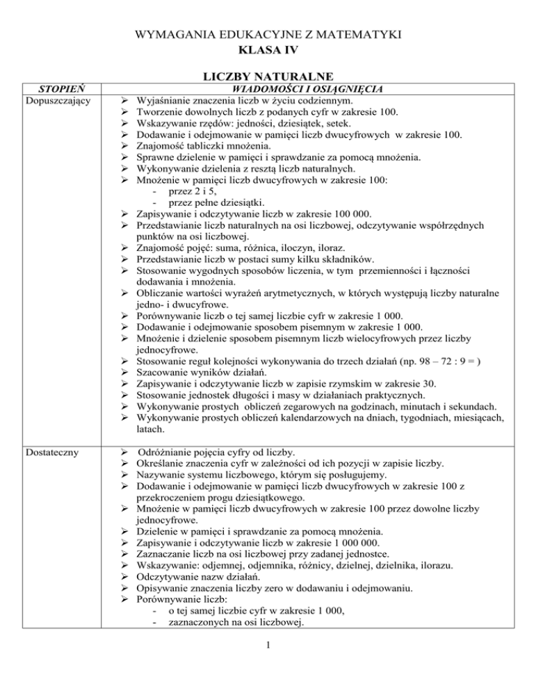 WYMAGANIA EDUKACYJNE Z MATEMATYKI KLASA IV LICZBY NATURALNE STOPIEŃ Dopuszczający Dostateczny WIADOMOŚCI I OSIĄGNIĘCIA Wyjaśnianie znaczenia liczb w życiu codziennym. Tworzenie dowolnych liczb z podanych cyfr w zakresie 100. Wskazywanie rzędów: jedności, dziesiątek, setek. Dodawanie i odejmowanie w pamięci liczb dwucyfrowych w zakresie 100. Znajomość tabliczki mnożenia. Sprawne dzielenie w pamięci i sprawdzanie za pomocą mnożenia. Wykonywanie dzielenia z resztą liczb naturalnych. Mnożenie w pamięci liczb dwucyfrowych w zakresie 100: - przez 2 i 5, - przez pełne dziesiątki. Zapisywanie i odczytywanie liczb w zakresie 100 000. Przedstawianie liczb naturalnych na osi liczbowej, odczytywanie współrzędnych punktów na osi liczbowej. Znajomość pojęć: suma, różnica, iloczyn, iloraz. Przedstawianie liczb w postaci sumy kilku składników. Stosowanie wygodnych sposobów liczenia, w tym przemienności i łączności dodawania i mnożenia. Obliczanie wartości wyrażeń arytmetycznych, w których występują liczby naturalne jedno- i dwucyfrowe. Porównywanie liczb o tej samej liczbie cyfr w zakresie 1 000. Dodawanie i odejmowanie sposobem pisemnym w zakresie 1 000. Mnożenie i dzielenie sposobem pisemnym liczb wielocyfrowych przez liczby jednocyfrowe. Stosowanie reguł kolejności wykonywania do trzech działań (np. 98 – 72 : 9 = ) Szacowanie wyników działań. Zapisywanie i odczytywanie liczb w zapisie rzymskim w zakresie 30. Stosowanie jednostek długości i masy w działaniach praktycznych. Wykonywanie prostych obliczeń zegarowych na godzinach, minutach i sekundach. Wykonywanie prostych obliczeń kalendarzowych na dniach, tygodniach, miesiącach, latach. Odróżnianie pojęcia cyfry od liczby. Określanie znaczenia cyfr w zależności od ich pozycji w zapisie liczby. Nazywanie systemu liczbowego, którym się posługujemy. Dodawanie i odejmowanie w pamięci liczb dwucyfrowych w zakresie 100 z przekroczeniem progu dziesiątkowego. Mnożenie w pamięci liczb dwucyfrowych w zakresie 100 przez dowolne liczby jednocyfrowe. Dzielenie w pamięci i sprawdzanie za pomocą mnożenia. Zapisywanie i odczytywanie liczb w zakresie 1 000 000. Zaznaczanie liczb na osi liczbowej przy zadanej jednostce. Wskazywanie: odjemnej, odjemnika, różnicy, dzielnej, dzielnika, ilorazu. Odczytywanie nazw działań. Opisywanie znaczenia liczby zero w dodawaniu i odejmowaniu. Porównywanie liczb: - o tej samej liczbie cyfr w zakresie 1 000, - zaznaczonych na osi liczbowej. 1 Obliczanie wartości wyrażeń arytmetycznych, w których występują liczby naturalne dwucyfrowe. Obliczanie drugiej i trzeciej potęgi liczby naturalnej w zakresie 100. Dodawanie i odejmowanie sposobem pisemnym liczb wielocyfrowych. Mnożenie i dzielenie sposobem pisemnym przez liczby dwucyfrowe. Dzielenie sposobem pisemnym w zakresie 1000 przez: - liczby dwucyfrowe bez zer w ilorazie, - pełne dziesiątki (10, 100, 30). Racjonalne wykorzystanie kalkulatora do działań. Obliczanie wartości wyrażeń arytmetycznych, w których występuję więcej niż dwa działania. Stosowanie reguł z uwzględnieniem nawiasu. Rozwiązywanie zadań tekstowych jednodziałaniowych z zastosowaniem odejmowania, dodawania, mnożenia i dzielenia pisemnego. Zapisywanie i odczytywanie liczb w zapisie rzymskim w zakresie do 100. Zamiana podstawowych jednostek długości i masy. Obliczanie upływu czasu. Dobry Uzasadnienie sposobu zapisu liczby w dziesiątkowym systemie pozycyjnym. Zapisywanie i odczytywanie liczb w zakresie powyżej miliona. Wyznaczanie odcinka jednostkowego i określanie współrzędnej punktu w prostych przypadkach. Wykonywanie dzielenia z resztą i sprawdzanie poprawności wykonywania dzielenia z resztą. Stosowania odejmowania jako działania odwrotnego do dodawania. Porównywanie liczb o różnej liczbie cyfr. Rozwiązywanie prostych równań. Sprawdzanie poprawności rozwiązywania równania. Obliczanie wartości wyrażeń arytmetycznych, w których występują liczby naturalne wielocyfrowe. Odczytywanie nazw działań. Wykorzystanie rozdzielności mnożenia względem dodawania lub odejmowania w praktycznym działaniu. Korzystanie z praw działań (przemienności, łączności, rozdzielności). Porównywanie ilorazowe, zapisywanie liczb k razy większych (mniejszych). Przedstawianie potęgi jako skróconego zapisu mnożenia. Przedstawianie liczby 100 i 1 000 jako potęgi liczby 10. Wykonywanie działań pisemnych na dowolnych liczbach naturalnych. Rozwiązywanie zadań tekstowych jedno- i dwudziałaniowych z zastosowaniem odejmowania, dodawania, mnożenia i dzielenia pisemnego. Obliczanie wartości wyrażeń arytmetycznych z uwzględnieniem kolejności wykonywania działań. Zapisywanie i odczytywanie liczb w zapisie rzymskim w zakresie tysiąca. Rozwiązywanie zadań uwzględniających jednostki długości i masy Rozwiazywanie prostych zadań uwzgledniających obliczenia czasowe. Bardzo dobry Zapisywanie i odczytywanie liczb w zakresie 1 000 000 000. Rozwiązywanie zadań tekstowych z zastosowaniem dzielenia z resztą. Obieranie odcinka jednostkowego w zależności od wielkości liczb, które chcemy zaznaczyć na osi liczbowej. Korzystanie z własności dodawania i mnożenia. Ustawianie kilku liczb w określonym porządku. Budowanie liczb na podstawie informacji o cyfrach tej liczby. Przedstawianie rozwiązania prostego zadania tekstowego za pomocą równania. 2 Obliczanie wartości wyrażeń arytmetycznych, w których występują liczby naturalne wielocyfrowe z zastosowaniem poznanych praw działań. Wyjaśnianie znaczenia liczby 1 w mnożeniu i dzieleniu. Zapisywanie działań opisanych słownie. Wskazywanie własności rozdzielności dzielenia względem dodawania i odejmowania. Zapisywanie iloczynu tych samych czynników jako potęgi. Zapisywanie liczby w postaci rozwinięcia według potęgi liczby 10. Sprawdzanie poprawności wykonywania działań. Mnożenie sposobem pisemnym w zakresie liczb większych od 1 00