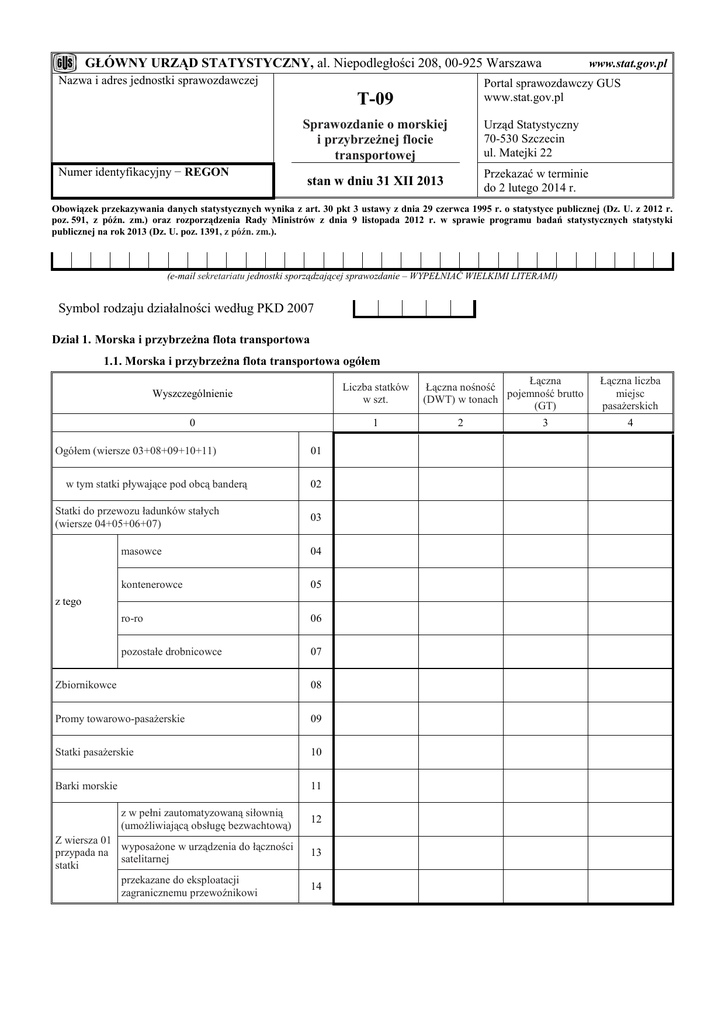 GŁÓWNY URZĄD STATYSTYCZNY, al. Niepodległości 208, 00-925 Warszawa Nazwa i adres jednostki sprawozdawczej Portal sprawozdawczy GUS www.stat.gov.pl T-09 Urząd Statystyczny 70-530 Szczecin ul. Matejki 22 Sprawozdanie o morskiej i przybrzeżnej flocie transportowej Numer identyfikacyjny − REGON www.stat.gov.pl Przekazać w terminie do 2 lutego 2014 r. stan w dniu 31 XII 2013 Obowiązek przekazywania danych statystycznych wynika z art. 30 pkt 3 ustawy z dnia 29 czerwca 1995 r. o statystyce publicznej (Dz. U. z 2012 r. poz. 591, z późn. zm.) oraz rozporządzenia Rady Ministrów z dnia 9 listopada 2012 r. w sprawie programu badań statystycznych statystyki publicznej na rok 2013 (Dz. U. poz. 1391, z późn. zm.). (e-mail sekretariatu jednostki sporządzającej sprawozdanie – WYPEŁNIAĆ WIELKIMI LITERAMI) Symbol rodzaju działalności według PKD 2007 Dział 1. Morska i przybrzeżna flota transportowa 1.1. Morska i przybrzeżna flota transportowa ogółem Wyszczególnienie Liczba statków w szt. 0 1 Ogółem (wiersze 03+08+09+10+11) w tym statki pływające pod obcą banderą Statki do przewozu ładunków stałych (wiersze 04+05+06+07) 01 02 03 masowce 04 kontenerowce 05 ro-ro 06 pozostałe drobnicowce 07 z tego Zbiornikowce 08 Promy towarowo-pasażerskie 09 Statki pasażerskie 10 Barki morskie 11 z w pełni zautomatyzowaną siłownią (umożliwiającą obsługę bezwachtową) Z wiersza 01 wyposażone w urządzenia do łączności przypada na satelitarnej statki przekazane do eksploatacji zagranicznemu przewoźnikowi 12 13 14 Łączna Łączna nośność pojemność brutto (DWT) w tonach (GT) 2 3 Łączna liczba miejsc pasażerskich 4 Dział 1.2. Morska i przybrzeżna flota transportowa według statków (dotyczy statków wykazanych w dziale 1 pkt 1.1) Nazwa statku Statek Lp. nr IMO, gdy brak – sygnał M/Pa) wywoławczy 0 1 2 Rodzaj statku Liczba miesięcy eksploatacji statku przez zagranicznego (obcego) przewoźnika 3 4 Rok Ro-rob) budowyc) 5 6 Prędkość konstrukcyjna (w węzłach)d) DWT/ TEU GT Liczba miejsc pasaż. 7 8 9 10 Stan załogi statku Łączność satelitarnab) W pełni zautomatyzowana siłowniab) 11 12 13 Właściciel rejestrowy (rejestr stały). Udziały Tytuł kapitału polskiego prawny do we własności Bande dysponostatkue): -ra wania a - powyżej 0, statkiem a poniżej 50 % b - 50 % c - powyżej 50 % 14 15 16 01 02 03 04 05 06 07 08 09 10 11 12 13 14 15 a) Należy wpisać „M” dla statku morskiego lub „P” dla przybrzeżnego. b) Należy wpisać „tak” lub „nie”. c) Rok zakończenia budowy statku. d)W węzłach, z jednym znakiem po przecinku. e) Należy określić (zgodnie z art. 73 ustawy z dnia 18 września 2001 r. – Kodeks morski (Dz. U. z 2013 r. poz. 758), w jakim udziale procentowym statek jest własnością polską, tj. określić udział polskiego kapitału ogółem (nie tylko kapitału przedsiębiorstwa sporządzającego sprawozdanie) poprzez wpisanie „a”, „b” lub „c”. Dla statków o polskiej przynależności należy wpisać „P”, a dla statków, które czasowo uzyskały polską przynależność: „PC”. Dział 2. Morska i przybrzeżna flota transportowa stanowiąca własność zagranicznego (obcego) podmiotu eksploatowana przez sprawozdawcę Nazwa statku Statek Lp. nr IMO, gdy brak – sygnał M/Pa) wywoławczy 0 1 Rodzaj statku Ro-rob) Rok budowyc) Prędkość konstrukcyjnad) 3 4 5 6 2 DWT/ TEU GT Liczba miejsc pasaż. 7 8 9 W pełni Stan Łączność zautomazałogi satelityzowana statku tarnab) siłowniab) 10 11 Właściciel rejestrowy (rejestr stały) Bandera 13 14 12 Tytuł prawny do dysponowania statkiem oraz okres eksploatacji (od … do …) 15 01 02 03 04 05 06 07 08 09 10 11 12 13 14 15 a) Należy wpisać „M" dla statku morskiego lub „P" dla przybrzeżnego. b) Należy wpisać „tak" lub „nie". c) Rok zakończenia budowy statku. d) W węzłach, z jednym znakiem po przecinku. Proszę podać szacunkowy czas (w minutach) przeznaczony na przygotowanie danych dla potrzeb wypełnianego formularza 1 Proszę podać szacunkowy czas (w minutach) przeznaczony na wypełnienie formularza 2 (e-mail osoby sporządzającej sprawozdanie – WYPEŁNIAĆ WIELKIMI LITERAMI) (imię, nazwisko i telefon osoby sporządzającej sprawozdanie) (miejscowość, data) (pieczątka imienna i podpis osoby działającej w imieniu sprawozdawcy) Uwagi: Objaśnienia do formularza T-09 Uwaga: W e-mailu każdy znak powinien zostać wpisany w odrębnej kratce. Przykład wypełnienia e-maila: Z E N O N . K O W A L S K I @ X X X . Y Y Y . P L Sprawozdaniem na formularzu T-09 należy objąć morską i przybrzeżną flotę transportową wg stanu na dzień 31.XII.2013. Dział 1. Morska i przybrzeżna flota transportowa 1.1. Morska i przybrzeżna flota transportowa ogółem 1. Przez określenie ,,morska i przybrzeżna flota transportowa” należy rozumieć: 1) statki stanowiące własność lub współwłasność przedsiębiorstwa sporządzającego sprawozdanie, tj. statki znajdujące się w stanie inwentarzowym floty z pominięciem statków wycofanych na stałe z eksploatacji na skutek całkowitego zużycia, a nieskreślonych z inwentarza; 2) statki dzierżawione od spółek armatorskich, których udziałowcem jest polskie przedsiębiorstwo; 3) statki będące własnością lub współwłasnością spółki kapitałowej (z udziałem polskiego kapitału) mającej siedzibę za granicą i eksploatowane przez polskie przedsiębiorstwo. 2. Rubryka 2 – łączną nośność (DWT) należy obliczać jako sumę nośności w tonach (brutto) poszczególnych statków na podstawie aktualnych w okresie sprawozdawczym danych technicznej dokumentacji statków. Do obliczeń należy przyjmować nośność w tonach (brutto) określoną dla okresu letniego, tj. nośność przy zanurzeniu do tzw. letniej linii ładunkowej. 3. Rubryka 3 – łączną pojemność brutto (GT) należy obliczać jako sumę pojemności brutto poszczególnych statków. Pojemność brutto stat