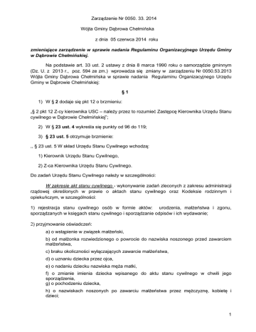 Zarządzenie Nr 0050. 33. 2014 Wójta Gminy Dąbrowa Chełmińska z dnia 05 czerwca 2014 roku zmieniające zarządzenie w sprawie nadania Regulaminu Organizacyjnego Urzędu Gminy w Dąbrowie Chełmińskiej. Na podstawie art. 33 ust. 2 ustawy z dnia 8 marca 1990 roku o samorządzie gminnym (Dz. U. z 2013 r., poz. 594 ze zm.) wprowadza się zmiany w zarządzeniu Nr 0050.53.2013 Wójta Gminy Dąbrowa Chełmińska w sprawie nadania Regulaminu Organizacyjnego Urzędu Gminy w Dąbrowie Chełmińskiej: §1 1) W § 2 dodaje się pkt 12 o brzmieniu: „§ 2 pkt 12 Z-cy kierownika USC – należy przez to rozumieć Zastępcę Kierownika Urzędu Stanu cywilnego w Dąbrowie Chełmińskiej”; 2) W § 23 ust. 4 wykreśla się punkty od 96 do 119; 3) § 23 ust. 5 otrzymuje brzmienie: ,, § 23 ust. 5 W skład Urzędu Stanu Cywilnego wchodzą: 1) Kierownik Urzędu Stanu Cywilnego, 2) Z-ca Kierownika Urzędu Stanu Cywilnego. Do zadań Urzędu Stanu Cywilnego należy w szczególności: W zakresie akt stanu cywilnego - wykonywanie zadań zleconych z zakresu administracji rządowej określonych w prawie o aktach stanu cywilnego oraz Kodeksie rodzinnym i opiekuńczym, w szczególności: 1) rejestracja stanu cywilnego osób w formie aktów: urodzenia, małżeństwa i zgonu, sporządzanych w księgach stanu cywilnego i sporządzanie odpisów i ich wydawanie; 2) przyjmowanie oświadczeń: a) o wstąpienie w związek małżeński, b) od małżonka rozwiedzionego o powrocie do nazwiska noszonego przed zawarciem małżeństwa, c) braku okoliczności wyłączających zawarcie małżeństwa, d) o uznaniu dziecka przez ojca, e) o nadaniu dziecku nazwiska męża matki, f) o zmianie imienia dziecka wpisanego do aktu stanu cywilnego w chwili jego sporządzenia, g) o pochodzeniu dziecka, h) o nazwiskach noszonych po zawarciu małżeństwa przez mężczyznę, kobietę i dzieci; 1 3) prowadzenie postępowań w sprawie zmian imion i nazwisk; 4) zawiadamianie o zmianach imienia, nazwiska stosowne urzędy i instytucje; 5) sporządzanie protokołu zgłoszenia urodzenia, zgonu w trybie art. 11 ustawy – Prawo o aktach stanu cywilnego; 6) wydawanie decyzji administracyjnych z zakresu: a) wpisywania aktów zagranicznych do polskich ksiąg stanu cywilnego; b) skrócenia terminu miesięcznego terminu, c) uzupełniania, cywilnego; oczekiwania prostowania, na zawarcie odtworzenia treści, małżeństwa ustalenia przed upływem treści aktu stanu 7) wydawanie odpisów z akt stanu cywilnego (skrócone, zupełne, wielojęzyczne); 8) przekazywanie stosownych dokumentów na dyplomatycznych oraz uprawnionych instytucji i stron; żądanie sądów, polskich placówek 9) prowadzenie uroczystych form rejestracji stanu cywilnego; 10) prowadzenie archiwum akt stanu cywilnego, w tym przechowywanie i konserwacja ksiąg stanu cywilnego oraz akt zbiorowych i prowadzenie do nich skorowidzów; 11) przekazywanie ksiąg 100-letnich wraz z aktami zbiorowymi i skorowidzami do Archiwum Państwowego; 12) wydawanie zaświadczeń w sprawie zawarcia małżeństwa i o wpisach dokonanych w księgach lub ich braku, o zaginięciu lub zniszczeniu księgi stanu cywilnego; 13) współdziałanie z właściwymi Ambasadorami (Konsulatami) RP w sprawach z zakresu USC; 14) sporządzanie testamentów zwykłych zgodnie z Kodeksem cywilnym, prowadzenie ewidencji i ich przechowywanie; 15) przekazywanie danych osób proponowanych do odznaczeń za ,, Długoletnie Pożycie Małżeńskie”; 16) organizowanie uroczystości związanej z jubileuszami pożycia małżeńskiego; 17) prowadzenie archiwum dokumentów Urzędu Stanu Cywilnego. W zakresie spraw obronnych i wojskowych: 1) współpraca z Wojskową Komendą Uzupełnień i innymi organami wojskowymi; 2) prowadzenie postępowań i wydawanie decyzji z zakresu orzekania o konieczności sprawowania przez żołnierza bezpośredniej opieki nad członkiem rodziny; 3) prowadzenie rejestru do kwalifikacji wojskowej oraz jej przeprowadzanie; 2 4) opracowywanie i aktualizowanie Planu Operacyjnego dla Gminy w zakresie realizacji zadań obronnych w warunkach zewnętrznego zagrożenia bezpieczeństwa państwa ; 5) przygotowywanie dokumentacji związanej ze świadczeniami na rzecz obrony; 6) przygotowywanie decyzji związanych ze świadczeniami osobistymi i rzeczowymi na rzecz obrony cywilnej; 7) prowadzenie dokumentacji planistyczno-organizacyjnej prowadzonej Akcji Kurierskiej; 8) opracowywanie i aktualizacja dokumentacji Stałego Dyżuru; 9) przygotowywanie decyzji w sprawach ustalenia świadczeń rekompensujących dla żołnierzy rezerwy odbywających ćwiczenia wojskowe; 10) opracowywanie sprawozdań w zakresie spraw wojskowych; 11) reklamowanie osób od czynnej służby wojskowej; 12) uczestnictwo w organizowanych na terenie Gminy ćwiczeniach i treningach; 13) przygotowywanie ludności i mienia komunalnego na wypadek wojny i innych zagrożeń; 14) przygotowywanie zakwaterowania sił zbrojnych (HNS) W zakresie ewidencji ludności i dowodów osobistych 1) prowadzenie i aktualizacja stałego rejestru wyborców, sporządzanie spisów wyborców, wydawanie określonych przepisami prawa zaświadczeń; 2) przygotowywanie decyzji administracyjnych z zakresu meldunkowego; 3) zakładanie i aktualizacja kart osobowych mieszkańców; 4) wypełnianie i przesyłanie do urzędów właściwych ze względu na dotychczasowe miejsce pobytu stałego danej osoby informacji o zameldowaniu jej na pobyt stały lub czasowy oraz sporządzanie wezwań o przesłanie karty KOM; 5) sporządzanie wykazu osób zmarłych do Urzędu Statystycznego; 6) sprawozdawczość statystyczna dotycząca ruchu ludności; 7) bieżące nanoszenie do bazy danych wszelkich zmian związanych z ruchem ludności i danych osobowych mieszkańców; 8) współpraca w zakresie ewidencji ludności z Rządowym Centrum Informatycznym PESEL, Centralnym Biurem Adresowym, Wojskowymi Komendami Uzupełnień, policją, sądami, prokuratorami, administracjami budynków i innymi urzędami; 9) udzielanie