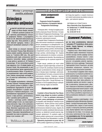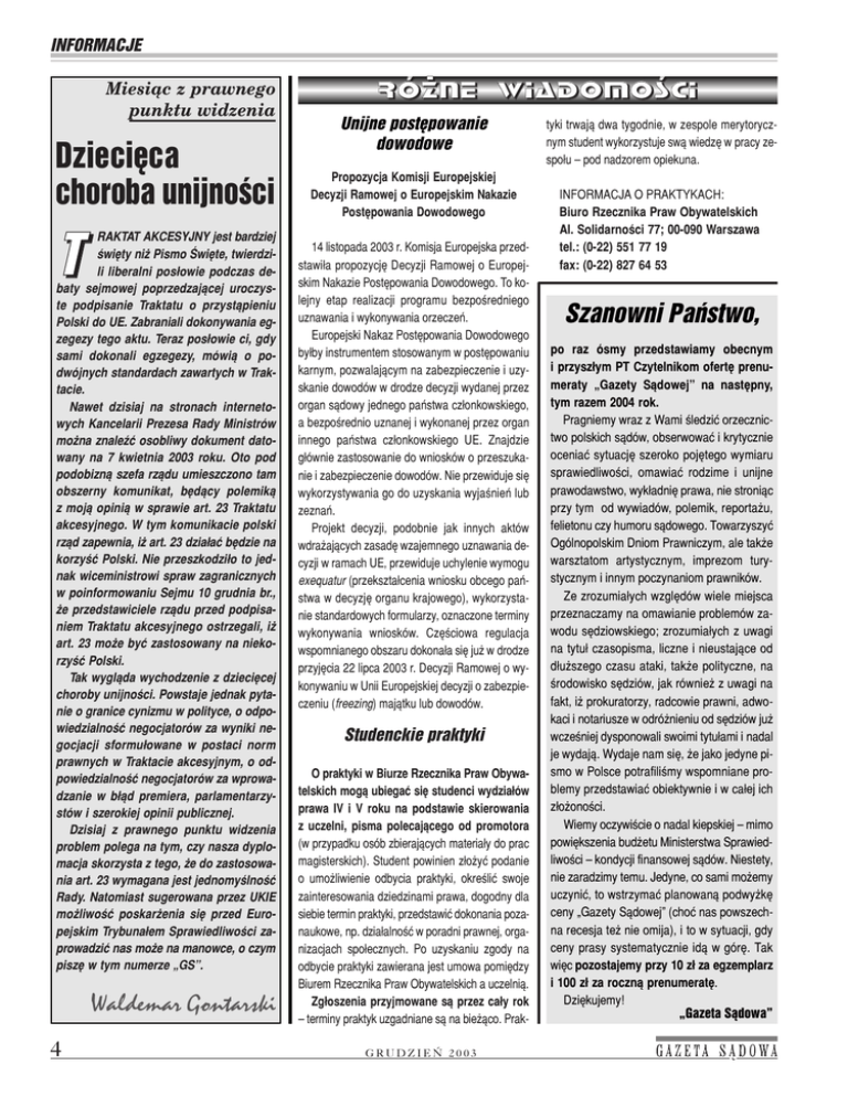 INFORMACJE Miesiąc z prawnego punktu widzenia Dziecięca choroba unijności T RAKTAT AKCESYJNY jest bardziej święty niż Pismo Święte, twierdzi− li liberalni posłowie podczas de− baty sejmowej poprzedzającej uroczys− te podpisanie Traktatu o przystąpieniu Polski do UE. Zabraniali dokonywania eg− zegezy tego aktu. Teraz posłowie ci, gdy sami dokonali egzegezy, mówią o po− dwójnych standardach zawartych w Trak− tacie. Nawet dzisiaj na stronach interneto− wych Kancelarii Prezesa Rady Ministrów można znaleźć osobliwy dokument dato− wany na 7 kwietnia 2003 roku. Oto pod podobizną szefa rządu umieszczono tam obszerny komunikat, będący polemiką z moją opinią w sprawie art. 23 Traktatu akcesyjnego. W tym komunikacie polski rząd zapewnia, iż art. 23 działać będzie na korzyść Polski. Nie przeszkodziło to jed− nak wiceministrowi spraw zagranicznych w poinformowaniu Sejmu 10 grudnia br., że przedstawiciele rządu przed podpisa− niem Traktatu akcesyjnego ostrzegali, iż art. 23 może być zastosowany na nieko− rzyść Polski. Tak wygląda wychodzenie z dziecięcej choroby unijności. Powstaje jednak pyta− nie o granice cynizmu w polityce, o odpo− wiedzialność negocjatorów za wyniki ne− gocjacji sformułowane w postaci norm prawnych w Traktacie akcesyjnym, o od− powiedzialność negocjatorów za wprowa− dzanie w błąd premiera, parlamentarzy− stów i szerokiej opinii publicznej. Dzisiaj z prawnego punktu widzenia problem polega na tym, czy nasza dyplo− macja skorzysta z tego, że do zastosowa− nia art. 23 wymagana jest jednomyślność Rady. Natomiast sugerowana przez UKIE możliwość poskarżenia się przed Euro− pejskim Trybunałem Sprawiedliwości za− prowadzić nas może na manowce, o czym piszę w tym numerze „GS”. Waldemar Gontarski 4 Różne wiadomości Unijne postępowanie dowodowe Propozycja Komisji Europejskiej Decyzji Ramowej o Europejskim Nakazie Postępowania Dowodowego 14 listopada 2003 r. Komisja Europejska przed− stawiła propozycję Decyzji Ramowej o Europej− skim Nakazie Postępowania Dowodowego. To ko− lejny etap realizacji programu bezpośredniego uznawania i wykonywania orzeczeń. Europejski Nakaz Postępowania Dowodowego byłby instrumentem stosowanym w postępowaniu karnym, pozwalającym na zabezpieczenie i uzy− skanie dowodów w drodze decyzji wydanej przez organ sądowy jednego państwa członkowskiego, a bezpośrednio uznanej i wykonanej przez organ innego państwa członkowskiego UE. Znajdzie głównie zastosowanie do wniosków o przeszuka− nie i zabezpieczenie dowodów. Nie przewiduje się wykorzystywania go do uzyskania wyjaśnień lub zeznań. Projekt decyzji, podobnie jak innych aktów wdrażających zasadę wzajemnego uznawania de− cyzji w ramach UE, przewiduje uchylenie wymogu exequatur (przekształcenia wniosku obcego pań− stwa w decyzję organu krajowego), wykorzysta− nie standardowych formularzy, oznaczone terminy wykonywania wniosków. Częściowa regulacja wspomnianego obszaru dokonała się już w drodze przyjęcia 22 lipca 2003 r. Decyzji Ramowej o wy− konywaniu w Unii Europejskiej decyzji o zabezpie− czeniu (freezing) majątku lub dowodów. Studenckie praktyki O praktyki w Biurze Rzecznika Praw Obywa− telskich mogą ubiegać się studenci wydziałów prawa IV i V roku na podstawie skierowania z uczelni, pisma polecającego od promotora (w przypadku osób zbierających materiały do prac magisterskich). Student powinien złożyć podanie o umożliwienie odbycia praktyki, określić swoje zainteresowania dziedzinami prawa, dogodny dla siebie termin praktyki, przedstawić dokonania poza− naukowe, np. działalność w poradni prawnej, orga− nizacjach społecznych. Po uzyskaniu zgody na odbycie praktyki zawierana jest umowa pomiędzy Biurem Rzecznika Praw Obywatelskich a uczelnią. Zgłoszenia przyjmowane są przez cały rok – terminy praktyk uzgadniane są na bieżąco. Prak− GRUDZIEŃ 2003 tyki trwają dwa tygodnie, w zespole merytorycz− nym student wykorzystuje swą wiedzę w pracy ze− społu – pod nadzorem opiekuna. INFORMACJA O PRAKTYKACH: Biuro Rzecznika Praw Obywatelskich Al. Solidarności 77; 00−090 Warszawa tel.: (0−22) 551 77 19 fax: (0−22) 827 64 53 Szanowni Państwo, po raz ósmy przedstawiamy obecnym i przyszłym PT Czytelnikom ofertę prenu− meraty „Gazety Sądowej” na następny, tym razem 2004 rok. Pragniemy wraz z Wami śledzić orzecznic− two polskich sądów, obserwować i krytycznie oceniać sytuację szeroko pojętego wymiaru sprawiedliwości, omawiać rodzime i unijne prawodawstwo, wykładnię prawa, nie stroniąc przy tym od wywiadów, polemik, reportażu, felietonu czy humoru sądowego. Towarzyszyć Ogólnopolskim Dniom Prawniczym, ale także warsztatom artystycznym, imprezom tury− stycznym i innym poczynaniom prawników. Ze zrozumiałych względów wiele miejsca przeznaczamy na omawianie problemów za− wodu sędziowskiego; zrozumiałych z uwagi na tytuł czasopisma, liczne i nieustające od dłuższego czasu ataki, także polityczne, na środowisko sędziów, jak również z uwagi na fakt, iż prokuratorzy, radcowie prawni, adwo− kaci i notariusze w odróżnieniu od sędziów już wcześniej dysponowali swoimi tytułami i nadal je wydają. Wydaje nam się, że jako jedyne pi− smo w Polsce potrafiliśmy wspomniane pro− blemy przedstawiać obiektywnie i w całej ich złożoności. Wiemy oczywiście o nadal kiepskiej – mimo powiększenia budżetu Ministerstwa Sprawied− liwości – kondycji finansowej sądów. Niestety, nie zaradzimy temu. Jedyne, co sami możemy uczynić, to wstrzymać planowaną podwyżkę ceny „Gazety Sądowej” (choć nas powszech− na recesja też nie omija), i to w sytuacji, gdy ceny prasy systematycznie idą w górę. Tak więc pozostajemy przy 10 zł za egzemplarz i 100 zł za roczną prenumeratę. Dziękujemy! „Gazeta Sądowa”