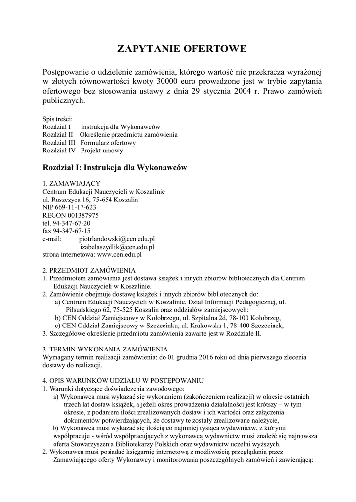 ZAPYTANIE OFERTOWE Postępowanie o udzielenie zamówienia, którego wartość nie przekracza wyrażonej w złotych równowartości kwoty 30000 euro prowadzone jest w trybie zapytania ofertowego bez stosowania ustawy z dnia 29 stycznia 2004 r. Prawo zamówień publicznych. Spis treści: Rozdział I Rozdział II Rozdział III Rozdział IV Instrukcja dla Wykonawców Określenie przedmiotu zamówienia Formularz ofertowy Projekt umowy Rozdział I: Instrukcja dla Wykonawców 1. ZAMAWIAJĄCY Centrum Edukacji Nauczycieli w Koszalinie ul. Ruszczyca 16, 75-654 Koszalin NIP 669-11-17-623 REGON 001387975 tel. 94-347-67-20 fax 94-347-67-15 e-mail: [email protected] [email protected] strona internetowa: www.cen.edu.pl 2. PRZEDMIOT ZAMÓWIENIA 1. Przedmiotem zamówienia jest dostawa książek i innych zbiorów bibliotecznych dla Centrum Edukacji Nauczycieli w Koszalinie. 2. Zamówienie obejmuje dostawę książek i innych zbiorów bibliotecznych do: a) Centrum Edukacji Nauczycieli w Koszalinie, Dział Informacji Pedagogicznej, ul. Piłsudskiego 62, 75-525 Koszalin oraz oddziałów zamiejscowych: b) CEN Oddział Zamiejscowy w Kołobrzegu, ul. Szpitalna 2d, 78-100 Kołobrzeg, c) CEN Oddział Zamiejscowy w Szczecinku, ul. Krakowska 1, 78-400 Szczecinek, 3. Szczegółowe określenie przedmiotu zamówienia zawarte jest w Rozdziale II. 3. TERMIN WYKONANIA ZAMÓWIENIA Wymagany termin realizacji zamówienia: do 01 grudnia 2016 roku od dnia pierwszego zlecenia dostawy do realizacji. 4. OPIS WARUNKÓW UDZIAŁU W POSTĘPOWANIU 1. Warunki dotyczące doświadczenia zawodowego: a) Wykonawca musi wykazać się wykonaniem (zakończeniem realizacji) w okresie ostatnich trzech lat dostaw książek, a jeżeli okres prowadzenia działalności jest krótszy – w tym okresie, z podaniem ilości zrealizowanych dostaw i ich wartości oraz załączenia dokumentów potwierdzających, że dostawy te zostały zrealizowane należycie, b) Wykonawca musi wykazać się ilością co najmniej tysiąca wydawnictw, z którymi współpracuje - wśród współpracujących z wykonawcą wydawnictw musi znaleźć się najnowsza oferta Stowarzyszenia Bibliotekarzy Polskich oraz wydawnictw uczelni wyższych. 2. Wykonawca musi posiadać księgarnię internetową z możliwością przeglądania przez Zamawiającego oferty Wykonawcy i monitorowania poszczególnych zamówień i zawierającą: a) prezentacje książek z informacją: autor dzieła, tytuł, rok wydania, nazwa wydawcy, nazwa serii wydawniczej, ISBN, format dzieła, ilość stron, cena, skan okładki, krótka recenzja dzieła, b) przeszukiwanie bazy według: autorów, tytułów, nazw wydawców, roku wydania, kategorii tematycznych, typów publikacji, serii wydawniczych, c) informację o fakcie wcześniejszego zakupu lub zamówienia/umieszczenia w schowku danej pozycji, d) koszyk – zawierający informacje o ilości zamówionych tytułów, cenie, braku w dostawie zamówionych tytułów/egzemplarzy tytułów, e) schowek – z możliwością przechowywania/rezerwowania tytułów, f) podgląd dotychczas wystawionych faktur. 5. WYKAZ OŚWIADCZEŃ I DOKUMENTÓW JAKIE MAJĄ DOSTARCZYĆ WYKONAWCY W CELU POTWIERDZENIA SPEŁNIENIA WARUNKÓW UDZIAŁU W POSTĘPOWANIU, KTÓRE MUSZĄ SPEŁNIAĆ WYKONAWCY 1. Aktualny odpis z właściwego rejestru albo zaświadczenie o wpisie do ewidencji działalności gospodarczej, jeżeli odrębne przepisy wymagają wpisu do rejestru lub zgłoszenia do ewidencji działalności gospodarczej, wystawionego nie wcześniej niż 6 miesięcy przed upływem terminu składania ofert. 2. Wykaz dostaw wskazanych w pkt 4 ppkt 1a wraz z dokumentami potwierdzającymi, że dostawy te zostały zrealizowane należycie. 3. Wykaz wydawnictw, z którymi współpracuje Wykonawca wskazanych w pkt 4 ppkt 1b. 4. Oświadczenie dotyczące ilości tytułów aktualnie dostępnych w księgarni internetowej Wykonawcy. 5. Aktualny „login” i „hasło” udostępniające Zamawiającemu bazę danych księgarni internetowej w celu potwierdzenia spełniania wymagań zawartych w pkt 4 ppkt 2. 6. OPIS SPOSOBU PRZYGOTOWANIA OFERT 1. Ofertę stanowi wypełniony Formularz ofertowy zamieszczony w Rozdziale III. 2. Wykonawca może złożyć tylko jedną ofertę. 3. Ofertę należy sporządzić w języku polskim. 4. Oferta może mieć postać wydruku komputerowego lub być napisana ręcznie długopisem albo nieścieralnym atramentem w sposób czytelny. Oferta wraz ze wszystkimi załączonymi dokumentami powinna być zszyta lub zbindowana tak, by stanowiła całość. 5. Wszelkie koszty związane z przygotowaniem oferty ponosi składający ofertę. 6. Oferta – formularz ofertowy oraz wszystkie dokumenty, oświadczenia złożone wraz z ofertą należy podpisać przez upełnomocnionego przedstawiciela Wykonawcy. 7. Ofertę należy umieścić w kopercie zaadresowanej na adres Zamawiającego: Centrum Edukacji Nauczycieli w Koszalinie, ul. Ruszczyca 16, 75-654 Koszalin, sekretariat i oznaczyć: „OFERTA W POSTĘPOWANIU O UDZIELENIE ZAMÓWIENIA PUBLICZNEGO NA DOSTAWĘ KSIĄŻEK DLA CENTRUM EDUKACJI NAUCZYCIELI W KOSZALINIE” 7. MIEJSCE ORAZ TERMIN SKŁADANIA I OTWARCIA OFERT 1. Miejsce składania ofert: Centrum Edukacji Nauczycieli w Koszalinie, ul. Ruszczyca 16, 75-654 Koszalin, pokój nr 1 - sekretariat. 2. Termin składania ofert: do dnia 30.03.2016 r., do godziny 1300 3. Termin otwarcia ofert: 30.03.2016 r, godzina 1315 4. Miejsce otwarcia ofert: Centrum Edukacji Nauczycieli w Koszalinie, ul. Ruszczyca 16, 75-654 Koszalin, pokój nr 108. 5. Oferty złożone po terminie zostaną zwrócone bez otwierania. 8. OPIS SPOSOBU OBLICZENIA CENY 1. Wykonawca określi w Formularzu ofertowym (załącznik nr 1) rabat w procentach od ceny detalicznej wydawcy książki. 2. Rabat określony przez Wykonawcę zostaje określony na czas realizacji umowy i nie będzie ulegał zmianie. 3. W ofercie Wykonawca uwzględni wszystkie koszty związane z wykonaniem przedmiotu zamówienia. 4. Zamawiający informuje, że rozliczenia