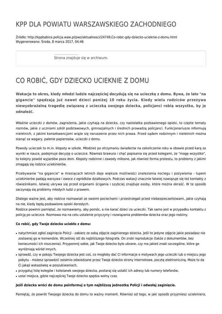 KPP DLA POWIATU WARSZAWSKIEGO ZACHODNIEGO Źródło: http://kppbabice.policja.waw.pl/pwz/aktualnosci/24749,Co-robic-gdy-dziecko-ucieknie-z-domu.html Wygenerowano: Środa, 8 marca 2017, 04:46 Strona znajduje się w archiwum. CO ROBIĆ, GDY DZIECKO UCIEKNIE Z DOMU Wakacje to okres, kiedy młodzi ludzie najczęściej decydują się na ucieczkę z domu. Bywa, że lato "na gigancie" spędzają już nawet dzieci poniżej 10 roku życia. Kiedy wielu rodziców przeżywa niewyobrażalną tragedię związaną z ucieczką swojego dziecka, policjanci robią wszystko, by je odnaleźć. Właśnie ucieczki z domów, zagrożenia, jakie czyhają na dziecko, czy nastolatka pozbawionego opieki, to częste tematy rozmów, jakie z uczniami szkół podstawowych, gimnazjalnych i średnich prowadzą policjanci. Funkcjonariusze informują nieletnich, z jakimi konsekwencjami wiąże się naruszenie przez nich prawa. Przed sądem rodzinnym i nieletnich można stanąć za wagary, palenie papierosów, ucieczki z domu. Powody ucieczek to m.in. kłopoty w szkole. Młodzież po otrzymaniu świadectw na zakończenie roku w obawie przed karą za wyniki w nauce, podejmuje decyzję o ucieczce. Również brawura i chęć popisania się przed kolegami, że "mogę wszystko", to kolejny powód wyjazdów poza dom. Kłopoty rodzinne i zawody miłosne, jak również forma protestu, to problemy z jakimi zmagają się rodzice uciekinierów. Przebywanie "na gigancie" w miesiącach letnich daje większe możliwości znalezienia noclegu i pożywienia - łupem uciekinierów padają warzywa i owoce z ogródków działkowych. Podczas wakacji znacznie łatwiej nawiązuje się też kontakty z rówieśnikami, łatwiej ukrywa się przed organami ścigania i szybciej znajduje osoby, które można okraść. W te sposób zaczynają się problemy młodych ludzi z prawem. Dlatego ważne jest, aby rodzice rozmawiali ze swoimi pociechami i przestrzegali przed niebezpieczeństwami, jakie czyhają na nie, kiedy będą pozbawione opieki dorosłych. Rodzice powinni pamiętać, że rozmawiamy, aby pomóc, a nie karać dzieci za ucieczki. Tak samo jest w przypadku kontaktu z policją po ucieczce. Rozmowa ma na celu ustalenie przyczyny i rozwiązania problemów dziecka oraz jego rodziny. Co robić, gdy Twoje dziecko uciekło z domu: ● natychmiast zgłoś zaginięcie Policji - zabierz ze sobą zdjęcie zaginionego dziecka. Jeśli to jedyne zdjęcie jakie posiadasz nie zostawiaj go w komendzie. Wcześniej idź do najbliższego fotografa. On zrobi reprodukcje (także z dokumentów, bez konieczności ich niszczenia). Przypomnij sobie, jak Twoje dziecko było ubrane, czy ma jakieś znaki szczególne, które go wyróżniają wśród innych, ● sprawdź, czy w pokoju Twojego dziecka jest coś, co mogłoby dać Ci informacje o motywach jego ucieczki lub o miejscu jego pobytu - możesz sprawdzić ostatnio odwiedzane przez Twoje dziecko strony internetowe, pocztę elektroniczną. Może to da Ci jakąś wskazówkę w poszukiwaniach, ● przygotuj listę kolegów i koleżanek swojego dziecka, postaraj się ustalić ich adresy lub numery telefonów, ● ustal miejsca, gdzie najczęściej Twoje dziecko spędza wolny czas. Jeśli dziecko wróci do domu poinformuj o tym najbliższą jednostkę Policji i odwołaj zaginięcie. Pamiętaj, że powrót Twojego dziecka do domu to ważny moment. Również od tego, w jaki sposób przyjmiesz uciekiniera, zależy czy nie będzie chciał uciec ponownie. Zgłoszone Policji zaginięcia dzieci: Rok 2010 2009 2008 Do 7 lat 118 125 145 7-13 lat 436 442 528 13-17 lat 2915 3054 3487 Tylko w tym roku (stan do 16.06.2011r.) policjanci przyjęli 1859 zgłoszeń o zaginięciach dzieci. Większość zaginionych zostaje odnaleziona w ciągu pierwszych 14 dni po zaginięciu. 95 proc. dzieci w ciągu pierwszych 7 dni z powrotem trafia do swoich domów. info: kgp, /ego/ Ocena: 0/5 (0) Tweetnij