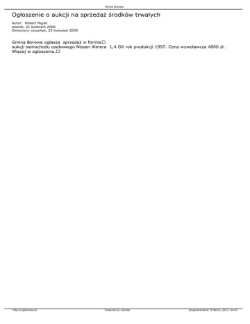 Gmina Borowa Ogłoszenie o aukcji na sprzedaż środków trwałych Autor: Robert Myjak wtorek, 21 kwiecień 2009 Zmieniony czwartek, 23 kwiecień 2009 Gmina Borowa ogłasza sprzedaż w formie aukcji samochodu osobowego Nissan Almera 1,4 GX rok produkcji 1997. Cena wywoławcza 4000 zł. Więcej w ogłoszeniu. http://ugborowa.pl Powered by Joomla! Wygenerowano: 8 March, 2017, 04:47