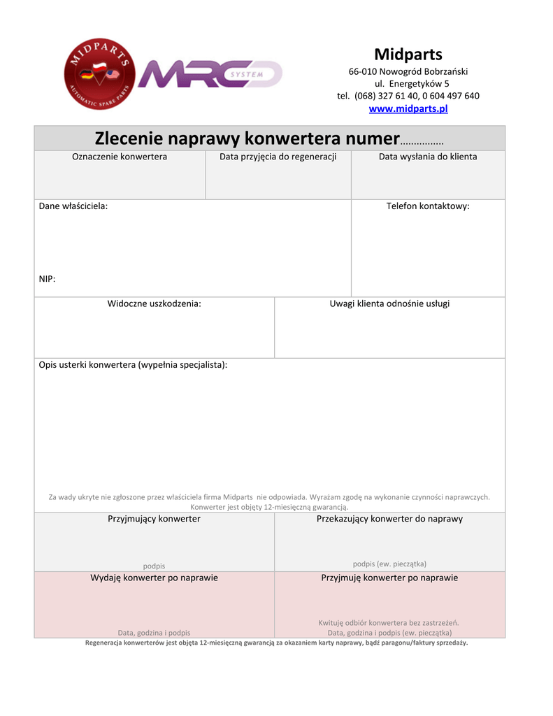 Midparts 66-010 Nowogród Bobrzański ul. Energetyków 5 tel. (068) 327 61 40, 0 604 497 640 www.midparts.pl Zlecenie naprawy konwertera numer................ Oznaczenie konwertera Data przyjęcia do regeneracji Dane właściciela: Data wysłania do klienta Telefon kontaktowy: NIP: Widoczne uszkodzenia: Uwagi klienta odnośnie usługi Opis usterki konwertera (wypełnia specjalista): Za wady ukryte nie zgłoszone przez właściciela firma Midparts nie odpowiada. Wyrażam zgodę na wykonanie czynności naprawczych. Konwerter jest objęty 12-miesięczną gwarancją. Przyjmujący konwerter Przekazujący konwerter do naprawy podpis podpis (ew. pieczątka) Wydaję konwerter po naprawie Przyjmuję konwerter po naprawie Data, godzina i podpis Kwituję odbiór konwertera bez zastrzeżeń. Data, godzina i podpis (ew. pieczątka) Regeneracja konwerterów jest objęta 12-miesięczną gwarancją za okazaniem karty naprawy, bądź paragonu/faktury sprzedaży.
