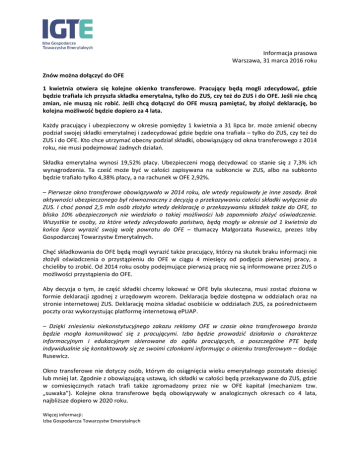 Informacja prasowa Warszawa, 31 marca 2016 roku Znów można dołączyć do OFE 1 kwietnia otwiera się kolejne okienko transferowe. Pracujący będą mogli zdecydować, gdzie będzie trafiała ich przyszła składka emerytalna, tylko do ZUS, czy też do ZUS i do OFE. Jeśli nie chcą zmian, nie muszą nic robić. Jeśli chcą dołączyć do OFE muszą pamiętać, by złożyć deklarację, bo kolejna możliwość będzie dopiero za 4 lata. Każdy pracujący i ubezpieczony w okresie pomiędzy 1 kwietnia a 31 lipca br. może zmienić obecny podział swojej składki emerytalnej i zadecydować gdzie będzie ona trafiała – tylko do ZUS, czy też do ZUS i do OFE. Kto chce utrzymać obecny podział składki, obowiązujący od okna transferowego z 2014 roku, nie musi podejmować żadnych działań. Składka emerytalna wynosi 19,52% płacy. Ubezpieczeni mogą decydować co stanie się z 7,3% ich wynagrodzenia. Ta cześć może być w całości zapisywana na subkoncie w ZUS, albo na subkonto będzie trafiało tylko 4,38% płacy, a na rachunek w OFE 2,92%. – Pierwsze okno transferowe obowiązywało w 2014 roku, ale wtedy regulowały je inne zasady. Brak aktywności ubezpieczonego był równoznaczny z decyzją o przekazywaniu całości składki wyłącznie do ZUS. I choć ponad 2,5 mln osób złożyło wtedy deklarację o przekazywaniu składek także do OFE, to blisko 10% ubezpieczonych nie wiedziało o takiej możliwości lub zapomniało złożyć oświadczenie. Wszystkie te osoby, za które wtedy zdecydowało państwo, będą mogły w okresie od 1 kwietnia do końca lipca wyrazić swoją wolę powrotu do OFE – tłumaczy Małgorzata Rusewicz, prezes Izby Gospodarczej Towarzystw Emerytalnych. Chęć składkowania do OFE będą mogli wyrazić także pracujący, którzy na skutek braku informacji nie złożyli oświadczenia o przystąpieniu do OFE w ciągu 4 miesięcy od podjęcia pierwszej pracy, a chcieliby to zrobić. Od 2014 roku osoby podejmujące pierwszą pracę nie są informowane przez ZUS o możliwości przystąpienia do OFE. Aby decyzja o tym, że część składki chcemy lokować w OFE była skuteczna, musi zostać złożona w formie deklaracji zgodnej z urzędowym wzorem. Deklaracja będzie dostępna w oddziałach oraz na stronie internetowej ZUS. Deklarację można składać osobiście w oddziałach ZUS, za pośrednictwem poczty oraz wykorzystując platformę internetową ePUAP. – Dzięki zniesieniu niekonstytucyjnego zakazu reklamy OFE w czasie okna transferowego branża będzie mogła komunikować się z pracującymi. Izba będzie prowadzić działania o charakterze informacyjnym i edukacyjnym skierowane do ogółu pracujących, a poszczególne PTE będą indywidualnie się kontaktowały się ze swoimi członkami informując o okienku transferowym – dodaje Rusewicz. Okno transferowe nie dotyczy osób, którym do osiągnięcia wieku emerytalnego pozostało dziesięć lub mniej lat. Zgodnie z obowiązującą ustawą, ich składki w całości będą przekazywane do ZUS, gdzie w comiesięcznych ratach trafi także zgromadzony przez nie w OFE kapitał (mechanizm tzw. „suwaka”). Kolejne okna transferowe będą obowiązywały w analogicznych okresach co 4 lata, najbliższe dopiero w 2020 roku. Więcej informacji: Izba Gospodarcza Towarzystw Emerytalnych Filip Pietkiewicz-Bednarek Dyrektor ds. komunikacji tel. 22 629 09 27 email: [email protected]