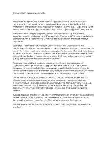 Do wszystkich zainteresowanych. Pompy i silniki łopatkowe Parker Denison są projektowane z zastosowaniem najnowszych rozwiązań inŜynieryjnych i produkowane z najwyŜszej jakości materiałów przy zastosowaniu najlepszych maszyn i technologii. Od ponad 50 lat tworzy to naszą reputację producenta urządzeń o najwyŜszej jakości wykonania. Nasz know-how i ciągłe programy badawczo-rozwojowe, są nieustannie inspirowane przez wielu producentów wyrobów finalnych (OEM) na całym świecie. Jesteśmy dumni z uczestnictwa w rozwoju produkowanych przez nich maszyn i pojazdów. JednakŜe, stosowanie tak zwanych „zamienników” lub „zastępczych” nie oryginalnych jednostek łopatkowych w oryginalnych urządzeniach nie gwarantuje ich uŜytkownikom zachowania jakości i osiągów. Podawanie informacji twierdzącej, Ŝe takie „zamienniki” naszych hydraulicznych jednostek łopatkowych są tak samo dobre jak oryginalne produkty dobrane przez finalnego wykonawcę urządzenia (OEM) jest absolutnie nieuzasadnione i fałszywe. PoniewaŜ te produkty, z wyglądu są niemal identyczne z oryginałami, ich uŜytkownicy oraz sprzedawcy mogą być wprowadzeni w błąd. Dlatego teŜ pragniemy stanowczo stwierdzić, ostrzegając wszystkich zainteresowanych, Ŝe istnieją zasadnicze róŜnice pomiędzy oryginalnymi produktami łopatkowymi Parker Denison a ich tak zwanymi „zamiennikami” lub „produktami zastępczymi”. Dobór materiałów (surowców) i ich obróbka cieplna –wyrafinowane metody obróbki skrawaniem i stosowane zawęŜone tolerancje – specjalna obróbka powierzchniowa – obróbka docieraniem i restrykcyjne testy powykonawcze oraz intensywna kontrola jakości na kaŜdym etapie produkcji mają bezpośredni i zasadniczy wpływ na parametry robocze i Ŝywotność hydraulicznych pomp i silników. Tylko zastąpienie produktów łopatkowych Parker Denison oryginalnymi produktami Parker Denison moŜe zapewnić zachowanie tych parametrów, tylko wówczas Ŝywotność produktów łopatkowych i ich osiągi pozostaną takie same. Nie eksperymentujcie, bezpiecznie jest stosować tylko oryginalne, zatwierdzone produkty.
