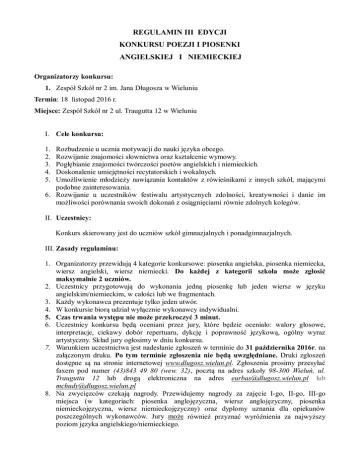 REGULAMIN III EDYCJI KONKURSU POEZJI I PIOSENKI ANGIELSKIEJ I NIEMIECKIEJ Organizatorzy konkursu: 1. Zespó Szkó nr 2 im. Jana D ugosza w Wieluniu Termin: 18 listopad 2016 r. Miejsce: Zespó Szkó nr 2 ul. Traugutta 12 w Wieluniu I. Cele konkursu: 1. 2. 3. 4. 5. Rozbudzenie u ucznia motywacji do nauki j zyka obcego. Rozwijanie znajomo ci s ownictwa oraz kszta cenie wymowy. Pog bianie znajomo ci twórczo ci poetów angielskich i niemieckich. Doskonalenie umiej tno ci recytatorskich i wokalnych. Umo liwienie m odzie y nawi zania kontaktów z rówie nikami z innych szkó , maj cymi podobne zainteresowania. 6. Rozwijanie u uczestników festiwalu artystycznych zdolno ci, kreatywno ci i danie im mo liwo ci porównania swoich dokona z osi gni ciami równie zdolnych kolegów. II. Uczestnicy: Konkurs skierowany jest do uczniów szkó gimnazjalnych i ponadgimnazjalnych. III. Zasady regulaminu: 1. Organizatorzy przewiduj 4 kategorie konkursowe: piosenka angielska, piosenka niemiecka, wiersz angielski, wiersz niemiecki. Do ka dej z kategorii szko a mo e zg osi maksymalnie 2 uczniów. 2. Uczestnicy przygotowuj do wykonania jedn piosenk lub jeden wiersz w j zyku angielskim/niemieckim, w ca ci lub we fragmentach. 3. Ka dy wykonawca prezentuje tylko jeden utwór. 4. W konkursie bior udzia wy cznie wykonawcy indywidualni. 5. Czas trwania wyst pu nie mo e przekroczy 3 minut. 6. Uczestnicy konkursu b oceniani przez jury, które b dzie ocenia o: walory g osowe, interpretacje, ciekawy dobór repertuaru, dykcj i poprawno j zykow , ogólny wyraz artystyczny. Sk ad jury og osimy w dniu konkursu. 7. Warunkiem uczestnictwa jest nades anie zg osze w terminie do 31 pa dziernika 2016r. na za czonym druku. Po tym terminie zg oszenia nie b uwzgl dniane. Druki zg osze dost pne s na stronie internetowej www.dlugosz.wielun.pl. Zg oszenia prosimy przesy faxem pod numer (43)843 49 80 (wew. 32), poczt na adres szko y 98-300 Wielu , ul. Traugutta 12 lub drog elektroniczna na adres [email protected] lub [email protected] 8. Na zwyci zców czekaj nagrody. Przewidujemy nagrody za zaj cie I-go, II-go, III-go miejsca (w kategoriach: piosenka angloj zyczna, wiersz angloj zyczny, piosenka niemieckoj zyczna, wiersz niemieckoj zyczny) oraz dyplomy uznania dla opiekunów poszczególnych wykonawców. Jury mo e równie przyzna wyró nienia za najwy szy poziom j zyka angielskiego/niemieckiego. 9. W przypadku prezentacji piosenek prosimy o przes anie podk adu muzycznego w formacie audio i mp3 (1 piosenka na 1 p ycie) na p ycie CD do dnia 30.10.2016r. P yta musi by podpisana (tytu piosenki, wykonawca, imi , nazwisko i szko a wyst puj cego). W przypadku prezentacji wierszy lub utworów literackich prosimy o przes anie na podane wy ej adresy e-mail orygina u wybranego wiersza/utworu literackiego i jego polskiego t umaczenia. Zmiana repertuaru po wys aniu zg oszenia nie jest mo liwa. 10. Wyst puj cy mog wzbogaci swój wyst p o dodatkowe rodki ekspresji, takie jak rekwizyty, elementy choreografii itp. Prosimy jednak o uprzedzenie organizatorów o swoich planach, aby przygotowania do prezentacji utworu nie zak óci y sprawnej organizacji konkursu. 11. Zastrzegamy sobie prawo wykorzystania nagra do celów promocyjnych konkursu i szko y. 12. Zastrzegamy sobie równie prawo do zarejestrowania konkursu kamer video oraz aparatem fotograficznym i wykorzystania nagra do promocji konkursu i szko y. 13. Uczestnicy wraz z opiekunami na konkurs przyje aj na koszt w asny. 14. Szczegó owe informacje o konkursie uzyska mo na telefonicznie: 503751504 lub 886977049. 15. Bardzo prosimy o przes anie zg osze konkursowych w wyznaczonym terminie i czytelne wype nienie kart. yczymy weny twórczej, zapa u w doskonaleniu swojego warsztatu artystycznego i sukcesów podczas konkursu. Organizatorzy