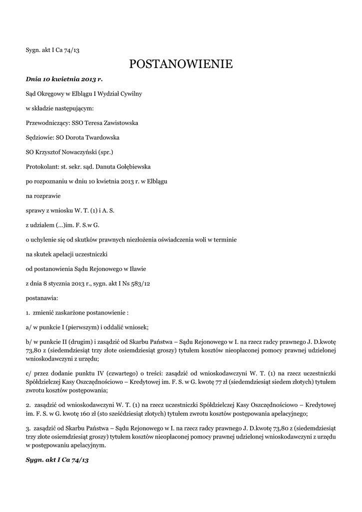 Sygn. akt I Ca 74/13 POSTANOWIENIE Dnia 10 kwietnia 2013 r. Sąd Okręgowy w Elblągu I Wydział Cywilny w składzie następującym: Przewodniczący: SSO Teresa Zawistowska Sędziowie: SO Dorota Twardowska SO Krzysztof Nowaczyński (spr.) Protokolant: st. sekr. sąd. Danuta Gołębiewska po rozpoznaniu w dniu 10 kwietnia 2013 r. w Elblągu na rozprawie sprawy z wniosku W. T. (1) i A. S. z udziałem (...)im. F. S.w G. o uchylenie się od skutków prawnych niezłożenia oświadczenia woli w terminie na skutek apelacji uczestniczki od postanowienia Sądu Rejonowego w Iławie z dnia 8 stycznia 2013 r., sygn. akt I Ns 583/12 postanawia: 1. zmienić zaskarżone postanowienie : a/ w punkcie I (pierwszym) i oddalić wniosek; b/ w punkcie II (drugim) i zasądzić od Skarbu Państwa – Sądu Rejonowego w I. na rzecz radcy prawnego J. D.kwotę 73,80 z (siedemdziesiąt trzy złote osiemdziesiąt groszy) tytułem kosztów nieopłaconej pomocy prawnej udzielonej wnioskodawczyni z urzędu; c/ przez dodanie punktu IV (czwartego) o treści: zasądzić od wnioskodawczyni W. T. (1) na rzecz uczestniczki Spółdzielczej Kasy Oszczędnościowo – Kredytowej im. F. S. w G. kwotę 77 zł (siedemdziesiąt siedem złotych) tytułem zwrotu kosztów postępowania; 2. zasądzić od wnioskodawczyni W. T. (1) na rzecz uczestniczki Spółdzielczej Kasy Oszczędnościowo – Kredytowej im. F. S. w G. kwotę 160 zł (sto sześćdziesiąt złotych) tytułem zwrotu kosztów postępowania apelacyjnego; 3. zasądzić od Skarbu Państwa – Sądu Rejonowego w I. na rzecz radcy prawnego J. D.kwotę 73,80 z (siedemdziesiąt trzy złote osiemdziesiąt groszy) tytułem kosztów nieopłaconej pomocy prawnej udzielonej wnioskodawczyni z urzędu w postępowaniu apelacyjnym. Sygn. akt I Ca 74/13 UZASADNIENIE Postanowieniem z dnia 08 stycznia 2013 r. Sąd Rejonowy w I.w sprawie sygn. (...)z wniosku W. T. (1)z udziałem A. S.i (...)im. F. S.w G.zatwierdził uchylenie się od skutków prawnych niezłożenia w terminie przez wnioskodawczynię i uczestnika A. S.oświadczenia woli o odrzuceniu spadku po siostrze E. S. (1)zmarłej w dniu 07 lutego 2010 r. ostatnio zamieszkałej w I.(punkt I), zsądził od uczestnika (...)im. F. S.w G.na rzecz radcy prawnego J. D.jako pełnomocnika z urzędu wynagrodzenie w kwocie 60 zł powiększone o podatek VAT (punkt II) oraz nakazał ściągnięcie od uczestnika A. S.na rzecz Skarbu Państwa – Sądu Rejonowego w I. kwotę 50 zł tytułem opłaty (punkt III). W uzasadnieniu Sąd wskazał, iż wnioskodawczyni domagała się zatwierdzenia uchylenia się od skutków prawnych niezachowania terminu do złożenia oświadczenia o odrzuceniu spadku po siostrze E. S. (1), dowodząc że nie złożyła przedmiotowego oświadczenia pod wpływem błędu wywołanego przez pracownika (...)-u. Uczestnik A. S.również złożył wniosek o zatwierdzenie uchylenia się od skutków prawnych niezachowania terminu do złożenia oświadczenia o odrzuceniu spadku po siostrze E. S. (1)z tych samych powodów jakie wskazała wnioskodawczyni. Uczestnik (...) im. F. S.w G.domagała się oddalenia wniosku, podkreślając iż nie doszło do wprowadzenia wnioskodawczyni w błąd przez pracownika (...), gdyż nie mógł on udzielić informacji bez wcześniejszego sprawdzenia czy zachodzą przesłanki do wypłaty sumy ubezpieczenia z polisy spadkodawcy. Sąd pierwszej instancji ustalił, iż (...)im. F. S.w G.w sprawie (...)wniosła o stwierdzenie nabycia spadku po E. S. (1). E. S. (1)zmarła (...)r. jako panna. Jej rodzice w chwili otwarcia spadku nie żyli. Miała dwoje rodzeństwa, tj. W. T. (1)i A. S.. Spadkodawczyni nie zostawiła testamentu. W związku z wnioskiem o zatwierdzenie uchylenia się od skutków prawnych niezachowania terminu do złożenia oświadczenia o odrzuceniu spadku po siostrze E. S. (1)postępowanie o stwierdzenie nabycia spadku na mocy art. 177 § 1 pkt 1 k.p.c. zawieszono. Spadkodawczyni E. S. (1)w chwili śmierci zadłużona była w (...)z tytułu umowy pożyczki na sumę około 30.000 zł Wnioskodawczyni i spadkodawczyni mieszkały razem, prowadząc oddzielne gospodarstwa domowe. Uczestnik A. S.zamieszkiwał oddzielnie. Po śmierci spadkodawczyni wnioskodawczyni porządkując rzeczy zmarłej znalazła dokumenty dotyczące zaciągnięcia przez spadkodawczynię pożyczki w (...). Niezwłocznie po pogrzebie z tymi dokumentami oraz aktem zgonu siostry udała się do (...)w L.pytając czy w związku z niespłaconym kredytem będzie miała jakieś „problemy”. W oddziale (...)jego pracownik po zapoznaniu się z dokumentami i ustaleniu, że pożyczka spadkodawczyni była ubezpieczona w ramach grupowego ubezpieczenia zapewnił, iż w takiej sytuacji nie będzie żadnych problemów z niespłaconą pożyczką. O zadłużeniu spadkodawczyni nie wiedział jej brat A. S.. Po otrzymaniu informacji w (...)w L.wnioskodawczyni nie informowała brata o zadłużeniu zmarłej siostry, a ten wiedząc, iż sprawami związanymi ze śmiercią siostry zajęła się wnioskodawczyni, z którą zmarła zamieszkiwała – nie czynił żadnych ustaleń w tym przedmiocie. W dniu 01.07.2011 r. wnioskodawczyni otrzymała od (...)wezwanie do zapłaty zadłużenia spadkodawczyni. Odpowiadając na to wezwanie wnioskodawczyni w dniu 04.07.2011 r. powołała się na informację uzyskaną w oddziale (...), że „kredyt był ubezpieczony". Następnie ponownie zwróciła się do (...)o sprawdzenie dokumentacji dotyczącej ubezpieczenia na życie zmarłej siostry, z którego miała być pokryta niespłacona pożyczka. Sąd pierwszej instancji podkreślił, iż zgodnie z art. 1019 § 1 k.c. jeżeli oświadczenie o przyjęciu lub o odrzuceniu spadku zostało złożone pod wpływem błędu lub groźby, stosuje się przepisy o wadach oświadczenia woli z takimi zmianami, iż uchylenie się od skutków prawnych oświadczenia powinno nastąpić przed sądem oraz spadkodawca powinien jednocześnie oświadczyć, czy i jak spadek przyjmuje, czy też 