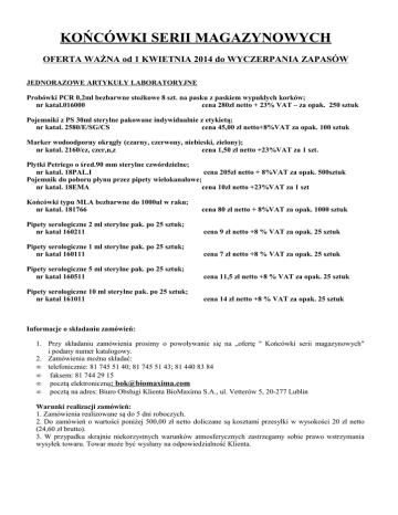 KOŃCÓWKI SERII MAGAZYNOWYCH OFERTA WAŻNA od 1 KWIETNIA 2014 do WYCZERPANIA ZAPASÓW JEDNORAZOWE ARTYKUŁY LABORATORYJNE Probówki PCR 0,2ml bezbarwne stożkowe 8 szt. na pasku z paskiem wypukłych korków; nr katal.016000 cena 280zł netto + 23% VAT – za opak. 250 sztuk Pojemniki z PS 30ml sterylne pakowane indywidualnie z etykietą; nr katal. 2580/E/SG/CS cena 45,00 zł netto+8%VAT za opak. 100 sztuk Marker wodoodporny okrągły (czarny, czerwony, niebieski, zielony); nr katal. 2160/cz, czer,n,z cena 1,50 zł netto +23%VAT za 1 szt. Płytki Petriego o śred.90 mm sterylne czwórdzielne; nr katal. 18PAL.I cena 205zl netto + 8%VAT za opak. 500sztuk Pojemnik do poboru płynu przez pipety wielokanałowe; nr katal. 18EMA cena 10zł netto +23%VAT za 1 szt Końcówki typu MLA bezbarwne do 1000ul w raku; nr katal. 181766 cena 80 zł netto + 8%VAT za opak. 1000 sztuk Pipety serologiczne 2 ml sterylne pak. po 25 sztuk; nr katal 160211 cena 9 zł netto +8 % VAT za opak. 25 sztuk Pipety serologiczne 1 ml sterylne pak. po 25 sztuk; nr katal 160111 cena 7 zł netto +8 % VAT za opak. 25 sztuk Pipety serologiczne 5 ml sterylne pak. po 25 sztuk; nr katal 160511 cena 11,5 zł netto +8 % VAT za opak. 25 sztuk Pipety serologiczne 10 ml sterylne pak. po 25 sztuk; nr katal 161011 cena 14 zł netto +8 % VAT za opak. 25 sztuk Informacje o składaniu zamówień: 1. Przy składaniu zamówienia prosimy o powoływanie się na „ofertę " Końcówki serii magazynowych" i podany numer katalogowy. 2. Zamówienia można składać: • telefonicznie: 81 745 51 40; 81 745 51 43; 81 440 83 84 • faksem: 81 744 29 15 • pocztą elektroniczną: [email protected] • pocztą na adres: Biuro Obsługi Klienta BioMaxima S.A., ul. Vetterów 5, 20-277 Lublin Warunki realizacji zamówień: 1. Zamówienia realizowane są do 5 dni roboczych. 2. Do zamówień o wartości poniżej 500,00 zł netto doliczane są kosztami przesyłki w wysokości 20 zł netto (24,60 zł brutto). 3. W przypadku skrajnie niekorzystnych warunków atmosferycznych zastrzegamy sobie prawo wstrzymania wysyłek towaru. Towar może być wysłany na odpowiedzialność Klienta.