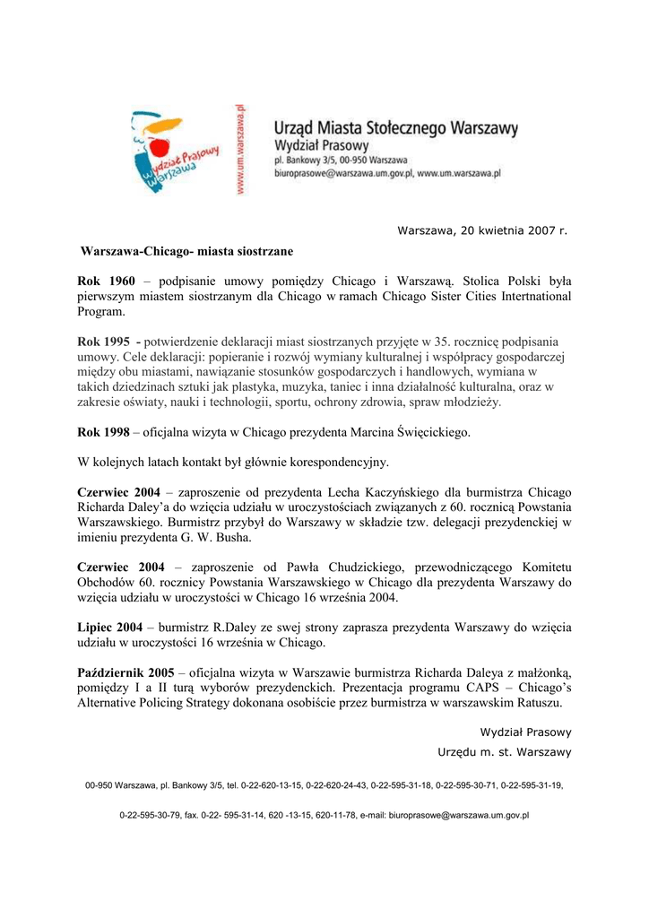 Warszawa, 20 kwietnia 2007 r. Warszawa-Chicago- miasta siostrzane Rok 1960 – podpisanie umowy pomiędzy Chicago i Warszawą. Stolica Polski była pierwszym miastem siostrzanym dla Chicago w ramach Chicago Sister Cities Intertnational Program. Rok 1995 - potwierdzenie deklaracji miast siostrzanych przyjęte w 35. rocznicę podpisania umowy. Cele deklaracji: popieranie i rozwój wymiany kulturalnej i współpracy gospodarczej między obu miastami, nawiązanie stosunków gospodarczych i handlowych, wymiana w takich dziedzinach sztuki jak plastyka, muzyka, taniec i inna działalność kulturalna, oraz w zakresie oświaty, nauki i technologii, sportu, ochrony zdrowia, spraw młodzieŜy. Rok 1998 – oficjalna wizyta w Chicago prezydenta Marcina Święcickiego. W kolejnych latach kontakt był głównie korespondencyjny. Czerwiec 2004 – zaproszenie od prezydenta Lecha Kaczyńskiego dla burmistrza Chicago Richarda Daley’a do wzięcia udziału w uroczystościach związanych z 60. rocznicą Powstania Warszawskiego. Burmistrz przybył do Warszawy w składzie tzw. delegacji prezydenckiej w imieniu prezydenta G. W. Busha. Czerwiec 2004 – zaproszenie od Pawła Chudzickiego, przewodniczącego Komitetu Obchodów 60. rocznicy Powstania Warszawskiego w Chicago dla prezydenta Warszawy do wzięcia udziału w uroczystości w Chicago 16 września 2004. Lipiec 2004 – burmistrz R.Daley ze swej strony zaprasza prezydenta Warszawy do wzięcia udziału w uroczystości 16 września w Chicago. Październik 2005 – oficjalna wizyta w Warszawie burmistrza Richarda Daleya z małŜonką, pomiędzy I a II turą wyborów prezydenckich. Prezentacja programu CAPS – Chicago’s Alternative Policing Strategy dokonana osobiście przez burmistrza w warszawskim Ratuszu. Wydział Prasowy Urzędu m. st. Warszawy 00-950 Warszawa, pl. Bankowy 3/5, tel. 0-22-620-13-15, 0-22-620-24-43, 0-22-595-31-18, 0-22-595-30-71, 0-22-595-31-19, 0-22-595-30-79, fax. 0-22- 595-31-14, 620 -13-15, 620-11-78, e-mail: [email protected]