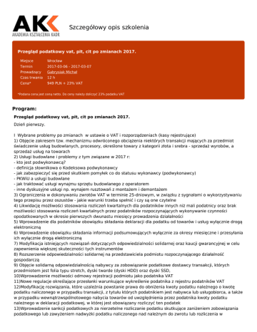 Szczegółowy opis szkolenia Przegląd podatkowy vat, pit, cit po zmianach 2017. Miejsce Wrocław Termin 2017-03-06 - 2017-03-07 Prowadzący Gabrysiak Michał Czas trwania 12 h Cena* 949 PLN + 23% VAT *Podana cena jest ceną netto. Do ceny należy doliczyć 23% podatku VAT Program: Przegląd podatkowy vat, pit, cit po zmianach 2017. Dzień pierwszy. I Wybrane problemy po zmianach w ustawie o VAT i rozporządzeniach (kasy rejestrujące) 1) Objęcie zakresem tzw. mechanizmu odwróconego obciążenia niektórych transakcji mających za przedmiot świadczenie usług budowlanych, procesory, określone towary z kategorii złota i srebra - sprzedaż wyrobów, a sprzedaż usług na towarach 2) Usługi budowlane i problemy z tym związane w 2017 r: - kto jest podwykonawcą? - definicja słownikowa o Kodeksowa podwykonawcy - jak zabezpieczyć się przed skutkiem pomyłek co do statusu wykonawcy (podwykonawcy) - PKWiU a usługi budowlane - jak traktować usługi wynajmu sprzętu budowlanego z operatorem - inne dyskusyjne usługi np. wynajem rusztowań z montażem i demontażem 3) Ograniczenia w dokonywaniu zwrotów VAT w terminie 25-dniowym, w związku z sygnałami o wykorzystywaniu tego przepisu przez oszustów - jakie warunki trzeba spełnić i czy są one czytelne 4) Likwidację możliwości stosowania rozliczeń kwartalnych dla podatników innych niż mali podatnicy oraz brak możliwości stosowania rozliczeń kwartalnych przez podatników rozpoczynających wykonywanie czynności opodatkowanych w okresie pierwszych dwunastu miesięcy prowadzenia działalności 5) Wprowadzenie dla podatników obowiązku składania deklaracji dla podatku od towarów i usług wyłącznie drogą elektroniczną 6) Wprowadzenie obowiązku składania informacji podsumowujących wyłącznie za okresy miesięczne i przesyłania ich wyłącznie drogą elektroniczną 7) Modyfikacja istniejących rozwiązań dotyczących odpowiedzialności solidarnej oraz kaucji gwarancyjnej w celu zapewnienia większej skuteczności tych instrumentów 8) Rozszerzenie odpowiedzialności solidarnej na przedstawiciela podmiotu rozpoczynającego działalność gospodarczą 9) Objęcie solidarną odpowiedzialnością nabywcy za zobowiązanie podatkowe dostawcy transakcji, których przedmiotem jest folia typu stretch, dyski twarde (dyski HDD) oraz dyski SSD, 10)Wprowadzenie możliwości odmowy rejestracji podmiotu jako podatnika VAT 11)Nowe regulacje określające przesłanki warunkujące wykreślenie podatnika z rejestru podatników VAT 12)Modyfikację rozwiązania, które uzależnia powstanie prawa do obniżenia kwoty podatku należnego o kwotę podatku naliczonego w przypadku transakcji, z tytułu których podatnikiem jest nabywca lub usługobiorca, a także w przypadku wewnątrzwspólnotowego nabycia towarów od uwzględnienia przez podatnika kwoty podatku należnego w deklaracji podatkowej, w której jest obowiązany rozliczyć ten podatek 13)Wprowadzenie sankcji podatkowych za nierzetelne rozliczanie podatku skutkujące zaniżeniem zobowiązania podatkowego lub zawyżeniem nadwyżki podatku naliczonego nad należnym do zwrotu lub rozliczenia w następnych okresach rozliczeniowych lub zwrotu podatku oraz likwidacja sankcji wynikającej z przepisów dotyczących ulgi na złe długi. 14)Stawki podatkowe - przedłużenie bytu stawki 23% i 8% 15)Podwyższenie limitu do zwolnienia podmiotowego o problemy z przepisami przejściowymi 16)Pozostałe zmiany w podatku od towarów i usług 17)Rozporządzenie w sprawie kas rejestrujących-co zmieniono Dzień drugi. II Wybrane problemy po zmianach w PIT CIT na 2017 r 1) Ustawa z dnia 13 kwietnia 2016 r. o zmianie ustawy o podatku dochodowym od osób fizycznych, ustawy o podatku dochodowym od osób prawnych oraz ustawy o swobodzie działalności gospodarczej (Dz. U. poz. 780) - od 1 stycznia 2017 a) obowiązek regulowania płatności przekraczających 15.000 zł w sposób bezgotówkowy (było 15.000 Euro) b) co to jest jednorodna transakcja? c) korekta kosztów uregulowanych niezgodnie z zasadą opisaną w punkcie a d) pomniejszanie odpisów amortyzacyjnych o nie zapłacone zgodnie z przepisami wydatki na nabycie (wytworzenie) środka trwałego e) zasady korygowania kosztów przy zmianie formy opodatkowania f) czy można zapłatę gotówkową zamienić na przelew? g) przepisy przejściowe 2) Ustawa z dnia 5 września 2016 r o zmianie ustawy o podatku dochodowym od osób fizycznych oraz ustawy o podatku dochodowym od osób prawnych (obniżenie opodatkowania do 15%) a) obniżenie stawki podatku dochodowego od osób prawnych do 15% dla małych podatników oraz podatników rozpoczynających działalność gospodarczą b) wykluczenia z prawa do stosowania obniżonej stawki c) katalog przypadków w których dochód podatnika podlegającego ograniczonemu obowiązkowi podatkowemu uznaje się za uzyskany na terytorium RP - rozszerzenie przypadków poboru podatku u źródła d) ustalanie przychodu z tytułu objęcia udziałów (akcji) w spółce w zamian za wkład niepieniężny wg nowych zasad e) ograniczenie tzw. europejskiej wymiany udziałów 3) ustawa z dnia 4 listopada 2016 r. o zmianie niektórych ustaw określających warunki prowadzenia działalności innowacyjnej (Dz. U. poz. 1933) - rozszerzenie ulgi z tytułu działalności innowacyjnej. 4) Ustawa z dnia 29 listopada 2016 o zmianie ustawy o podatku dochodowym od osób fizycznych, ustawy o podatku dochodowym od osób prawnych oraz ustawy o zmianie ustawy – Ordynacja podatkowa oraz niektórych innych ustaw a) Zmiana kwoty wolnej od podatku i inne zasady naliczania zaliczek w działalności gospodarczej w 2017 r-updf b) likwidacja zwolnienia z podatku dochodowego niektórych zamkniętych funduszy inwestycyjnych-updp III Odpowiedzi na pytania Dla kogo: Adresatami szkolenia są księgowi oraz pracownicy pracujący w działach finansowo – księgowych firm, którzy mają w swoim zakresie obowiązków rozliczenie podatkowe. Cel: Celem szkolenia jest przeds
