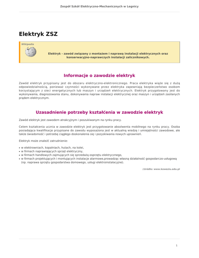 Zespół Szkół Elektryczno-Mechanicznych w Legnicy Elektryk ZSZ Wikipedia Elektryk - zawód związany z montażem i naprawą instalacji elektrycznych oraz konserwacyjno-naprawczych instalacji zalicznikowych. Informacje o zawodzie elektryk Zawód elektryk przypisany jest do obszaru elektryczno-elektronicznego. Praca elektryka wiąże się z dużą odpowiedzialnością, ponieważ czynności wykonywane przez elektryka zapewniają bezpieczeństwo osobom korzystającym z sieci energetycznych lub maszyn i urządzeń elektrycznych. Elektryk przygotowany jest do wykonywania, diagnozowania stanu, dokonywania napraw instalacji elektrycznej oraz maszyn i urządzeń zasilanych prądem elektrycznym. Uzasadnienie potrzeby kształćenia w zawodzie elektryk Zawód elektryk jest zawodem atrakcyjnym i poszukiwanym na rynku pracy. Celem kształcenia ucznia w zawodzie elektryk jest przygotowanie absolwenta mobilnego na rynku pracy. Osoba posiadająca kwalifikacje przypisane do zawodu wyposażona jest w aktualną wiedzę i umiejętności zawodowe, ale także świadomość i potrzebę ciągłego doskonalenia się i pozyskiwania nowych uprawnień. Elektryk może znaleźć zatrudnienie: ● ● ● ● w elektrowniach, kopalniach, hutach, na kolei, w firmach naprawiających sprzęt elektryczny, w firmach handlowych zajmujących się sprzedażą osprzętu elektrycznego, w firmach projektujących i montujących instalacje alarmowe,prowadząc własną działalność gospodarczo-usługową (np. naprawa sprzętu gospodarstwa domowego, usługi elektroinstalacyjne). //źródło: www.koweziu.edu.pl 1