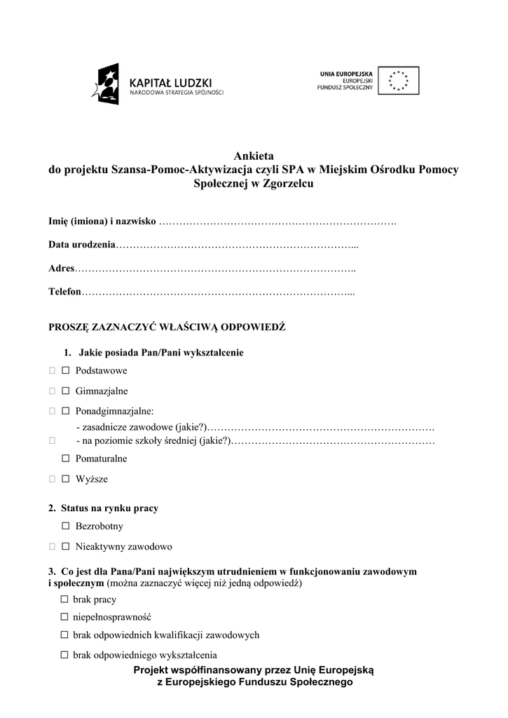Ankieta do projektu Szansa-Pomoc-Aktywizacja czyli SPA w Miejskim Ośrodku Pomocy Społecznej w Zgorzelcu Imię (imiona) i nazwisko ……………………………………………………………. Data urodzenia……………………………………………………………... Adres……………………………………………………………………….. Telefon……………………………………………………………………... PROSZĘ ZAZNACZYĆ WŁAŚCIWĄ ODPOWIEDŹ 1. Jakie posiada Pan/Pani wykształcenie □ □ □ Gimnazjalne Ponadgimnazjalne: - zasadnicze zawodowe (jakie?)…………………………………………………………. - na poziomie szkoły średniej (jakie?)…………………………………………………… Podstawowe □ □ Pomaturalne Wyższe 2. Status na rynku pracy □ □ Bezrobotny Nieaktywny zawodowo 3. Co jest dla Pana/Pani największym utrudnieniem w funkcjonowaniu zawodowym i społecznym (można zaznaczyć więcej niż jedną odpowiedź) □ brak pracy □ niepełnosprawność □ brak odpowiednich kwalifikacji zawodowych □ brak odpowiedniego wykształcenia Projekt współfinansowany przez Unię Europejską z Europejskiego Funduszu Społecznego □„brak siły przebicia” (np. nieśmiałość, brak umiejętności autoprezentacji, mała operatywność) □ brak wiary/obniżona wiara we własne możliwości i ponowne zatrudnienie □ niska samoocena/niskie poczucie własnej wartości □ zniechęcenie (mała motywacja) □ wiek □ trudności w zapewnieniu opieki nad dzieckiem do lat 7 lub osobami zależnymi (np. rodzice) □ inne, jakie? ………………… 4. Co skłoniło Pana / Panią do udziału w projekcie? □ własna motywacja □ pracownik socjalny □ inne – jakie?......................................................................... 5. Czego oczekuje Pan/Pani po udziale w projekcie (można zaznaczyć więcej niż jedną odpowiedź) □ odzyskania wiary we własne siły i możliwości, wyzwolenia indywidualnej aktywności □ wzrostu samooceny, przywrócenia lub zwiększenia poczucia własnej wartości □ wzrostu aktywności społecznej/motywacji do działania □ nabycia/podwyższenia/zmiany kwalifikacji zawodowych, zwiększenia umiejętności poruszania się po rynku pracy □ poprawy relacji i bardziej otwartej współpracy z pracownikiem socjalnym □ inne - ......................................................................... 6. W jakich wymienionych niżej formach wsparcia realizowanych w projekcie w ramach aktywnej integracji chciałby Pan/Pani uczestniczyć: terapia psychologiczna, rodzinna lub psychospołeczna dla osób lub rodzin □ Tak □ Nie □ Tak □ Nie grupa samopomocowa indywidualne poradnictwo i wsparcie psychologa Projekt współfinansowany przez Unię Europejską z Europejskiego Funduszu Społecznego □ Tak □ Nie treningi kompetencji i umiejętności społecznych m. in. w temacie: asertywność, style komunikowania się, reagowanie w sytuacjach trudnych □ Tak □ Nie w tym trening- warsztaty kreowania własnego wizerunku □ Tak □ Nie warsztaty doradztwa zawodowego z nauką komputera i internetu □ Tak □ Nie Jeśli tak jaki poziom: podstawowy średniozaawansowany □ □ warsztaty dla rodziców □ Tak □ Nie kursy języka obcego □ Tak □ Nie Jeśli tak prosimy wskazać język i poziom nauczania np. podstawowy, średniozaawansowany) ………………………………………………………………………………………………… ………………………………………………………………………………………………… kursy/szkolenia zawodowe □ Tak □ Nie Jeżeli tak jakie: ………………………………………………………………………………………………………… ………………………………………………………………………………………………………… ………………………………………………………………………………………………………… ……………………………………………………………………………………………………… Projekt współfinansowany przez Unię Europejską z Europejskiego Funduszu Społecznego uzupełnienie wykształcenia na poziomie podstawowym, gimnazjalnym, ponadgimnazjalnym lub policealnym: □ Tak □ Nie Jeżeli tak na jakim poziomie …………………………………………………………………………................................................ ................................................................................................................................................................ praktyki/staże dla osób w wieku 15-30 lat □ Tak □ Nie 7. Czy oferta programowa projektu w zakresie aktywnej integracji spełnia Pana/Pani oczekiwania: □ tak □ nie 8. Jeżeli nie, to z jakiej innej formy wsparcia chciałby Pan/Pani skorzystać w ramach projektu Szansa-Pomoc-Aktywizacja czyli SPA w Miejskim Ośrodku Pomocy Społecznej w Zgorzelcu ………………………………………………………………………………………………………… ………………………………………………………………………………………………………… ………………………………………………………………………………………………………… Zgorzelec, dnia……............... ............................................................................ czytelny podpis Dziękujemy za wypełnienie ankiety. Projekt współfinansowany przez Unię Europejską z Europejskiego Funduszu Społecznego