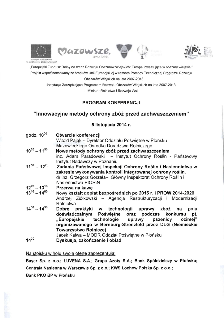 5 listopada 2014 r. godz. 10.00 Centrum Edukacyjno - Konferencyjne Mazowieckiego Osrodka Doradztwa Rolniczego Oddziat