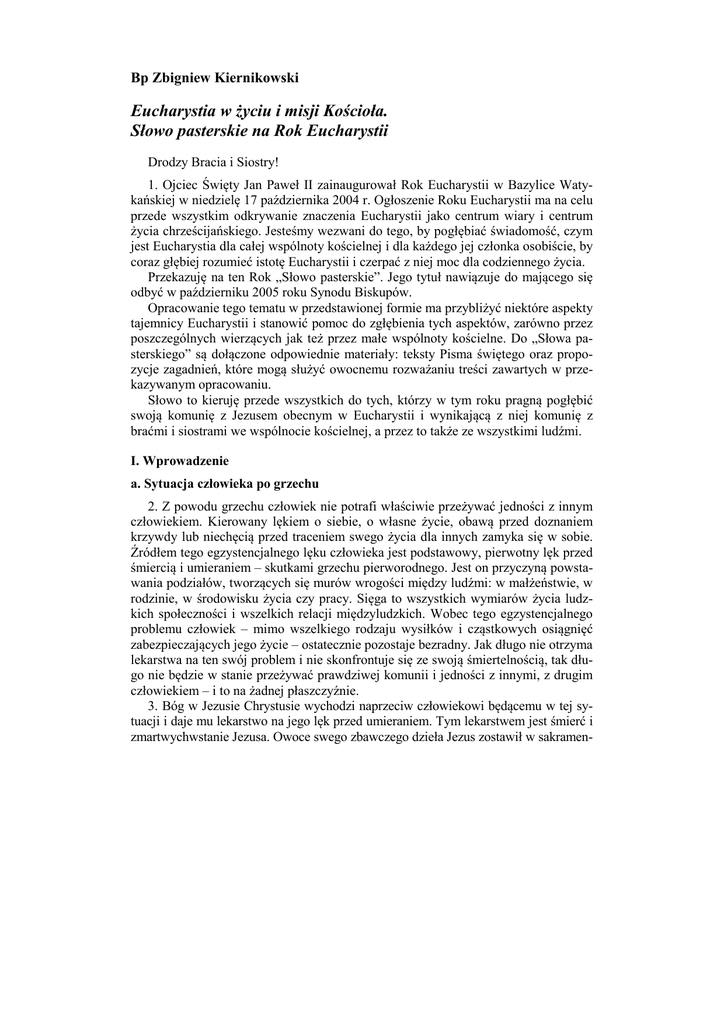 Bp Zbigniew Kiernikowski Eucharystia w życiu i misji Kościoła. Słowo pasterskie na Rok Eucharystii Drodzy Bracia i Siostry! 1. Ojciec Święty Jan Paweł II zainaugurował Rok Eucharystii w Bazylice Watykańskiej w niedzielę 17 października 2004 r. Ogłoszenie Roku Eucharystii ma na celu przede wszystkim odkrywanie znaczenia Eucharystii jako centrum wiary i centrum życia chrześcijańskiego. Jesteśmy wezwani do tego, by pogłębiać świadomość, czym jest Eucharystia dla całej wspólnoty kościelnej i dla każdego jej członka osobiście, by coraz głębiej rozumieć istotę Eucharystii i czerpać z niej moc dla codziennego życia. Przekazuję na ten Rok „Słowo pasterskie”. Jego tytuł nawiązuje do mającego się odbyć w październiku 2005 roku Synodu Biskupów. Opracowanie tego tematu w przedstawionej formie ma przybliżyć niektóre aspekty tajemnicy Eucharystii i stanowić pomoc do zgłębienia tych aspektów, zarówno przez poszczególnych wierzących jak też przez małe wspólnoty kościelne. Do „Słowa pasterskiego” są dołączone odpowiednie materiały: teksty Pisma świętego oraz propozycje zagadnień, które mogą służyć owocnemu rozważaniu treści zawartych w przekazywanym opracowaniu. Słowo to kieruję przede wszystkich do tych, którzy w tym roku pragną pogłębić swoją komunię z Jezusem obecnym w Eucharystii i wynikającą z niej komunię z braćmi i siostrami we wspólnocie kościelnej, a przez to także ze wszystkimi ludźmi. I. Wprowadzenie a. Sytuacja człowieka po grzechu 2. Z powodu grzechu człowiek nie potrafi właściwie przeżywać jedności z innym człowiekiem. Kierowany lękiem o siebie, o własne życie, obawą przed doznaniem krzywdy lub niechęcią przed traceniem swego życia dla innych zamyka się w sobie. Źródłem tego egzystencjalnego lęku człowieka jest podstawowy, pierwotny lęk przed śmiercią i umieraniem – skutkami grzechu pierworodnego. Jest on przyczyną powstawania podziałów, tworzących się murów wrogości między ludźmi: w małżeństwie, w rodzinie, w środowisku życia czy pracy. Sięga to wszystkich wymiarów życia ludzkich społeczności i wszelkich relacji międzyludzkich. Wobec tego egzystencjalnego problemu człowiek – mimo wszelkiego rodzaju wysiłków i cząstkowych osiągnięć zabezpieczających jego życie – ostatecznie pozostaje bezradny. Jak długo nie otrzyma lekarstwa na ten swój problem i nie skonfrontuje się ze swoją śmiertelnością, tak długo nie będzie w stanie przeżywać prawdziwej komunii i jedności z innymi, z drugim człowiekiem – i to na żadnej płaszczyźnie. 3. Bóg w Jezusie Chrystusie wychodzi naprzeciw człowiekowi będącemu w tej sytuacji i daje mu lekarstwo na jego lęk przed umieraniem. Tym lekarstwem jest śmierć i zmartwychwstanie Jezusa. Owoce swego zbawczego dzieła Jezus zostawił w sakramen- 36 Bp Zbigniew Kiernikowski tach, szczególnie w Eucharystii. Często jednak nie w pełni rozumiemy, co to znaczy osobiście dla każdego z nas ochrzczonych, jakie to ma znaczenie dla naszego życia. Dlaczego potrzebujemy przemiany nas samych? Co wnosi w nasze życie ten pokarm, który daje Jezus, i którym jest On sam? Jaki związek ma nasze życie z darem Eucharystii? Czym jest komunia jako owoc Eucharystii? Spróbujemy to sobie przybliżyć, dotykając dynamicznego aspektu sakramentu Eucharystii. Żywa obecność Jezusa w Eucharystii sprawia bowiem, że kiedy rozumiemy, jakim jest darem i jaką rzeczywistość zawiera w sobie, to może w nas spełniać się to, co spełniło się w Nim i to, co zawarł w tym sakramencie – a mianowicie przechodzenie ze śmierci do życia. b. Eucharystia sakramentem działania Boga 4. Kiedy uprzytamniamy sobie prawdę, że Eucharystia jest centrum wiary i centrum życia chrześcijańskiego, warto zwrócić uwagę na dynamiczny aspekt tego Sakramentu. Na ogół jest on mało uświadomiony i dlatego w niedostatecznej mierze obecny w naszym chrześcijańskim życiu. W soborowej Konstytucji o Liturgii możemy zauważyć przeniesienie akcentu z przeżywania i patrzenia na Eucharystię w sposób statyczny (czyli przede wszystkim postrzegania jej jako sakramentu obecności Chrystusa w konsekrowanym chlebie) na jej dynamikę, obecną w strukturze całej celebracji Eucharystii (zob. KL 7). Wyrazem dynamiki Eucharystii jest uobecnianie działania Chrystusa, mającego moc przemieniać i kształtować nasze życie. Traktowanie sakramentu Eucharystii tylko jako przedmiotu adoracji oderwanej od celebracji niekiedy może czynić go odległym od konkretów naszego życia, albo wręcz nieobecnym w codziennych wydarzeniach; zredukowanym do przebywania w kościele, w tabernakulum, a czasami przez chwilę i w nas, kiedy przyjmiemy Komunię świętą. Tymczasem w Eucharystii Jezus daje nam siebie, umożliwiając przemianę naszego życia w takie życie z Nim, że żyjemy już nie my, ale żyje w nas Chrystus (por. Ga 2,20). W tym sakramencie zawarł On bowiem tajemnicę swej męki, śmierci i zmartwychwstania oraz dar Ducha Świętego na przebaczenie grzechów, dla spełnienia Nowego Przymierza i tworzenia jedności między ludźmi. Eucharystia zatem jest lekarstwem na ów zasadniczy problem człowieka, jakim jest zaburzona relacja do śmierci i życia. Jako dynamika umierania i zmartwychwstawania oferuje człowiekowi drogę, którą przeszedł Jezus i którą jest On sam (zob. J 14,6). Jest to droga wyzwolenia od siebie (od „konieczności” obrony siebie) prowadząca do życia w wolności i czynienia daru z siebie. Tym samym moc Jezusa uzdalnia człowieka do życia w komunii z Bogiem i innymi ludźmi. Jezus w Eucharystii daje siebie, aby uwolnić tych wszystkich, którzy całe życie przez bojaźń śmierci podlegli byli niewoli (Hbr 2,15), oraz aby z nas, którzy jesteśmy rozproszeni i podzieleni z powodu szukania siebie (swego dobra), tworzyć wspólnotę, swoje Ciało, w którym poszczególne członki żyją już nie dla siebie, a c